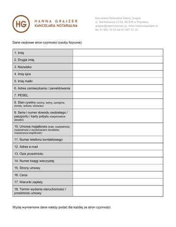 Kancelaria Notarialna Hanny Grajzer ul. Sienkiewicza 21/3a, 60816 w Poznaniu [email protected], www.notariuszgrajzer.pl tel. 61 662 74 53 lub 61 847 31 33 Dane osobowe stron czynności (osoby fizyczne): 1. Imię 2. Drugie imię 3. Nazwisko 4. Imię ojca 5. Imię matki 6. Adres zamieszkania / zameldowania 7. PESEL 8. Stan cywilny (wolna, wolny, zamężna, żonaty, wdowa, wdowiec) 9. Seria i numer dowodu osobistego / paszportu / karty pobytu (niepotrzebne skreślić) 10. Umowa majątkowa (brak, rozdzielność, rozdzielność z wyrównaniem dorobków, rozszerzona wspólność) 11. Numer telefonu kontaktowego 12. Adres email 13. Opis przedmiotu 14. Numer księgi wieczystej 15. Strony umowy 16. Cena 17. Warunki zapłaty 18. Termin wydania nieruchomości / przedmiotu umowy Wyżej wymienione dane należy podać dla każdej ze stron czynności.