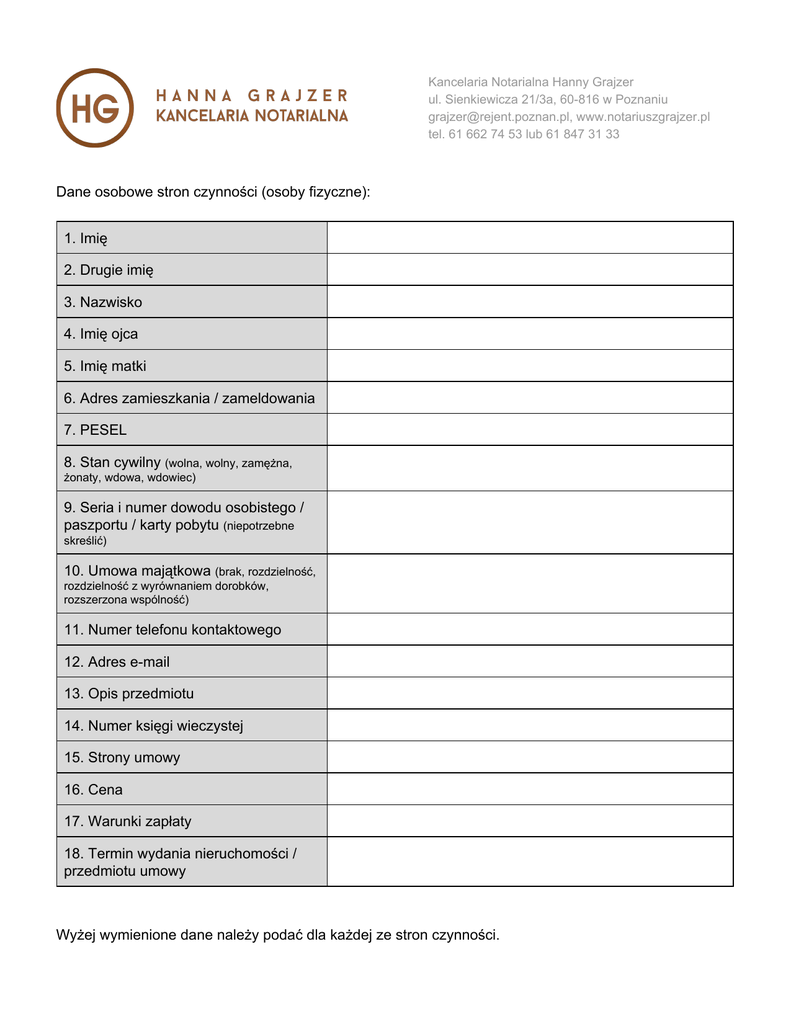 Dane osobowe stron czynności (osoby fizyczne): 1. Imię 2. Drugie