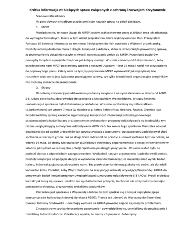 Krótka informacja nt bieżących spraw związanych z ochroną i rozwojem Krzyżanowic Szanowni Mieszkańcy W paru słowach chciałbym przedstawić stan naszych spraw na dzień dzisiejszy. 1. MPZP Wygląda na to, że nasze Uwagi do MPZP zostały zaakceptowane przez p.Wójta i trwa ich adaptacja do wymogów formalnych. Bierze w tym udział projektantka, która wykonywała ten Plan. Przesyłałem Państwu 10 kwietnia informacje na ten temat i dołączyłem do nich ustalenia z Wójtem i projektantką. Niestety wczoraj dostałem maila z Urzędu Gminy od p.Adamek, która ze strony Wójta prowadzi tę sprawę, że praktycznie nic dotąd nie ruszyło w kwestii wprowadzania zmian do MPZP. Przesyłanie papierów pomiędzy Urzędem a projektantką trwa już kolejny miesiąc. W sumie czekamy od 6 stycznia na to, żeby przedstawiono nam MPZP poprawiony zgodnie z naszymi Uwagami – jest 15 maja i nadal nie przystąpiono do poprawy tego planu. Zależy nam na tym, by poprawione MPZP wprowadzić jak najszybciej. Nie rozumiem więc czy to jest świadome przeciąganie sprawy, czy tylko nieudolność organizacyjna urzędników. Nie możemy czekać w nieskończoność. 2. Ekrany W ostaniej informacji przedstawiałem problemy związane z naszymi staraniami o ekrany od AOW i S-5. Udało się w końcu doprowadzić do spotkania z Marszałkiem Województwa. W ciągu kwietnia umówione już spotkanie było kilkakrotnie przekładane. Wreszcie spotkaliśmy się z Marszałkiem (p.Jurkowlaniec) we wtorek 7 maja (w składzie p.p. Sołtys Bebłocińska, Bednarz, Rawiak, Grzesiak i ja). Przedstawiliśmy sprawę ekranów argumentując konieczność interwencji potrzebą ponownego przeprowadzenia badań hałasu oraz ponownym wykonaniem prognozy oddziaływania na środowisko tym razem uwzględniającą sumaryczne oddziaływanie AOW i S-5. Na koniec tego spotkania Marszałek obiecał dowiedzieć się od swoich urzędników jak sprawa wygląda z jego strony i po zapoznaniu zadeklarował chęć spotkania w szerszym gronie. Już na drugi dzień zadzwonił do p.Sołtys i umówił spotkanie tydzień później na wtorek 14 maja. Ze strony Marszałka był p.Chlebosz i dyrektorzy departamentów, z naszej strony byliśmy w składzie jak tydzień wcześniej plus p.Wójt. Spotkanie przebiegło pozytywnie. W sumie widać było, że podeszli do nas z odpowiednim zaangażowaniem. Wysłuchali naszych argumentów i zadeklarowali pomoc. Niestety umyli ręce od podjęcia decyzji o wykonaniu ekranów tłumacząc, że musieliby mieć wyniki badań hałasu, które wskazują na przekroczenie norm. Bez przekroczenia nie mogą jakoby nic zrobić, ale doradzili konkretne kroki. Poradzili, żeby Wójt z Radnymi na sesji podjęli uchwałę wzywającą Wojewodę i GDKiA do ponownych badań i nowej prognozy uwzględniającej sumaryczne oddziaływanie S-5 i AOW. Prosili o bieżący kontakt jak toczą się sprawy. Jeżeli to nie są obietnice bez pokrycia, to chociaż nie otrzymaliśmy decyzji o postawieniu ekranów, przynajmniej zyskaliśmy sojuszników. Potrzebne jest spotkanie z Wojewodą i dobrze by było spotkać się z nim jak najszybciej (jego dotyczy sprawa kuriozalnych decyzji dyrektora RDOŚ). Trzeba też uderzyć do Warszawy do Generalnej Dyrekcji Ochrony Środowiska – oni mogą wymusić na GDKiA poważne zajęcie się naszymi problemami. Z naszej strony spotkanie oceniamy pozytywnie - powiedzieliśmy to, co mieliśmy do powiedzenia i zrobiliśmy to bardzo dobrze. Z deklaracji wynika, że mamy ich poparcie. Zobaczymy. Na dzisiaj wygląda, że mamy dużo do zrobienia: sesja Rady Gminy jest 29 maja. Radni muszą dostać tekst uchwały do 22 maja. Trzeba tę uchwałę napisać, więc to kwestia kilku najbliższych dni. Wójt zadeklarował, że to zrobi, mam nadzieję, że zrobi to szybko. P.Rawiak znalazł dobrą firmę wykonującą badania hałasu. Czekamy na materiały z badań, które zostały wykonane przez GDKiA żeby dowiedzieć się czy nie zostały zrobione wadliwie. W zaopiniowaniu tego materiału może nam pomóc również ta firma. Firma chce 1500,- za niezależne badania hałasu dla nas. Mogą być one ważnym argumentem w sprawie uzyskania ekranów na AOW i S-5. Mówili o tym też w Urzędzie Marszałkowskim. Zlecając te badania we własnym zakresie będziemy mieli wpływ na to gdzie będą źródła pomiarów (niektórzy mieszkańcy zgłaszają, że przy ich domach, które są nawet w okolicy ul.Jaśminowej hałas jakby jest większy – może to wynikać z tego, że AOW biegnie na znacznej wysokości, a domy w Krzyżanowicach jedne są wyżej a inne niżej położone), w jaką pogodę będą robione (kierunek wiatru ma wpływ na roznoszenie się hałasu) i w jakim okresie czasu (ma znaczenie czy pomiary są robione w wakacje czy w okresie największych obciążeń). Potrzebujemy zebrać 1500,- na te badania, więc gdyby ktoś miał pomysł jak i chciał to zrobić – przydałaby się pomoc. Mam nadzieję, że jako mieszkańcy podzielacie Państwo to przekonanie o celowości wykonania tych badań? Proszę o opinie i deklaracje pomocy, również finansowej. Jeden może dać więcej, drugi mniej, ale wspólnie uzbieramy ile potrzeba. Pozdrawiam Jacek Wiszniowski