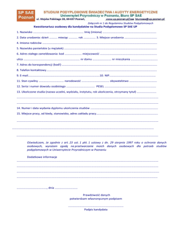 Załącznik nr 1 do Regulaminu Studiów Podyplomowych Kwestionariusz osobowy dla kandydatów na Studia Podyplomowe SP SAE UP 1. Nazwisko .............................................................. Imię (imiona) .................................................................. 2. Data urodzenia: dzień .......... miesiąc ........... rok ............... 3. Miejsce urodzenia ........................................ 4. Imiona rodziców ............................................................................................................................................. 5. Nazwisko panieńskie (u mężatek) .................................................................................................................. 6. Adres stałego zameldowania: kod ..................... miejscowość ...................................................................... ulica ..................................................................... nr domu ....................... nr mieszkania ................................. 7. Adres do korespondencji (kod!) ..................................................................................................................... 8. Telefon kontaktowy........................................................................................................................................ 9. E-mail........................................................................................10. NIP......................................................... 11. Stan cywilny ............................... narodowość .................................. obywatelstwo .................................. 12. Seria i numer dowodu osobistego ................................... PESEL ............................................................... 13. Ukończone studia (nazwa uczelni, wydziału, instytutu, rok ukończenia, otrzymany tytuł) ........................ .............................................................................................................................................................................. .............................................................................................................................................................................. 14. Numer i data wydania dyplomu ukończenia studiów ................................................................................... 15. Miejsce pracy, od kiedy, stanowisko, adres zakładu pracy............................................................................ .............................................................................................................................................................................. .............................................................................................................................................................................. .............................................................................................................................................................................. Oświadczam, że zgodnie z art. 23 ust. 1 pkt. 1 ustawy z dn. 29 sierpnia 1997 roku o ochronie danych osobowych, wyrażam zgodę na przetwarzanie moich danych osobowych dla potrzeb studiów podyplomowych w Uniwersytecie Przyrodniczym w Poznaniu Dodatkowe informacje .............................................................................................................................................................................. .............................................................................................................................................................................. ............................................................................................................................................................................... ............................................................................................................................................................................. ....................................., dnia ............................ Prawdziwość danych potwierdzam własnoręcznym podpisem .................................................................... Podpis kandydata