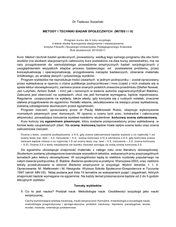 Dr Tadeusz Sozañski METODY I TECHNIKI BADAÑ SPO£ECZNYCH (MiTBS I i II) Program kursu dla II roku socjologii, 3-letnie studia licencjackie stacjonarne i niestacjonarne Instytut Filozofii i Socjologii Uniwersytetu Pedagogicznego Krakowie Rok akadem icki 2010/2011 Kurs Metod i technik badañ spo³ecznych, prowadzony wed³ug tego samego programu dla obu form studiów (na studiach stacjonarnych ca³oroczny kurs podzielono na dwa kursy semestralne), ma na celu przygotowanie do samodzielnego prowadzenia empirycznych badañ socjologicznych z uwzglêdnieniem wszystkich etapów procesu badawczego: od postawienia problemu, przez konceptualizacjê i operacjonalizacjê, przygotowanie narzêdzi badawczych, zbieranie materia³u Ÿród³owego, po analizê danych i prezentacjê wyników. Program wyk³adów nie reprodukuje treœci zawartych w jednym podrêczniku – zosta³ opracowany przez wyk³adowcê w oparciu o ró¿ne publikacje podrêcznikowe i inne (czêœæ z nich znalaz³a siê w spisie lektur obowi¹zkowych), zarówno prace znanych polskich znawców przedmiotu (Stefan Nowak, Jan Lutyñski, Antoni Su³ek i inni) jak i cenionych w œwiecie autorów zagranicznych(Earl Babbie). Zalecana jest obecnoœæ na wyk³adach; choæ nie jest formalnie wymagana, bêdzie rejestrowana. Regularne uczêszczanie na wyk³ady, tak¿e wtedy, gdy korzysta siê z cudzych notatek, znacznie u³atwia przygotowanie do egzaminu. Notatki w³asne, aktualizowane na bie¿¹co przez wyk³adowcê, zostan¹ udostêpnione s³uchaczom przed egzaminem. Program æwiczeñ, opracowany przez dr Paulê Malinowski Rubio, obejmuje wykonywanie rozmaitych pisemnych prac domowych. W oparciu o oceny tych prac, kolokwiów i ca³orocznej aktywnoœci, prowadz¹ca æwiczenia wystawi ka¿demu studentowi koñcow¹ ocenê zaliczeniow¹. Kurs koñczy siê egzaminem pisemnym, który zostanie przeprowadzony przez wyk³adowcê w formie testu uzupe³nianych zdañ. Na ocenê koñcow¹ bêdzie mia³a wp³yw ocena testu oraz ocena zaliczeniowa æwiczeñ. Ocena z testu zostanie podwy¿szona o 0.5, gdy ocena zaliczeniowa bêdzie wy¿sza o co najm niej 1 od oceny testu (np. test – 3.0, æwiczenia – 4.0, ocena koñcowa 3.5) a obni¿ona o 0.5, gdy koñcowa ocena æwiczeñ bêdzie ni¿sza o co najm niej 1.5 od oceny testu (np. test – 4.5, æwiczenia – 3.0, ocena koñcowa – 4.0). Ocena 2.0 z testu niezale¿nie od wyniku æwiczeñ poci¹ga za sob¹ ocenê koñcow¹ 2.0. Do egzaminu obowi¹zuje znajomoœæ materia³u z ca³ego roku oraz literatury obowi¹zkowej. Studentom zostan¹ udostêpnione kserokopie wszystkich tekstów, wskazanych przy poszczególnych tematach jako lektury obowi¹zkowe. W szczególnoœci bêd¹ to niektóre rozdzia³y popularnego na ca³ym œwiecie podrêcznika, E. Babbie. Badania spo³eczne w praktyce. Warszawa 2003, oraz niektóre teksty przedrukowane w zbiorze Badania empiryczne w socjologii. Wybór tekstów, t. I, II. Opracowanie: M. Malikowski i M. Niezgoda. Wy¿sza Szko³a Spo³eczno-Gospodarcza w Tyczynie 1997 (skrót: MN I/II). Ni¿ej podana jest lista 15 tematów ze wskazaniem pojêæ i zagadnieñ, których znajomoœæ bêdzie wymagana na egzaminie. Na ka¿dy temat przeznaczone bêdzie od 2 do 5 godzin lekcyjnych wyk³adu. Tematy wyk³adów 1. Co to jest nauka? Podzia³ nauk. Metodologia nauk. Osobliwoœci socjologii jako nauki empirycznej. Cechy wyró¿niaj¹ce wiedzê naukow¹, nauki em piryczne i form alne, m etodologia a socjologia nauki, m etodologia pragm atyczna i apragm atyczna, problem naukowy, hipoteza, paradygm at, teoria, m odel, m etoda, orientacja problem owa. Lit. T. Sozañski. Co to jest nauka? Ss. 23–50 w: J. Goækowski, S. Marm uszewski (red.) Nauka. To¿samoœæ i tradycja. Kraków 1995 (MN I: 5–34 lub www.cyf-kr.edu.pl /~ussozans/nauka.pdf ! J. Topolski. Metodologia historii. W arszawa 1973, r.I (Przedm iot m etodologii nauk): 15–31 ! S. Nowak. Metodologia badañ spo³ecznych. W arszawa 1985, r. I (Problem atyka i m etody badañ): 19–61. 2. Elementarne czynnoœci naukotwórcze. Fundamentalna rola zmiennych. Term in naukowy, definicja, klasyfikacja, typologia, pom iar, jednostka analizy, zm ienna, podzia³y zm iennych wed³ug ró¿nych kryteriów. Lit. S. Nowak. Metodologia badañ spo³ecznych. W arszawa 1985, pocz¹tek rozdzia³u III (Definiowanie pojêæ i dobór wskaŸników w badaniach), 124–138 ! G. Babiñski. W ybrane zagadnienia z metodologii socjologicznych badañ empirycznych. Kraków 1980, r.III (Zm ienne i ich rola w badaniach socjologicznych): 35-63 (MN I: 249-272). 3. Etapy procesu badawczego. Projektowanie badañ. Typy badañ empirycznych. „Od projektu do raportu”, przedm iot, tem at i problem atyka badañ, konceptualizacja, operacjonalizacja, badanie weryfikacyjne i eksploracyjne, eksperym entalne i korelacyjne, przekrojowe i dynam iczne, iloœciowe i jakoœciowe. Lit. E. Babbie. Badania spo³eczne w praktyce. r. 4 (Plan badañ): 109–138 ! G. Babiñski. W ybrane zagadnienia z metodologii socjologicznych badañ empirycznych. Kraków 1980, r.II (Etapy procesu badawczego): 19–34 (MN I: 300–313) ! T. Sozañski. Propozycja eksperymentalnego badania wp³ywu dolegliwoœci i nieuchronnoœci kary na podejmowanie dzia³añ przestêpczych. Tekst dostêpny w pliku projekt.pdf na stronie internetowej wyk³adowcy. 4. Eksperyment w naukach spo³ecznych. Etyka w badaniach socjologicznych. Zale¿noœæ przyczynowa, m etoda eksperym entalna, m anipulacja i kontrola, eksperym ent laboratoryjny i terenowy, klasyczny schem at eksperym entu i jego m odyfikacje, trafnoœæ wewnêtrzna i zewnêtrzna, zasady etyczne obowi¹zuj¹ce w badaniach na ludziach. Lit. E. Babbie. Badania spo³eczne w praktyce, r.8 (Eksperym ent): 245–266 lub A. Su³ek. Schem aty eksperym entalne w badaniach spo³ecznych. W : A. Su³ek (red.). Logika analizy socjologicznej. W ybór tekstów. W arszawa 1979, 101–135 (M N II, 40–67) ! J. Brzeziñski. Metodologia badañ psychologicznych. W arszawa 1996, r. 5 (Etyczne pr