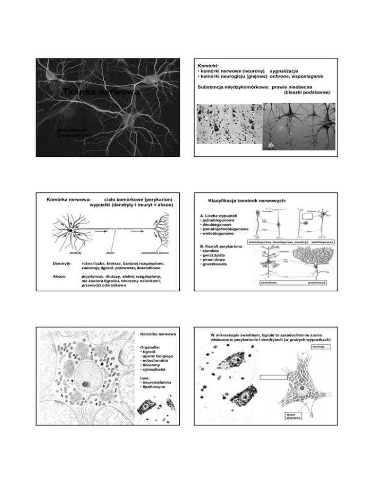 Komórki: • komórki nerwowe (neurony) sygnalizacja • komórki neurogleju (glejowe) ochrona, wspomaganie Substancja międzykomórkowa: prawie nieobecna (blaszki podstawne) Tkanka nerwowa pobudliwość przewodnictwo Komórka nerwowa: ciało komórkowe (perykarion) wypustki (dendryty i neuryt = akson) Klasyfikacja komórek nerwowych: A. Liczba wypustek • jednobiegunowe • dwubiegunowe • pseudojednobiegunowe • wielobiegunowe jednobiegunowa dwubiegunowa pseudo-j.b. wielobiegunowa dendryty akson zakończenia aksonu Dendryty: róŜna liczba, krótsze, bardziej rozgałęzione, zawierają tigroid, przewodzą dośrodkowo Akson: pojedynczy, dłuŜszy, słabiej rozgałęziony, nie zawiera tigroidu, otoczony osłonkami, przewodzi odśrodkowo Komórka nerwowa B. Kształt perykarionu • ziarniste • gwiaździste • piramidowe • gruszkowate piramidowa gruszkowata W mikroskopie świetlnym, tigroid to zasadochłonne ziarna widoczne w perykarionie i dendrytach (w grubych wypustkach) dendryty Organelle: • tigroid • aparat Golgiego • mitochondria • lizosomy • cytoszkielet Inne: • neuromelanina • lipofuscyna stoŜek aksonalny Mikroskop elektronowy ujawnia, Ŝe tigroid to skupiska szorstkiej siateczki śródplazmatycznej i wolnych rybosomów W komórce nerwowej występują bardzo licznie dwa elementy cytoszkieletu: • neurofilamenty (= filamenty pośrednie) • neurotubule (= mikrotubule) dyne Nierównomierne rozmieszczenie jonów po obu stronach błony komórkowej komórki nerwowej powoduje powstanie róŜnicy potencjałów po obu stronach błony (potencjał spoczynkowy, -90 mV po stronie cytoplazmatycznej) a zyn Bodziec nerwowy ma postać zjawiska elektrycznego kine ina pęczki neurofilamentów i neurotubul akson Neurofilamenty pełnią funkcję podporową Neurotubule, współpracując z mechanoenzymami, są odpowiedzialne za transport organelli, pęcherzyków i duŜych cząsteczek w perykarionie i w wypustkach. Szczególnie istotny jest transport wewnątrz aksonu (transport aksonalny). Otwarcie kanałów sodowych powoduje odwrócenie potencjału, czyli depolaryzację błony. Otwieranie kolejnych kanałów sodowych (otwieranych zmianą potencjału) wywołuje przesuwanie się depolaryzacji wzdłuŜ błony (fala depolaryzacji) z prędkością do 3 m/s przestrzeń pozakomórkowa 3Na+ + - 2K+ kanały potasowe kanał chlorkowy pompa sodowopotasowa kanał sodowy cytoplazma Bodziec przewodzony przez akson to potencjał czynnościowy Potencjał czynnościowy powstaje w początkowym odcinku aksonu, gdzie znajdują się liczne kanały otwierane zmianą potencjału Włókno nerwowe = akson otoczony osłonką W niezmielinizowanych włóknach obwodowego układu nerwowego, aksony leŜą w rynienkowatych zagłębieniach cytoplazmy komórki Schwanna (osłonka Schwanna) Osłonki aksonu są wytwarzane przez komórki neurogleju: • w OUN przez komórki Schwanna • in CUN przez oligodendrocyty i astrocyty W zaleŜności od typu osłonki (istnieją 2 typy), włókna nerwowe mogą być: • zmielinizowane (aksony są otoczone osłonką mielinową) • niezmielinizowane (aksony są otoczone cienką osłonką cytoplazmatyczną, Schwanna) Aksony otoczone przez osłonkę Schwanna mają regularnie rozmieszczone kanały sodowe i przewodzą bodźce w formie fali depolaryzacji (przewodzenie ciągłe) W zmielinizowanych włóknach nerwowych, akson jest otoczony przez szczególną osłonkę mielinową, równieŜ wytworzoną przez komórkę Schwanna Wpuklenie błony komórki Schwanna (mezakson) owija się wielokrotnie wokół aksonu... mezakson ... co prowadzi do wytworzenia zwartego układu koncentrycznych, wielokrotnych warstw lipidów i białek Akson Akson otoczony przez osłonkę mielinową ma nierównomiernie rozmieszczonekanały sodowe i przewodzi bodźce w formie złoŜonej z depolaryzacji błony i słabego prądu elektrycznego płynącego przez cytoplazmę (przewodzenie skokowe) Jedna komórka Schwanna wytwarza jeden segment osłonki. W miejscu, gdzie stykają się dwa sąsiednie segmenty (przewęŜenie Ranviera), błona komórkowa aksonu zawiera liczne kanały sodowe W obrębie segmentu osłonki mielinowej, bodziec ma formę słabego prądu elektrycznego płynącego przez cytoplazmę aksonu. Słabnący bodziec jest odtwarzany przez depolaryzację błony w przewęŜeniu Ranviera (bodziec „skacze” od przewęŜenia do przewęŜenia = przewodzenie skokowe) Przewodzenie Szybkość przewodzenia zaleŜy od: • obecności osłonki mielinowej • długości segmentów osłonki • grubości osłonki mielinowej • grubości aksonu Typy włókien nerwowych: A: grube zmielinizowane B: cienkie zmielinizowane C: niezmielinizowane Synapsy mogą się tworzyć pomiędzy róŜnymi częściami komórek nerwowych, a takŜe pomiędzy komórkami nerwowymi i włóknami mięśniowymi szkieletowymi • aksodendrytyczne • aksosomatyczne • aksoaksonalne • płytki motoryczne 15-120 m/s 3-15 m/s 1-3 m/s Synapsa składa się z części pre- i postsynaptycznej płytka motoryczna Przewodzenie synaptyczne: 1. Potencjał czynnościowy dochodzi do części presynaptycznej 2. Otwierają się kanały wapniowe 3. Wzrost poziomu Ca2+ w części presynaptycznej wywołuje egzocytozę pęcherzyków synaptycznych 4. Cząsteczki neuroprzekaźnika dyfundują przez szczelinę synaptyczną i wiąŜą się z receptorami w błonie postsynaptycznej 5. Otwierają się kanały jonowe w błonie postsynaptycznej Część presynaptyczna: mitochondria, pęcherzyki synaptyczne zawierające neuroprzekaźnik Część (błona) postsynaptyczna: receptory dla neuroprzekaźnika Centralny układ nerwowy Komórki neurogleju: Istota szara: • perykariony komórek nerwowych • niezmielinizowane włókna nerwowe • astrocyty protoplazmatyczne • liczne naczynia krwionośne A. Obwodowy U.N. • komórki Schwanna B. Centralny U.N. • astrocyty • oligodendrocyty • komórki mezogleju • komórki ependymy Astrocyt protoplazmatyczny Komórka mezogle