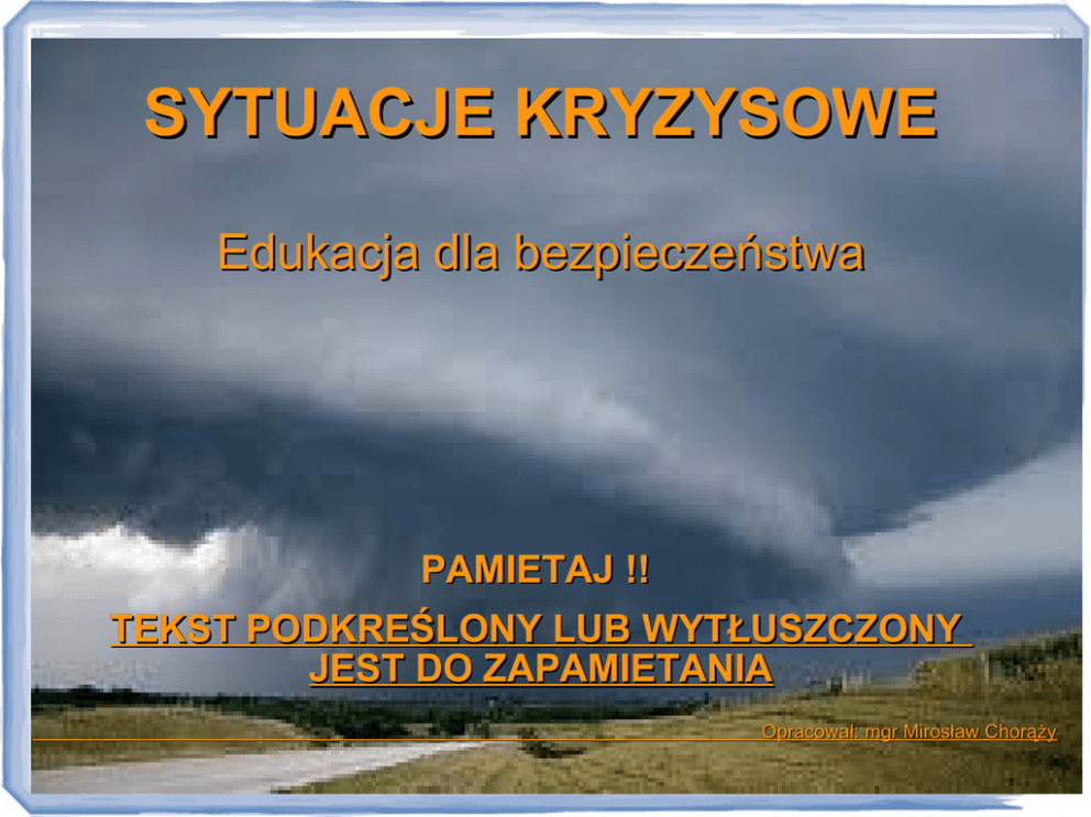 SYTUACJE KRYZYSOWE Edukacja dla bezpieczeństwa PAMIETAJ !! TEKST PODKREŚLONY LUB WYTŁUSZCZONY JEST DO ZAPAMIETANIA Opracował: mgr Mirosław Chorąży SYTUACJA KRYZYSOWA – ROZUMIENIE POJĘCIA? Sytuacja kryzysowa to wydarzenia wpływające destabilizująco na dotychczasowy stan rzeczy, wymagające specjalistycznych działań, użycie nietypowych środków i zaangażowania sporych sił ratowniczych, uruchomienia odpowiednich organów administracji publicznej. Nie wymaga ona wprowadzenia żadnego stanu wyjątkowego. Ewentualną sytuację kryzysową w Polsce ze względu na zasięg i sposób zarządzania nią można podzielić na: - lokalną, lokalną -wojewódzką, - centralną. Sytuacja kryzysowa może oznaczać zagrożone: - bezpieczeństwa, życia i mienie obywateli, - porządku publicznego, - ograniczenie praw i swobód obywatelskich. Sytuacja kryzysowa – rozbity samolot prezydenta RP 10 kwietnia 2010 roku Funkcjonowanie Rzeczypospolitej Polskiej. Codzienne życie mogą czasem zakłócić wydarzenia nadzwyczajne takie jak np. powódź, wyciek amoniaku z zakładu przemysłowego Chłodnia Grudziądz S.A, położonej na os. Lotnisko, duży pożar, susza, duże opady śniegu, nadzwyczajny mróz, huragan, itp. Sejm Rzeczypospolitej Polskiej ustalił stany funkcjonowania naszego państwa: Stan normalnego funkcjonowania państwa - bezpieczeństwo obywateli nie jest zagrożone. państwo i obywatele funkcjonują jak każdego dnia. Stan nadzwyczajny – klęska żywiołowa, stan wyjątkowy, stan wojenny. Stan wojny – konflikt zbrojny z innym państwem - inaczej wojna. SYSTEM ZARZĄDZANIA KRYZYSOWEGO W POLSCE Tworzą go organy administracji państwowej: Poziom centralny - np. Rządowy Zespół Zarządzania Kryzysowego. Teren – wojewódzkie, powiatowe, gminne zespoły zarządzania kryzysowego. STRUKTURA NARODOWEGO SYSTEMU ZARZĄDZANIA KRYZYSOWEGO W POLSCE Poziom centralny zarządzania kryzysowego W Polsce PREZES RADY MINISTRÓW Minister Spraw Wewnętrznych Rządowy Zespół Zarządzania Kryzysowego Rządowe Centrum Bezpieczeństwa Zespoły Zarządzania Kryzysowego Ministerstw i Centralnych Organów Administracji Rządowej Centra Zarządzania Kryzysowego Ministerstw i Centralnych Organów Administracji Rządowej Poziom wojewódzki zarządzanie kryzysowego w Polsce WOJEWODA Wojewódzki Zespół Zarządzania Kryzysowego Wojewódzkie Centrum Zarządzania Kryzysowego Poziom lokalny zarządzania kryzysowego w Polsce STAROSTA POWIATOWY WÓJT, BURMISTRZ, PREZYDENT MIASTA Powiatowy Zespół Zarządzania Kryzysowego Gminny Zespół Zarządzania Kryzysowego Powiatowe Centrum Zarządzania Kryzysowego Gminne Centrum Zarządzania Kryzysowego Najczęstsze przyczyny sytuacji kryzysowych 1) Naturalne spowodowane: silnymi wiatrami, ● gwałtownymi obfitymi opadami, ● gradobiciem, ● powodziami, ● ekstremalnymi temperaturami, długotrwałymi suszami, ● osunięciami gruntu, ● trzęsieniami ziemi, ● pożarami, ● ● ● Lawinami, wzrost promieniowania ultrafioletowego. Najczęstsze przyczyny sytuacji kryzysowych ciąg dalszy. 2) Cywilizacyjno gospodarcze spowodowane: ● epidemiami wśród ludzi, zwierząt, roślin, ● ● skażeniami biologicznymi, chemicznymi, radioaktywnymi, zakłóceniami w zaopatrzeniu w energię elektryczną, gaz, paliwa płynne, wodę, katastrofami komunikacyjnymi, ● zanieczyszczeniami środowiska np.:dymy, pyły kwaśne opady deszczu, ● ● awariami przemysłowymi np.: urządzeń hydrotechnicznych, energetycznych, katastrofy budowlane i kopalniane. Lokalna sytuacja kryzysowa na skutek katastrofy komunikacyj Najczęstsze przyczyny sytuacji kryzysowych ciąg dalszy 3) Społeczno – polityczne: ● zakłócenie porządku publicznego (strajki, demonstracje, wypowiedzenie posłuszeństwa obywatelskiego władzy, rewolucja, ● akty terroryzmu, ● działania wojenne, ● masowa migracja ludności w celu poprawy własnego bytu, SPOSOBY POSTĘPOWANIA W SYTUACJI KRYZYSOWEJ GDY MAMY DO CZYNIENIE ZE ZBLIŻAJĄCYM SIĘ NP.: HURAGANEM, TRĄBĄ POWIETRZNĄ: - Dowiedzieć się gdzie i jak odcina się dopływ gazu, prądu, wody. - Ustalić sposobów komunikowania się domowników przebywających w różnych miejscach. - Sprawdzić i w razie konieczności poprawić, zabezpieczyć te części dachu, rynien. których stan wskazuje, że nie przetrzymają nawałnicy. - Przypomnieć, nauczyć domowników wzywania straży pożarnej pogotowia ratunkowego, policji. - Zamknąć i jeżeli uznamy, że jest taka potrzeba zabezpieczyć dodatkowo okna drzwi. - Ustawić pojazdy w bezpiecznej odległości od drzew, słupów innych obiektów, które huragan może złamać lub przewrócić. - Uzupełnić apteczkę pierwszej pomocy. - Przygotować zapas zapałek, świec, baterii, zapalniczkę, latarkę, radioodbiornik - sprawdzić ich działanie. - Przygotować według uznania przedmioty niezbędne w razie ewakuacji. Huragan kujawsko – pomorskie 2012 koło Tlenia niedaleko Grudziądza INNE PRZYCZYNY MOGĄCE SPOWODOWAĆ W POLSCE POWSTANIE SYTUACJI KRYZYSOWEJ Zanieczyszczenia: Emisja toksycznych środków przemysłowych, biorących udział w procesie produkcji, do wód, gruntu i do atmosfery. Wszelkiego rodzaju odpady poprodukcyjne, które mogą być radioaktywne lub chemicznie szkodliwe dla ludzi, zwierząt, roślin oraz śmieci komunalne i szpitalne. Zadanie domowe Jak myślisz - po co tworzy się system zarządzania kryzysowego i jakie organy administracji państwowej wchodzą w jego skład na szczeblu wojewódzkim. Napisz w 3 -4 zdaniach. Skorzystaj z informacji, które znajduje się w Internecie. KONIEC