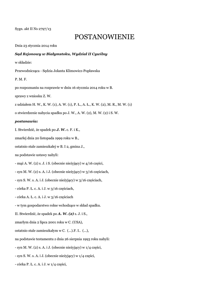 Sygn. akt II Ns 2797/13 POSTANOWIENIE Dnia 23 stycznia 2014 roku Sąd Rejonowy w Białymstoku, Wydział II Cywilny w składzie: Przewodnicząca - Sędzia Jolanta Klimowicz-Popławska P. M. F. po rozpoznaniu na rozprawie w dniu 16 stycznia 2014 roku w B. sprawy z wniosku Z. W. z udziałem H. W., K. W. (1), A. W. (1), P. Ł., A. Ł., K. W. (2), M. R., M. W. (1) o stwierdzenie nabycia spadku po J. W., A. W. (2), M. W. (2) i S. W. postanawia: I. Stwierdzić, że spadek po J. W. c. F. i K., zmarłej dnia 20 listopada 1999 roku w B., ostatnio stale zamieszkałej w B. I 2, gmina J., na podstawie ustawy nabyli: - mąż A. W. (2) s. J. i S. (obecnie nieżyjący) w 4/16 części, - syn M. W. (2) s. A. i J. (obecnie nieżyjący) w 3/16 częściach, - syn S. W. s. A. i J. (obecnie nieżyjący) w 3/16 częściach, - córka P. Ł. c. A. i J. w 3/16 częściach, - córka A. Ł. c. A. i J. w 3/16 częściach - w tym gospodarstwo rolne wchodzące w skład spadku. II. Stwierdzić, że spadek po A. W. (2) s. J. i S., zmarłym dnia 2 lipca 2001 roku w C. (USA), ostatnio stale zamieszkałym w C. (...).F. I.. (...), na podstawie testamentu z dnia 26 sierpnia 1993 roku nabyli: - syn M. W. (2) s. A. i J. (obecnie nieżyjący) w 1/4 części, - syn S. W. s. A. i J. (obecnie nieżyjący) w 1/4 części, - córka P. Ł. c. A. i J. w 1/4 części, - córka A. Ł. c. A. i J. w 1/4 części. III. Stwierdzić, że spadek po M. W. (2) s. A. i J., zmarłym dnia 23 czerwca 2003 roku w B., ostatnio stale zamieszkałym w B. I 25, gmina J., na podstawie ustawy nabyli: - żona H. W. c. B. i A. w ¼ części, - syn K. W. (1) s. M. i H. w ¼ części, - syn Z. W. s. M. i H. w ¼ części, - córka A. W. (1) c. M. i H. w ¼ części. IV. Stwierdzić, że spadek po S. W. s. A. i J., zmarłym dnia 10 stycznia 2006 roku w M., ostatnio stale zamieszkałym w B. I 25, gmina J., na podstawie ustawy nabyli: - żona K. W. (2) c. M. i A. w 1/3 części, - syn M. W. (1) s. S. i K. w 1/3 części, - córka M. R. c. S. i K. w 1/3 części. V. Przyznać adwokatowi M. Z. wynagrodzenie w kwocie 442,80 złotych, w tym podatek VAT – 82,80 złotych, ze Skarbu Państwa - Sądu Rejonowego w Białymstoku tytułem zwrotu kosztów nieopłaconej pomocy prawnej udzielonej uczestniczce postępowania P. Ł. z urzędu. VI. Stwierdzić, że zainteresowani ponoszą we własnym zakresie koszty postępowania związane ze swoim udziałem w sprawie. Sygn. akt II Ns 2797/13 UZASADNIENIE Wnioskodawca Z. W. wniósł o stwierdzenie nabycia spadku po J. W., A. W. (2), M. W. (2) oraz S. W., na mocy ustawy po wszystkich spadkodawcach. Domagał się rozstrzygnięcia o kosztach postępowania według norm przepisanych. Uczestnicy postępowania H. W., A. W. (1), K. W. (2), M. W. (1), M. R. przychylili się do wniosku (k. 68 verte). Po ostatecznym sprecyzowaniu stanowiska do wniosku przychylił się też ustanowiony z urzędu pełnomocnik P. Ł. wnosząc o zasądzenie kosztów pomocy prawnej ustanowionej z urzędu, które nie zostały opłacone ani w całości, ani w części (k. 97). Uczestniczka postępowania A. Ł. przychyliła się do wniosku, z tym że wniosła o stwierdzenie nabycia spadku po A. W. (2) na podstawie testamentu z dnia 26 sierpnia 1993 roku (k. 97). Uczestnik postępowania K. W. (1) nie zajął stanowiska w sprawie. Sąd ustalił, co następuje: J. W. (z domu K.) córka F. i K. zmarła dnia 20 listopada 1999 roku w B.. Ostatnio stale zamieszkiwała w B. I 2 (odpis skrócony aktu zgonu wydany przez Urząd stanu Cywilnego w J. N. (...) – k. 6). W dacie śmierci była zamężna z A. W. (2) (odpis skrócony aktu małżeństwa wydany przez Urząd Stanu Cywilnego N.. (...) – k. 20). Spadkodawczyni pozostawiła czworo dzieci: córkę P. Ł. (odpis skrócony aktu małżeństwa wydany przez Urząd Stanu Cywilnego w J. N.. (...) – k. 86), córkę A. Ł. (odpis skrócony aktu małżeństwa wydany przez Urząd Stanu Cywilnego w J. N.. (...) – k. 21), syna M. W. (2), który zmarł dnia 23 czerwca 2003 roku (odpis skrócony aktu zgonu wydany przez Urząd Stanu Cywilnego w J. N.. (...) – k. 8), syna S. W., który zmarł dnia 10 stycznia 2006 roku (odpis skrócony aktu zgonu wydany przez Urząd Stanu Cywilnego w M. N.. (...) – k. 9). Innych dzieci nie posiadała, w tym pozamałżeńskich, ani przysposobionych. J. W. nie sporządziła testamentu, a w skład spadku po niej wchodzi udział w ½ części we własności gospodarstwa rolnego położonego w B. o powierzchni 7 ha, które stanowiło przedmiot wspólności ustawowej małżeńskiej z jej mężem A. W. (2). Uprawnienia do dziedziczenia wchodzącego w skład spadku gospodarstwa rolnego posiadali mąż spadkodawczyni A. W. (2) oraz jej dzieci: córka P. Ł., córka A. Ł., syn M. W. (2) i syn S. W.. A. W. (2) syn J. i S. zmarł dnia 2 lipca 2001 roku w C.. Ostatnio stale zamieszkiwał w C.. W dacie śmierci był wdowcem (odpis skrócony aktu zgonu wydany przez Urząd stanu Cywilnego w J. N.. (...) - k. 7). Spadkodawca pozostawił czworo dzieci: córkę P. Ł. (odpis skrócony aktu małżeństwa wydany przez Urząd Stanu Cywilnego w J. N.. (...) – k. 86), córkę A. Ł. (odpis skrócony aktu małżeństwa wydany przez Urząd Stanu Cywilnego w J. N.. (...) – k. 21), syna M. W. (2), który zmarł dnia 23 czerwca 2003 roku (odpis skrócony aktu zgonu wydany przez Urząd Stanu Cywilnego w J. N.. (...) – k. 8), syna S. W., który zmarł dnia 10 stycznia 2006 roku (odpis skrócony aktu zgonu wydany przez Urząd Stanu Cywilnego w M. N.. (...) – k. 9). Innych dzieci nie posiadał, w tym pozamałżeńskich, ani przysposobionych. A. W. (2) przed śmiercią, w dniu 26 sierpnia 1993 roku, sporządził testament przed dwoma świadkami, zgodnie z prawem obowiązującym w stanie(...) w USA (testament i jego tłumaczenie – k. 27 i 31-33). Mocą wskazanego testamentu spadkodawca powołał do całości spadku w równych częściach żonę J. W. i dzieci: S. W., P. Ł., A. Ł. i M. W. (2), a w razie gdyby J. W. z