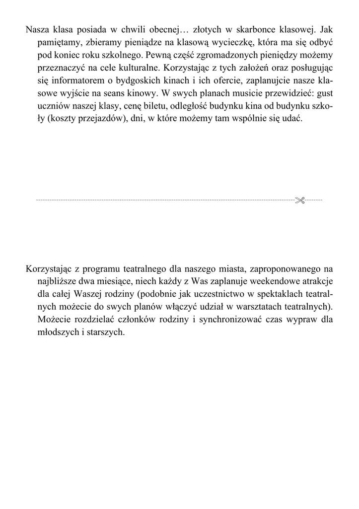 Nasza klasa posiada w chwili obecnej… złotych w skarbonce klasowej. Jak pamiętamy, zbieramy pieniądze na klasową wycieczkę, która ma się odbyć pod koniec roku szkolnego. Pewną część zgromadzonych pieniędzy możemy przeznaczyć na cele kulturalne. Korzystając z tych założeń oraz posługując się informatorem o bydgoskich kinach i ich ofercie, zaplanujcie nasze klasowe wyjście na seans kinowy. W swych planach musicie przewidzieć: gust uczniów naszej klasy, cenę biletu, odległość budynku kina od budynku szkoły (koszty przejazdów), dni, w które możemy tam wspólnie się udać. ------------------------------------------------------------------------------------------------------------------- -------- Korzystając z programu teatralnego dla naszego miasta, zaproponowanego na najbliższe dwa miesiące, niech każdy z Was zaplanuje weekendowe atrakcje dla całej Waszej rodziny (podobnie jak uczestnictwo w spektaklach teatralnych możecie do swych planów włączyć udział w warsztatach teatralnych). Możecie rozdzielać członków rodziny i synchronizować czas wypraw dla młodszych i starszych. Aneks Tekst nr 1 – Kartofel! – huknął kapitan. – Gdzie jest zbójca Kartofel? Obejrzeli się wszyscy krwawym wzrokiem i zbudzili Kartofla, który spał. – Jestem! – mruczał Kartofel sennym głosem. – Ha! Ha! – wrzasnął kapitan. – Znowu śpisz? – Przebacz mi, kapitanie – rzekł zbójca z nosem zadartym i z poczciwą gębą. – Możesz odejść! […] – Rozporek! – wołał herszt. – Jestem, kapitanie! – zawołał cieniutkim, wysokim głosem zbójca, chudy i niemrawy. – Odejdź!... Wieprzoweoko! – Jestem! Przed hersztem stanął straszliwy zbójca, który miał jedno oko jasne, a drugie ciemne. – Trzęsionka! – wyliczał kapitan. – Jestem! – Wystąp! Gdzie jest twój nóż? – Zgubiłem go, kapitanie… – Ha! Ha! Zgubiłeś? Pewnie znowu uciekałeś? – Jestem jak lew, kapitanie. Tekst nr 2 Robaczek stanął szeroko na nogach, odłamał szczyt wysokiej jodły, zgrzytnął zębami tak, jakby kto orzech gryzł, i huknął. – Niesprawiedliwość dzieje się nam, kapitanie! – Kto jest temu winien? – Ty sam! – Czy chcesz, abym ci mieczem przebił wątrobę? – Nie chcę tego, kapitanie, ale sam kazałeś mówić. Chcę ci tedy powiedzieć, że czcigodne nasze zgromadzenie jest oburzone tym, coś ty, kapitanie, wczoraj uczynił. – A cóż ja takiego uczyniłem? – Powiem ci, jeśli udajesz, że zapomniałeś. Stojąc na czatach za miastem, na wzgórku, u słupca, podsłuchałeś, jak dzieci się modlą, aby ich ojciec szczęśliwie powrócił. Niedługo potem nadjechały wozy ich ojca, bogatego kupca. Rzuciliśmy się na nie, a ty spędziłeś bandę precz z drogi, wypuściłeś wolno kupca i jego bogactwa i kazałeś mu jechać w miasto, do dzieci łaskawie przemówiwszy i prosząc je o modlitwę. Ha! Ha! Ty, herszt sławnych zbójców, prosiłeś o paciorek, ale przez te twoje zachcianki my straciliśmy niezmierne skarby. Prawda to wszystko czy nieprawda? Herszt podumał chwilę i rzekł: – To wszystko prawda, wypuściłem kupca. – Czemuś to uczynił? – Bo i ja mam żonę, a u mojej żony jest synek taki maleńki jak ten, co się rzewnie modlił do Boga. – Co nam twoja żona i twój syn! Jesteś hersztem zbójców. – Tak, jestem Brodacz, herszt zbójców. Widać jednak, że i ja mam duszę, bo mi się płakać chciało, kiedy słuchałem modlitwy tych piskląt. – Pisklęta pisklętami, ale kupca trzeba było zarżnąć! – Wierzcie mi, zbójcy, że pierwszy bym pałkę strzaskał na jego głowie, gdyby nie dziatek pacierze. Zbójcy wrzasnęli wielkim śmiechem. – Nie śmiej się, Łamignacie, ani ty, Goliacie! Pomyślałem sobie, że kiedy się znajdziemy na boskim sądzie, to ten czyn będzie odczytany z wielkiej księgi i wiele mi za to będzie przebaczone. – A kto nam zwróci bogactwa? – huknął Robaczek. Bogactw nam nie braknie, ale ponad bogactwa jest jeszcze coś… – He! He! Cóż takiego? – Sława! – zawołał herszt. – A cóż to jest sława? – spytał zbójca Rozporek. – Sława? Aby wam to wyjaśnić, to wam tylko powiem, że o tym zdarzeniu wczorajszym ludzie będą śpiewać pieśni, a poeci będą pisać wiersze. Wtem Łapiduch, zbójca wierszami gadający, zakrzyknął: – Na nóż klnę się i buławę, że niezmierną zyskasz sławę. – Tak – wołał herszt – wielcy poeci o tym pisać będą! – Sława jeść nam nie da! – zakrzyknęli zbójcy – oddaj nam skarby! – Uspokójcie się! –wołał herszt. – Chcąc zachować dzieciom ojca, pozwoliłem mu ujść z życiem i majątkiem. Na co brać na sumienie łzy sieroce? Za to jednak wymyśliłem taką wyprawę, na której zyskamy stokroć więcej . Tekst nr 3 Nieborak pochylił smutno głowę, a potem zapytał: – A co mam uczynić z piegowatymi jeńcami? – Puść wolno tych mizeraków – szepnął kapitan szeptem, a głośno dodał. – Możesz ich zabić, gdyby chcieli uciekać. Ponieważ wybieramy się w długą drogę, będziesz miał wiele czasu, aby ich wziąć na spytki. Wybadaj ich, co wrzucili do wody? Gdyby nie chcieli wydać sekretu, wyrwij im najpierw wszystkie zęby, potem im wbij drzazgi za paznokcie, a potem każ im połykać węgle. ------------------------------------------------------------------------------------------------------------------- -------- Tekst nr 4 W czasie wojny, kiedy miałam zaledwie pół roku, nasz tata, leśniczy, został aresztowany prze Niemców. Moje cztery starsze siostry zabrały mnie ze sobą i poszły pod krzyż za wsią modlić się za tatę. Przejeżdżał oficer niemiecki bryczką. Kazał zatrzymać konie polskiemu woźnicy i zapytać dzieci, co tam robią. Polak dowiedział się, że dzieci modlą się o uwolnienie ojca z rąk Niemców. Wówczas oficer jeszcze raz wysłał Polaka po potrzebne informacje: jak się ten człowiek nazywa i skąd pochodzi. Pr