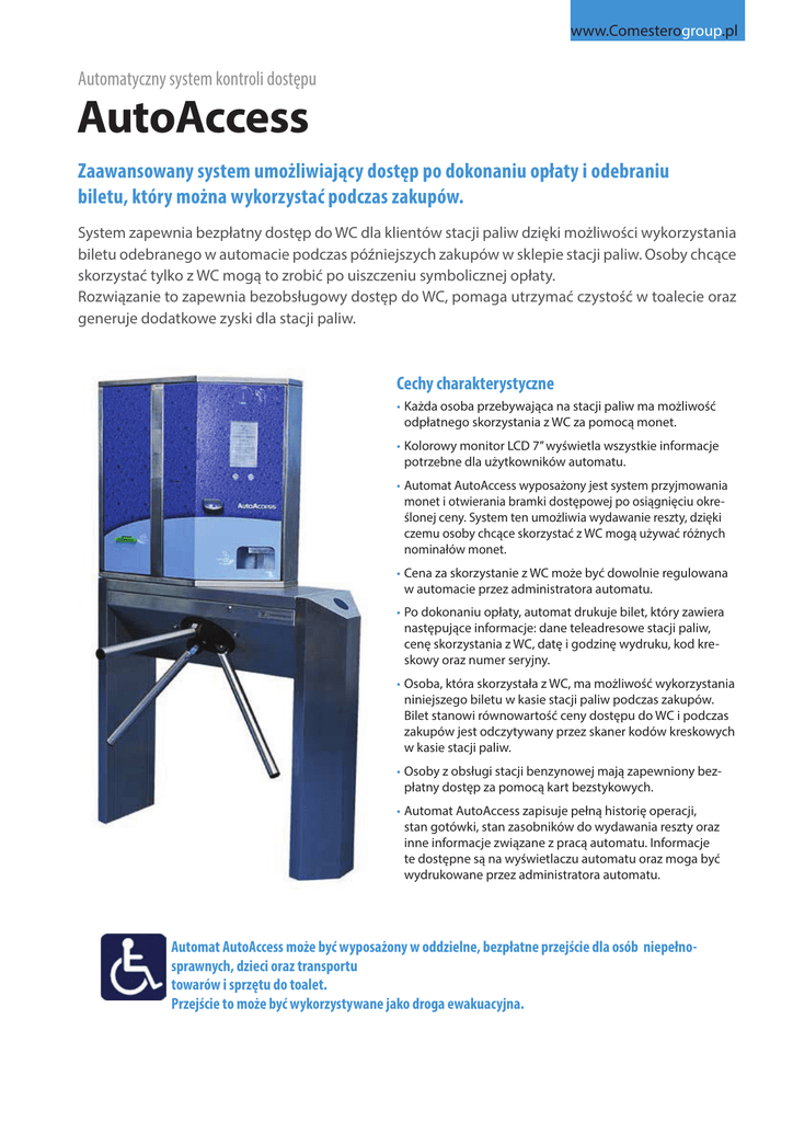 www.Comesterogroup.pl Automatyczny system kontroli dostępu AutoAccess Zaawansowany system umożliwiający dostęp po dokonaniu opłaty i odebraniu biletu, który można wykorzystać podczas zakupów. System zapewnia bezpłatny dostęp do WC dla klientów stacji paliw dzięki możliwości wykorzystania biletu odebranego w automacie podczas późniejszych zakupów w sklepie stacji paliw. Osoby chcące skorzystać tylko z WC mogą to zrobić po uiszczeniu symbolicznej opłaty. Rozwiązanie to zapewnia bezobsługowy dostęp do WC, pomaga utrzymać czystość w toalecie oraz generuje dodatkowe zyski dla stacji paliw. Cechy charakterystyczne • Każda osoba przebywająca na stacji paliw ma możliwość odpłatnego skorzystania z WC za pomocą monet. • Kolorowy monitor LCD 7’’ wyświetla wszystkie informacje potrzebne dla użytkowników automatu. • Automat AutoAccess wyposażony jest system przyjmowania monet i otwierania bramki dostępowej po osiągnięciu określonej ceny. System ten umożliwia wydawanie reszty, dzięki czemu osoby chcące skorzystać z WC mogą używać różnych nominałów monet. • Cena za skorzystanie z WC może być dowolnie regulowana w automacie przez administratora automatu. • Po dokonaniu opłaty, automat drukuje bilet, który zawiera następujące informacje: dane teleadresowe stacji paliw, cenę skorzystania z WC, datę i godzinę wydruku, kod kreskowy oraz numer seryjny. • Osoba, która skorzystała z WC, ma możliwość wykorzystania niniejszego biletu w kasie stacji paliw podczas zakupów. Bilet stanowi równowartość ceny dostępu do WC i podczas zakupów jest odczytywany przez skaner kodów kreskowych w kasie stacji paliw. • Osoby z obsługi stacji benzynowej mają zapewniony bezpłatny dostęp za pomocą kart bezstykowych. • Automat AutoAccess zapisuje pełną historię operacji, stan gotówki, stan zasobników do wydawania reszty oraz inne informacje związane z pracą automatu. Informacje te dostępne są na wyświetlaczu automatu oraz moga być wydrukowane przez administratora automatu. Automat AutoAccess może być wyposażony w oddzielne, bezpłatne przejście dla osób niepełnosprawnych, dzieci oraz transportu towarów i sprzętu do toalet. Przejście to może być wykorzystywane jako droga ewakuacyjna. Jak to działa? Około 50% klientów stacji paliw korzysta tylko z toalet (dochód z opłat za skorzystanie z toalety), natomiast pozostałe 50% klientów wykorzystuje bilety do zakupów w sklepie. Kolorowy monitor LCD 7’’ wyświetla wszystkie informacje potrzebne dla użytkowników automatu Opuszczane ramię bramki obrotowej Kolorystyka automatu może być personalizowana Zalety systemu • Łatwość obsługi przez użytkowników. • Rozwiązanie przyjazne użytkownikom dzięki biletom umożliwiającym zwrot kosztów korzystania z WC. • Przychody z systemu wspierają, a niejednokrotnie pokrywają koszty sprzątania toalety oraz generują dodatkowe zyski. • Szybki czas zwrotu inwestycji. • Wysoki poziom higieny w toaletach przekłada się na pozytywny wizerunek całej firmy. • Bilety zachęcają użytkowników do zakupów na stacji paliw, co przekłada się na wzrost obrotów. • Klienci, którzy zastosowali to rozwiązanie, potwierdzili wzrost obrotów o 10-15%. www.Comesterogroup.pl www.Comesterogroup.pl Automatyczny system kontroli dostępu AutoAccess W zależności od natężenia ruchu oraz ilości dostępnego miejsca automat AutoAccess można zainstalować w różnych wariantach: AutoAccess z barierką prostą lub wygiętą • Wersja przeznaczona do miejsc o małym natężeniu ruchu. • Automat umożliwia odpłatny wstęp do WC potwierdzony biletem. • Automat umożliwia swobodne wyjście. • Barierka wygięta w połączeniu z opuszczanym ramieniem bramki, zapewniają swobodne, bezpłatne przejście dla osób niepełnosprawnych. AutoAccess z barierką i bramką wyjściową • Wersja przeznaczona do miejsc o średnim natężeniu ruchu. • Automat umożliwia odpłatny wstęp do WC potwierdzony biletem. • Bramka wyjściowa zapewnia swobodne wyjście. Dwa automaty AutoAccess z barierką • Wersja przeznaczona do miejsc o dużym natężeniu ruchu. • Automaty umożliwiają odpłatny wstęp do WC potwierdzony biletem. • Automaty zapewniają swobodne wyjście. AutoAccess z barierką i bramką uchylną • Wersja przeznaczona do miejsc o małym i średnim natężeniu ruchu. • Automat umożliwia odpłatny wstęp do WC potwierdzony biletem. • Automat zapewnia swobodne wyjście. • Bramka uchylna zapewnia swobodne przejście dla osób niepełnosprawnych, dzieci o wzroście do 115 cm oraz transportu towarów i sprzętu do toalet. AutoAccess w wersji wiszącej • Wersja przeznaczona do instalacji w miejscach uniemożliwiających montaż automatu z bramką obrotową. • Automat drukuje paragon jako potwierdzenie dokonania płatności. • Automat steruje elektrozamkiem drzwi wejściowych do WC. Rysunki Techniczne UWAGA: Jednostka miary: mm System WorldKey obsługujący 3 rodzaje specjalnych kart bezstykowych Zamykany i podświetlany wlot monet Drukarka termiczna zapewnia wydruk wysokiej jakości Dane techniczne Wymiary (wys. x szer. x gł.) 1685 x 1110 x 794 mm (725 x 700 x 300 mm w wersji wiszącej) Waga 117 kg (45 kg w wersji wiszącej) Obudowa stal nierdzewna szlifowana 1.4301 (EN 10088) Wyświetlacz LCD 7’’ o rozdzielczości 800x480 (RGB) Akceptowane monety PLN 0,01 / 0,02 / 0,05 / 0,10 / 0,20 / 0,50 / 1 / 2 Zasobniki do wydawania reszty 6 (nominały 0,05 / 0,0,5 / 0,10 / 0,20 / 0,50 / 1 EUR) Jakość wydruku 200 dpi Szerokośc papieru 60 ÷ 82,5 mm Grubośc papieru 60 ÷ 120 g/m² Formaty kodów kreskowych UPC-A, UPC-E, EAN13, EAN8, CODE39, ITF, CODABAR, CODE93, CODE128, CODE32, PDF417 Komunikacja on-line (opcja) LAN, WI-FI, GPRS Zasilanie 230V/50Hz Pobór prądu max 200VA www.Comesterogroup.pl