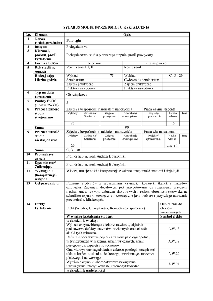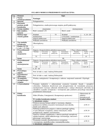 SYLABUS MODUŁU/PRZEDMIOTU KSZTAŁCENIA Lp. 1 Element Nazwa modułu/przedmiotu 2 3 4 5 6 7 8 Instytut Kierunek, poziom, profil kształcenia Forma studiów Rok studiów, semestr Rodzaj zajęć i liczba godzin Typ modułu kształcenia Punkty ECTS (1 pkt = 25-30g) Pracochłonność studia stacjonarne Opis Patologia Pielęgniarstwa Pielęgniarstwo, studia pierwszego stopnia, profil praktyczny stacjonarne Rok I, semestr I, II Wykład Seminarium Zajęcia praktyczne Praktyka zawodowa niestacjonarne Rok I, semI 75 Wykład Ćwiczenia / seminarium Zajęcia praktyczne Praktyka zawodowa Obowiązkowy 3 Zajęcia z bezpośrednim udziałem nauczyciela Wykłady Ćwiczenia/ Seminaria/ Zajęcia praktyczne Konsultacje obowiązkowe Praca własna studenta Projekty/ opracowania 75 9 10 11 12 13 14 Suma Pracochłonność studia niestacjonarne Suma Prowadzący zajęcia Egzaminator/ Zaliczający Wymagania (kompetencje) wstępne Cel przedmiotu Za Efekty kształcenia C, D - 20 Inne 15 90 Zajęcia z bezpośrednim udziałem nauczyciela Wykłady Nauka własna Ćwiczenia/ Seminaria/ Zajęcia praktyczne Konsultacje obowiązkowe 20 C, D - 30 Praca własna studenta Projekty/ opracowania Nauka własna Inne C,D -10 Prof. dr hab. n. med. Andrzej Bobrzyński Prof. dr hab. n. med. Andrzej Bobrzyński Wiedza, umiejętności i kompetencje z zakresu: znajomość anatomii i fizjologii. Poznanie studentów z zaburzeniami czynności komórek, tkanek i narządów człowieka. Zadaniem docelowym jest przygotowanie do rozumienia przyczyn, mechanizmów rozwoju zaburzeń chorobowych i reakcji obronnych człowieka na szkodliwe czynniki zewnętrzne i wewnętrzne jako podstawa przyszłego nauczania przedmiotów klinicznych. Odniesienie do Efekt (Wiedza, Umiejętności, Kompetencje społeczne) efektów kierunkowych W wyniku kształcenia student: Symbol efektu w dziedzinie wiedzy: Wylicza enzymy biorące udział w trawieniu, objaśnia podstawowe defekty enzymów trawiennych oraz określą A.W.13 skutki tych zaburzeń. Definiuje podstawowe pojęcia z zakresu patologii ogólnej, w tym zaburzeń w krążeniu, zmian wstecznych, zmian A.W.19 postępowych, zapaleń i nowotworów. Omawia wybrane zagadnienia z zakresu patologii narządowej układu krążenia, układ oddechowego, trawiennego, moczowoA.W.20 płciowego i nerwowego. Wymienia czynniki chorobotwórcze zewnętrzne A.W.21 i wewnętrzne, modyfikowalne i niemodyfikowalne. w dziedzinie umiejętności: Forma i warunki potwierdzenia efektu kształcenia Kompetencje społeczne umiejętności wiedza 15 Prognozuje kierunek procesów biochemicznych w poszczególnych stanach klinicznych. Opisuje zmiany w funkcjonowaniu organizmu jako całości w sytuacji zaburzenia jego homeostazy. Powiązuje obrazy uszkodzeń tkankowych i narządowych z objawami klinicznymi choroby, wywiadem i wynikami badań diagnostycznych. Szacuje niebezpieczeństwo toksykologiczne w określonych grupach wiekowych oraz w różnych stanach klinicznych. w dziedzinie kompetencji społecznych: Systematycznie wzbogaca wiedzę zawodową i kształtuje umiejętności dążąc do profesjonalizmu. Przestrzega wartości, powinności i sprawności moralnych w opiece. Przestrzega praw pacjenta. Zachowuje tajemnicę zawodową. Prezentuje otwartość na rozwój podmiotowości własnej i pacjenta. Wykorzystuje empatię w relacji z pacjentem i jego rodziną oraz współpracownikami. Efekt kształcenia osiągany przez Sposób potwierdzenia (weryfikacji) moduł/przedmiot Symbol efektu A.W13 test sprawdzian ustny, odpowiedzi na pytania A.W19 16 17 18 Stosowane metody dydaktyczne Forma i warunki zaliczenia modułu, zasady dopuszczenia do egzaminu oraz zaliczenia poszczególnych zajęć Treści merytoryczne przedmiotu A.W20 A.W21 A.U3 A.U11 A.U12 A.U16 A.K2 A.K.3 A.K.5 A.K.7 A.K.9 A.K.10 obserwacja przez nauczyciela prowadzącego odpowiedzi na pytania samoocena studenta esej refleksyjny obserwacja przez nauczyciela prowadzącego samoocena studenta A.U.3 A.U.11 A.U.12 A.U.16 A.K.2 A.K.3 A.K.5 A.K.7 A.K.9 A.K.10 Wykład informacyjny, problemowy, dyskusja dydaktyczna, studium przypadku, metody sytuacyjne, sesja rozwiązywania problemów. Egzamin pisemny, testowy Zasady dopuszczenia do egzaminu/zaliczenia: 1. uzyskanie zaliczenia z samokształcenia 2. pracy pisemnej w formie eseju refleksyjnego Tematyka wykładów: 1. Definicja patologii jako przekroczenie zakresu reakcji fizjologicznej. 2. Budowa ustroju. 3. Definicja urazu – wpływ urazu na ustrój. 4. Wstrząs – definicje i rodzaje wstrząsu. 5. Krwotok. 6. Skaza krwotoczne i zakrzepica. 7. Etiopatogeneza i patomorfologia nowotworów. 8. 9. 10. 11. 12. 19 Wykaz literatury podstawowej 20 Wykaz literatury uzupełniającej (pomocniczej) 13. 14. 15. 16. 17. 1. 2. 3. 4. 1. 2. 3. 4. 5. 6. Choroby skóry i tkanki łącznej. Patologia układu kostnego i mięśni. Patologia układu krążenia: serce i układ naczyniowy. Patologia układu oddechowego. Patologia układu trawiennego; Przełyk, żołądek, wątroba i drogi żółciowe, jelito cienkie i grube. Patologia nerek i układu moczowego. Patologia układu płciowego. Położnictwo. Patologia układu nerwowego i zmysłów. Układ dokrewny Kruś S.: Patologia. Wyd. PZWL, Warszawa 2006. Maśliński S., Ryżewski J. Patofizjologia. PZWL, 2000. Maśliński Z. Patofizjologia. PZWL 1990. Robbins Patologia 2005. Domagała W, Chosia M, Urasińska E.: Podstawy Patologii. Wyd. PZWL, Warszawa, 2010. Kraus H., Sosnowski P. Fizjologia człowieka z elementami patologii Poznań 2009. Krus E., Skrzypek. Patomorfogia kliniczna Stachura J., Domagała W.: Patologia – znaczy słowo o chorobie. Wyd. PAU, Kraków 2008. Stachura J., Domagała W. Patologia znaczy słowo o chorobie 2009. Szczeklik A. Choroby wewnętrzne Kraków 2011.