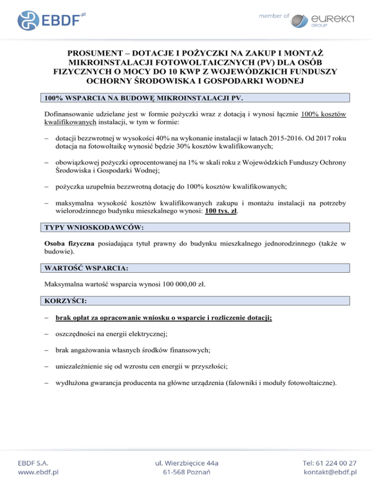PROSUMENT – DOTACJE I POŻYCZKI NA ZAKUP I MONTAŻ MIKROINSTALACJI FOTOWOLTAICZNYCH (PV) DLA OSÓB FIZYCZNYCH O MOCY DO 10 KWP Z WOJEWÓDZKICH FUNDUSZY OCHORNY ŚRODOWISKA I GOSPODARKI WODNEJ 100% WSPARCIA NA BUDOWĘ MIKROINSTALACJI PV. Dofinansowanie udzielane jest w formie pożyczki wraz z dotacją i wynosi łącznie 100% kosztów kwalifikowanych instalacji, w tym w formie: dotacji bezzwrotnej w wysokości 40% na wykonanie instalacji w latach 2015-2016. Od 2017 roku dotacja na fotowoltaikę wynosić będzie 30% kosztów kwalifikowanych; obowiązkowej pożyczki oprocentowanej na 1% w skali roku z Wojewódzkich Funduszy Ochrony Środowiska i Gospodarki Wodnej; pożyczka uzupełnia bezzwrotną dotację do 100% kosztów kwalifikowanych; maksymalna wysokość kosztów kwalifikowanych zakupu i montażu instalacji na potrzeby wielorodzinnego budynku mieszkalnego wynosi: 100 tys. zł. TYPY WNIOSKODAWCÓW: Osoba fizyczna posiadająca tytuł prawny do budynku mieszkalnego jednorodzinnego (także w budowie). WARTOŚĆ WSPARCIA: Maksymalna wartość wsparcia wynosi 100 000,00 zł. KORZYŚCI: brak opłat za opracowanie wniosku o wsparcie i rozliczenie dotacji; oszczędności na energii elektrycznej; brak angażowania własnych środków finansowych; uniezależnienie się od wzrostu cen energii w przyszłości; wydłużona gwarancja producenta na główne urządzenia (falowniki i moduły fotowoltaiczne). TERMINY NABORÓW LP WOJEWÓDZTWO TERMINY 1 Małopolskie od lutego 2016 2 Warmińsko-Mazurskie nabór trwa 3 Zachodnio-Pomorskie nabór trwa 4 Podlaskie I kw. 2016 5 Pomorskie I kw. 2016 6 Kujawsko-Pomorskie kwiecień-maj 2016 7 Wielkopolskie kwiecień-maj 2016 * W pozostałych województwach osoba fizyczna może skorzystać ze wsparcia na podstawie Ustawy o OZE lub z Programu Prosument w ścieżce prowadzonej przez BOŚ Bank. ZAŁOŻENIA I OPŁACALNOŚĆ inwestycja w instalację PV o mocy 10 kWp to koszt 55 000 zł brutto; dotacja bezzwrotna w wysokości 40%; wysokość wkładu własnego lub kredytu: 33 000,00 zł. Oprocentowanie 1% rocznie; miesięczna rata kredytu na okres 15 lat wynosi 197,50 zł; okres eksploatacji instalacji wynosi 25 lat. Lp. Moc instalacji 1 2 3 4 3 kWp 5 kWp 7 kWp 10 kWp Koszt instalacji 21 000 zł 30 000 zł 42 000 zł 55 000 zł Produktywność 2 820 kWh/rok; 4 700 kWh/rok; 6 580 kWh/rok; 9 400 kWh/rok; Roczne oszczędności 1 833,00 zł 3 055,00 zł 4 277,00 zł 6 110,00 zł Miesięczne obniżenie rachunków za energię* 152,75 zł 254,58 zł 356,42 zł 509,17 zł * w pierwszym roku przy założeniu, że miesięczne opłaty za energię elektryczną wynoszą 300,00 zł. Wysokość rachunku za Miesięczne obniżenie Rok energię uwzględniając Roczne oszczędności rachunków za wzrost cen energii energię 2016 300,00 zł 1 833,00 zł 152,75 zł 2017 309,00 zł 1 887,99 zł 157,33 zł 2018 318,27 zł 1 944,63 zł 162,05 zł 2019 327,82 zł 2 002,97 zł 166,91 zł 2020 337,65 zł 2 063,06 zł 171,92 zł 2021 347,78 zł 2 124,95 zł 177,08 zł 2022 358,22 zł 2 188,70 zł 182,39 zł 2023 368,96 zł 2 254,36 zł 187,86 zł 2024 380,03 zł 2 321,99 zł 193,50 zł 2025* 391,43 zł 2 391,65 zł 199,30 zł 2026 403,17 zł 2 463,40 zł 205,28 zł 2027 415,27 zł 2 537,30 zł 211,44 zł 2028 427,73 zł 2 613,42 zł 217,78 zł 2029 440,56 zł 2 691,82 zł 224,32 zł 2030** 453,78 zł 2 772,58 zł 231,05 zł 2031 467,39 zł 2 855,75 zł 237,98 zł 2032 481,41 zł 2 941,43 zł 245,12 zł 2033 495,85 zł 3 029,67 zł 252,47 zł 2034 510,73 zł 3 120,56 zł 260,05 zł 2035 526,05 zł 3 214,18 zł 267,85 zł 2036 541,83 zł 3 310,60 zł 275,88 zł 2037 558,09 zł 3 409,92 zł 284,16 zł 2038 574,83 zł 3 512,22 zł 292,68 zł 2039 592,08 zł 3 617,58 zł 301,47 zł 2040 609,84 zł 3 726,11 zł 310,51 zł 2041 628,13 zł 3 837,89 zł 319,82 zł 2042 646,98 zł 3 953,03 zł 329,42 zł 2043 666,39 zł 4 071,62 zł 339,30 zł 2044 686,38 zł 4 193,77 zł 349,48 zł * oszczędności zaczynają być większe niż rata kredytu. Instalacja zarabia sama na siebie; * rok spłaty kredytu. 7 KROKÓW DO OBNIŻENIA OPŁAT ZA ENERGIĘ: bezpłatna analiza możliwości pozyskania finansowania; bezpłatne opracowanie projektu wykonawczego instalacji fotowoltaiczne; bezpłatne opracowanie wniosku o dotację i pożyczkę; zawarcie umowy z dostawcą instalacji fotowoltaicznej; złożenie wniosku o wsparcie do Programu Prosument; montaż i podłączenie instalacji do sieci – rozliczenie z wykonawcą; bezpłatne rozliczenie wsparcia.