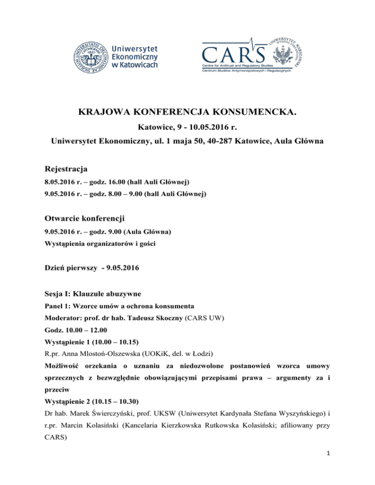 KRAJOWA KONFERENCJA KONSUMENCKA. Katowice, 9 - 10.05.2016 r. Uniwersytet Ekonomiczny, ul. 1 maja 50, 40-287 Katowice, Aula Główna Rejestracja 8.05.2016 r. – godz. 16.00 (hall Auli Głównej) 9.05.2016 r. – godz. 8.00 – 9.00 (hall Auli Głównej) Otwarcie konferencji 9.05.2016 r. – godz. 9.00 (Aula Główna) Wystąpienia organizatorów i gości Dzień pierwszy - 9.05.2016 Sesja I: Klauzule abuzywne Panel 1: Wzorce umów a ochrona konsumenta Moderator: prof. dr hab. Tadeusz Skoczny (CARS UW) Godz. 10.00 – 12.00 Wystąpienie 1 (10.00 – 10.15) R.pr. Anna Mlostoń-Olszewska (UOKiK, del. w Łodzi) Możliwość orzekania o uznaniu za niedozwolone postanowień wzorca umowy sprzecznych z bezwzględnie obowiązującymi przepisami prawa – argumenty za i przeciw Wystąpienie 2 (10.15 – 10.30) Dr hab. Marek Świerczyński, prof. UKSW (Uniwersytet Kardynała Stefana Wyszyńskiego) i r.pr. Marcin Kolasiński (Kancelaria Kierzkowska Rutkowska Kolasiński; afiliowany przy CARS) 1 Wybór prawa obcego w internetowych wzorcach umownych a ochrona konsumenta Wystąpienie 3 (10.30 – 10.45) Jacek Krzemiński (WPiA UMK) Przyszłość arbitrażu konsumenckiego – zapis na polski sąd polubowny jako niedozwolone postanowienie w umowach z konsumentami Kawa – 10.45 – 11.15 Panel 2: Modele kontroli wzorców umownych Moderator: dr Aneta Wiewiórowska-Domagalska (Uniwersytet w Osnabrück) Wystąpienie 1 (godz. 11.15 – 11.30) Krzysztof Lehmann (Del. UOKiK w Bydgoszczy) Eliminowanie postanowień niedozwolonych z wykonywanych umów o charakterze ciągłym w obrocie konsumenckim Wystąpienie 2 (godz. 11.30 – 11.45) Dr Antoni Bolecki (Kancelaria Greenberg Traurig, afiliowany przy CARS) Kontrola incydentalna klauzul abuzywnych Wystąpienie 3 (godz. 11.45 – 12.00) Patrycja Kozik (doktorantka WPiA UJ) Administracyjny może Prezesa efektywnie UOKiK model kontroli kontrolować na gruncie wzorców treść nowelizacji umownych umowy? ustawy Czyli o – nowe ochronie czy organ kompetencje konkurencji i konsumentów Łączna dyskusja do panelu 1 i 2 (godz. 12.00 – 12.30) Sesja II: Zakaz naruszania zbiorowych interesów konsumentów Panel 3: Istota naruszania zbiorowych interesów konsumentów Moderator: dr hab. Monika Namysłowska, prof. UŁ Godz. 12.30 – 13.15 Wystąpienie 1 (12.30 – 12.45) R.pr. Michał Strzelecki (autor bloga praworeklamy.pl) 2 Praktyki naruszające zbiorowe interesy konsumentów w świetle zupełnej harmonizacji praktyk handlowych wynikającej z dyrektywy 2005/29/WRE o nieuczciwych praktykach handlowych Wystąpienie 2: (12.45 – 13.00) Dr Małgorzata Sieradzka (WPiA Uczelni Łazarskiego) Próba dookreślenia terminu ,,zbiorowy interes konsumentów”- definicja oraz jej wyznaczniki Wystąpienie 3: (13.00 – 13.15) Dr Aleksandra Kunkiel-Kryńska (Kancelaria Wierzbowski Eversheds), Naruszenie dobrych obyczajów a praktyka naruszająca zbiorowe interesy konsumentów Dyskusja do panelu 3 – 13.15 – 14.00 Lunch 14.00 – 15.00 Panel 4: Nowe rozwiązania w obszarze przeciwdziałania praktykom naruszającym zbiorowe interesy konsumentów Moderator: Dorota Karczewska (Wiceprezes UOKiK) Godz. 15.00 - 16.00 Wystąpienie 1(15.00 – 15.15) Dr Patrycja Dolniak-Mądrzycka (Akademia Wychowania Fizycznego w Katowicach) Nowy otwarty katalog praktyk naruszających zbiorowe interesy konsumentów Wystąpienie 2 (15.15 – 15.30) Dr Małgorzata Gancar (WPiA KUL) Art. 24 ust. 2 pkt 4 - nowa praktyka naruszająca zbiorowe interesy konsumentów w świetle nowelizacji ustawy o ochronie konkurencji i konsumentów z 2015 r. Wystąpienie 3 (15.30 – 15.45) R.pr Marta Burnecka-Szczepańska (Gł. Specj. w del. UOKiK w Bydgodszczy) Nowe kompetencje Prezesa UOKiK w sprawach praktyk naruszających zbiorowe interesy konsumentów – instytucja tajemniczego klienta (mystery shopper) Wystąpienie 4 (15.45 – 16.00) Jan Szczygieł (doktorant UŚl) Nowa prerogatywa Prezesa Urzędu Ochrony Konkurencji i Konsumentów do przedstawienia istotnego poglądu w sprawie Dyskusja do panelu 4 – 16.00 – 16.30 3 Kawa – 16.30 – 17.00 Panel 5: Materialne i proceduralne konsekwencje stosowania zakazu praktyk naruszających zbiorowe interesy konsumentów Moderator: Dr hab. Anna Piszcz, prof. UwB Godz. 17.00 – 17.45 Wystąpienie 1 (17.00 – 17.15) R.pr. Łukasz Wroński (UOKiK, z-ca dyr. DOIK w UOKiK) Skutki stosowania praktyk naruszających zbiorowe interesy konsumentów a środki ich usunięcia w decyzjach Prezesa UOKiK Wystąpienie 2 (17.15 – 17.30) R. pr. Piotr Suski (doktorant WPiA, UJ, Kancelaria Markiewicz Sroczyński) Modyfikacja warunków umów zawieranych przez przedsiębiorstwa energetyczne i telekomunikacyjne z konsumentami na tle orzecznictwa Prezesa UOKiK w sprawach dotyczących naruszenia zbiorowych interesów konsumentów Wystąpienie 3 (17.30 – 17.45) R.pr. Jan Ulański (doktorant na WPiA UŁ; Dep. Prawny UOKiK) i Agnieszka Szafran (Gł. Specj. w Del. UOKiK w Bydgoszczy) Prejudycjalny charakter decyzji Prezesa UOKiK w indywidualnym sporze konsumenta z przedsiębiorcą (kwestie konsumenckiego private enforcement) Łączna dyskusja do panelu 5 – godz. 17.30 – 18.00 Uroczysta kolacja – 19.00 Dzień drugi – 10.05.2016 Sesja III: Ekonomia ochrony konsumentów Panel 6: Ekonomia ochrony konsumentów - przysporzenie konsumenckie Moderator: dr Marzena Czarnecka (UE w Katowicach) Godz. 10.00 – 11.30 Wystąpienie 1 (10.00 – 10.15) Dr. hab. Monika Namysłowska, prof. UŁ (WPiA Uniwersytetu Łódzkiego) Ekonomia ochrony konsumentów w prawie UE i w prawie polskim 4 Wystąpienie 2 (10.15 – 10.30) R.pr. Jarosław Sroczyński (Kancelaria Markiewicz Sroczyński; afiliowany przy CARS) UOKiK – co my z niego mamy? Próba metodologii badań tzw. przysporzenia konsumenckiego Wystąpienie 3 (10.30 – 10.45) R.pr. Jacek Marczak (Del. UOKiK w Bydgoszczy) Dobrowolne przysporzenie konsumenckie na przykładzie decyzji zobowiązujących Wystąpienie 4 (10.45 – 11.00) R.pr. Maciej Trąbski (Kancelaria 