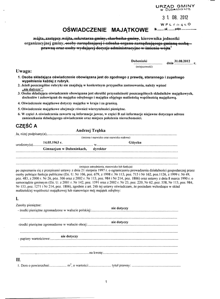 URZAD GMINY w Dub •. n'n\<:~rh 3 1. 08. 2012 w P L '( l'. OSWIADCZENIE MAJATKOWE Nr ••••••••••zol •..••....•. er t. O podpis ..•.•...••••••.._.- :wóJta, :laitep&:)' wóJta, ~ekretar~a glHiR~[,slw:aF~Rili.agmiB;,', kierownika jednostki organizacyjnej gminy, 9seby zanadli\ajaeej i ezleBlla 9FgaBll zanadz;ajaeeg9 gmiRR'l8S8~'l prft"\\'na 6l'ftZ 9S9lJy wydftjaeej deeyzje ftdministFfteyjne w imieniu W6jtS1 Dubeninki dnia ~~.:~~:~~~~... r. (miejscowosc) Uwaga: 1. Osoba skladajaca oswiadczenie obowiazana jest do zgodnego z prawda, starannego i zupelnego wypelnienia kazdej z rubryk. 2. Jezeli poszczególne rubryki nie znajduja w konkretnym przypadku zastosowania, nalezy wpisac "nie dotyczy". 3. Osoba skladajaca oswiadczenie obowiazana jest okreslic przynaleznosc poszczególnych skladników majatkowych, dochodów i zobowiazan do majatku odrebnego i majatku objetego malzenska wspólnoscia majatkowa. 4. Oswiadczenie majatkowe dotyczy majatku 5. Oswiadczenie majatkowe obejmuje w kraju i za granica. równiez wierzytelnosci pieniezne. 6. W czesci A oswiadczenia zawarte sa informacje jawne, w czesci B zas informacje zamieszkania skladajacego oswiadczenie oraz miejsca polozenia nieruchomosci. niejawne dotyczace adresu CZESC A Andrzej Trabka J a, nizej podpisany( a), . (imiona i nazwisko oraz nazwisko rodowe) urodzony( a) 14.05.1963 r. Gimnazjum Gizycku w dyrektor w Dubeninkach, (miejsce zatrudnienia, . stanowisko lub funkcja) po zapoznaniu sie z przepisami ustawy z dnia 2] sierpnia] 997 r. o ograniczeniu prowadzenia dzialalnosci gospodarczej przez osoby pelniace funkcje publiczne (Dz. U. Nr ]06, poz. 679, z 1998 r. Nr ] ]3, poz. 7]5 i Nr ]62, poz.] ]26, z 1999 r. Nr 49, póz. 483, z 2000 r. Nr 26, póz. 306 oraz z 2002 r. Nr I] 3, poz. 984 i Nr 2 ]4, poz. ] 806) oraz ustawy z dnia 8 marca] 990 r. o samorzadzie gminnym (Dz. U. z 2001 r. Nr 142, poz. 159] oraz z 2002 r. Nr 23, poz. 220, Nr 62, poz. 558, Nr] ]3, poz. 984, Nr 153, poz. 1271 i Nr 214, poz. 1806), zgodnie z art. 24h tej ustawy oswiadczam, ze posiadam wchodzace w sklad malzenskiej wspólnosci majatkowej lub stanowiace mój majatek odrebny: l. Zasoby pieniezne: . dk'l pIenlezne . '. - sro zgroma d zone w wa I'uCle po 1s k'ieJ'. . .... ". -srodki plenlezne zgromadzone w walucie obcej . . . - papIery wartosclOwe: nie dotyczy nie dotyczy nie dotyczy .................•.......................................................... . . . ..na kwote: . II. I . Dom o powlerzc . h'ni: ? o wartoscI:. • m-, tytu l prawny: . . . . . . 2. MIeszkanIe o pOwIerzchm: 3. Gospodarstwo rolne: rodzaj gospodarstwa: o wartosci: rodzaj zabudowy: tytul prawny: : Z tego tytulu osiagnalem(elam) 4. Inne nieru~homo~ci: pOwIerzchnIa: . o wartoscI: 66,5 2 . m , o wartoscI: 120000 zl ~~~.A~!y.~~.Y. tytul prawny: wlasciciel . powierzchn ia: . . . . w roku ubieglym przychód i dochód w wysokosci: garaz 16 . m2 . 6000 zl . wlasciciel tytul prawny: . III. Posiadam udzialy w spólkach handlowych - nalezy podac liczbe i emitenta udzialów: .................... nie dotyczy . udzialy te stanowia pakiet wiekszy niz 10% udzialów w spólce: . Z tego tytulu osiagnalem(elam) . w roku ubieglym dochód w wysokosci: IV. Posiadam akcje w spólkach handlowych - nalezy podac Iiczbe i emitenta akcji: ........................................ nie dotyczy . akcje te stanowia pakiet wiekszy niz 10% akcji w spólce: . Z tego tytulu osiagnalem(elam) . w roku ubieglym dochód w wysokosci: V. Nabylem(am) (nabyl mój malzonek, z wylaczeniem mienia przynaleznego do jego majatku odrebnego) od Skarbu Panstwa, innej panstwowej osoby prawnej, jednostek samorzadu terytorialnego, ich zwiazków lub od komunalnej osoby prawnej nastepujace mienie, które podlegalo zbyciu w drodze przetargu - nalezy podac opis mienia i date nabycia, od kogo:............ nie dotyczy . VI. 1. Prowadze dzialalnosc gospodarcza2 (nalezy podac forme prawna i przedmiot dzialalnosci): ................................................ nie dotyczy - osobiscie: - wspólnie z innymi osobami: Z tego tytulu osiagnalem(elam) . . . . w roku ubieglym przychód i dochód w wysokosci: 2 . 2. Zarzadzam dzialalnoscia gospodarcza lub jestem przedstawicielem, forme prawna i przedmiot dzialalnosci): pelnomocnikiem ~.i.~.~.~.~~~~.~ : takiej dzialalnosci (nalezy podac . - osob iscie . - wspólnie z innymi osobami . Z tego tytulu osiagnalem(elam) w roku ubieglym dochód w wysokosci: . VII. l. W spólkach handlowych (nazwa, siedzi ba spólki):............... - jestem czlonkiem zarzadu (od kiedy): nie dotyczy . . - jestem czlonkiem rady nadzorczej (od kiedy): . - jestem czlonkiem komisji rewizyjnej (od kiedy): Z tego tytulu osiagnalem(elam) 2. . w roku ubieglym dochód w wysokosci: . W spóldzielniach: nie dotyczy - jestem czlonkiem zarzadu (od kiedy): - jestem czlonkiem rady nadzorcze/ . (od kiedy): ..........................................................................•....................... - jestem czlonkiem komisji rewizyjnej (od kiedy): Z tego tytulu osiagnalem(elam) . w roku ubieglym dochód w wysokosci: 3. W fundacjach prowadzacych dzialalnosc gospodarcza: ............... . nie dotyczy - jestem czlonkiem zarzadu (od kiedy): . -jestem czlonkiem rady nadzorczej (od kiedy): . - jestem czlonkiem komisji rewizyjnej (od kiedy): Z tego tytulu osiagnalem(elam) . w roku ubieglym dochód w wysokosci: . VIII. Inne dochody osiagane z tytulu zatrudnienia lub innej dzialalnosci zarobkowej lub zajec, z podaniem kwot uzyskiwanych z kazdego tytulu:................................ ze stosunku pracy 67464,77 zl 3 IX. Skladniki mienia ruchomego o wartosci powyzej 10000 zlotych (w przypadku pojazdów mechanicznych model i rok produkcji): samochód osobowy opel Astra 2009 nalezy podac marke, . X. Zobowiazania pieniezne o wartosci powyzej 10 000 zlotych, w tym zaciagniete kredyty i pozyczki oraz warunki, na jakich zostaly udzielone (wobec kogo, w zwiazku zjakim zdarzeniem, w jakiej wysokosci): . nie dotyczy . 4 Powyzsze o