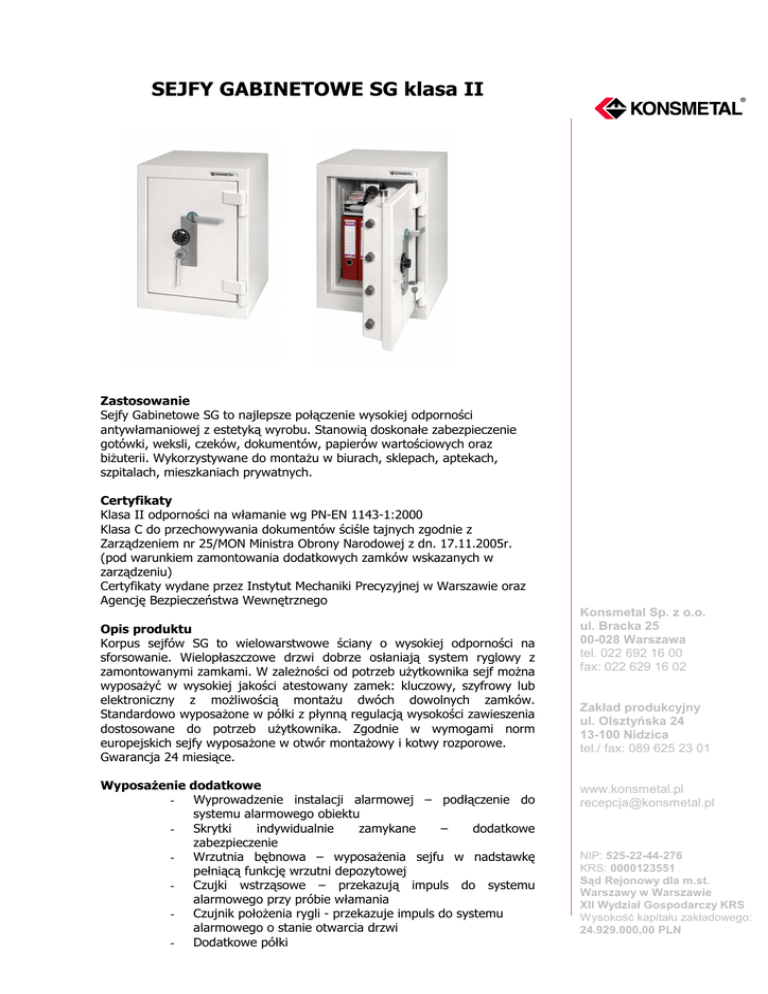 SEJFY GABINETOWE SG klasa II Zastosowanie Sejfy Gabinetowe SG to najlepsze połączenie wysokiej odporności antywłamaniowej z estetyką wyrobu. Stanowią doskonałe zabezpieczenie gotówki, weksli, czeków, dokumentów, papierów wartościowych oraz biŜuterii. Wykorzystywane do montaŜu w biurach, sklepach, aptekach, szpitalach, mieszkaniach prywatnych. Certyfikaty Klasa II odporności na włamanie wg PN-EN 1143-1:2000 Klasa C do przechowywania dokumentów ściśle tajnych zgodnie z Zarządzeniem nr 25/MON Ministra Obrony Narodowej z dn. 17.11.2005r. (pod warunkiem zamontowania dodatkowych zamków wskazanych w zarządzeniu) Certyfikaty wydane przez Instytut Mechaniki Precyzyjnej w Warszawie oraz Agencję Bezpieczeństwa Wewnętrznego Opis produktu Korpus sejfów SG to wielowarstwowe ściany o wysokiej odporności na sforsowanie. Wielopłaszczowe drzwi dobrze osłaniają system ryglowy z zamontowanymi zamkami. W zaleŜności od potrzeb uŜytkownika sejf moŜna wyposaŜyć w wysokiej jakości atestowany zamek: kluczowy, szyfrowy lub elektroniczny z moŜliwością montaŜu dwóch dowolnych zamków. Standardowo wyposaŜone w półki z płynną regulacją wysokości zawieszenia dostosowane do potrzeb uŜytkownika. Zgodnie w wymogami norm europejskich sejfy wyposaŜone w otwór montaŜowy i kotwy rozporowe. Gwarancja 24 miesiące. WyposaŜenie dodatkowe - Wyprowadzenie instalacji alarmowej – podłączenie do systemu alarmowego obiektu - Skrytki indywidualnie zamykane – dodatkowe zabezpieczenie - Wrzutnia bębnowa – wyposaŜenia sejfu w nadstawkę pełniącą funkcję wrzutni depozytowej - Czujki wstrząsowe – przekazują impuls do systemu alarmowego przy próbie włamania - Czujnik połoŜenia rygli - przekazuje impuls do systemu alarmowego o stanie otwarcia drzwi - Dodatkowe półki Konsmetal Sp. z o.o. ul. Bracka 25 00-028 Warszawa tel. 022 692 16 00 fax: 022 629 16 02 Zakład produkcyjny ul. Olsztyńska 24 13-100 Nidzica tel./ fax: 089 625 23 01 www.konsmetal.pl [email protected] NIP: 525-22-44-276 KRS: 0000123551 Sąd Rejonowy dla m.st. Warszawy w Warszawie XII Wydział Gospodarczy KRS Wysokość kapitału zakładowego: 24.929.000,00 PLN Rodzaje zamków: kluczowy szyfrowy mechaniczny elektroniczny Standardowe kolory: jasnoszary RAL 9002 czarny RAL 9005 * na indywidualne zamówienie wszystkie kolory z palety RAL (lakier proszkowy) Wrzutnia bębnowa (depozytowa) WBX1, WBX2 (do SGP) - klasa S2 wg PN-EN 14450, WBX3 - klasa D-II wg PN-EN 11430-2:2004 Konsmetal Sp. z o.o. ul. Bracka 25 00-028 Warszawa tel. 022 692 16 00 fax: 022 629 16 02 Rodzaj wrzutni WBX1, WBX3 WBX2 (do SGP) Wysokość wrzutni W [mm] 220 240 Wielkość wrzucanego przedmiotu W [mm] 55 55 S [mm] 225 275 G [mm] 100 140 Eksploatacja UŜytkowanie wyrobów winno odbywać się w pomieszczeniach zabezpieczonych przed działaniem czynników atmosferycznych z dala od substancji działających korodująco na metale. Wilgotność względna w pomieszczeniu do 75%. Urządzenie moŜe pracować w pomieszczeniach, w których temperatura mieści się w granicach od +5°C do +40°C. Zakład produkcyjny ul. Olsztyńska 24 13-100 Nidzica tel./ fax: 089 625 23 01 www.konsmetal.pl [email protected] NIP: 525-22-44-276 KRS: 0000123551 Sąd Rejonowy dla m.st. Warszawy w Warszawie XII Wydział Gospodarczy KRS Wysokość kapitału zakładowego: 24.929.000,00 PLN