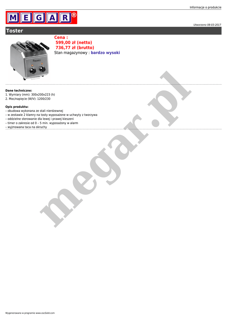 Informacje o produkcie Utworzono 08-03-2017 Toster Cena : 599,00 zł (netto) 736,77 zł (brutto) Dane techniczne: 1. Wymiary (mm): 300x200x223 (h) 2. Moc/napięcie (W/V): 1200/230 m eg ar Opis produktu: – obudowa wykonana ze stali nierdzewnej – w zestawie 2 klamry na tosty wyposażone w uchwyty z tworzywa – oddzielne sterowanie dla lewej i prawej kieszeni – timer o zakresie od 0 – 5 min. wyposażony w alarm – wyjmowana taca na okruchy .p l Stan magazynowy : bardzo wysoki Wygenerowano w programie www.oscGold.com