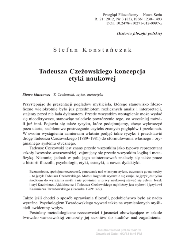Przegląd Filozoficzny – Nowa Seria R. 21: 2012, Nr 3 (83), ISSN 1230–1493 DOI: 10.2478/v10271-012-0097-z Historia filozofii polskiej Stefan Konstańczak Tadeusza Czeżowskiego koncepcja etyki naukowej Słowa kluczowe: T. Czeżowski, etyka, metaetyka Przystępując do prezentacji poglądów myśliciela, którego stanowisko filozoficzne wielokrotnie było już przedmiotem rozlicznych analiz i interpretacji, stajemy przed nie lada dylematem. Przede wszystkim wystąpienie może wydać się nieodkrywcze, stanowiąc zaledwie powtórzenie tego, co wcześniej mówili już inni. Pojawia się także ryzyko, które podejmujemy, chcąc wykroczyć poza utarte, szablonowe postrzeganie czyichś znanych poglądów i przekonań. W swoim wystąpieniu zamierzam właśnie podjąć takie ryzyko i przedstawić drogę Tadeusza Czeżowskiego (1889–1981) do sformułowania własnego i oryginalnego systemu etycznego. Tadeusz Czeżowski jest znany przede wszystkim jako typowy reprezentant szkoły lwowsko-warszawskiej, zajmujący się przede wszystkim logiką i metafizyką. Niemniej jednak w polu jego zainteresowań znalazły się także prace z historii filozofii, psychologii, etyki, estetyki, a nawet dydaktyki. Beznamiętna, spokojna rzeczowość, panowanie nad własnym stylem, trzymanie go na wodzy – to język Tadeusza Czeżowskiego. Mało u kogo tak wyraźnie się czuje, że język jest tylko środkiem do wyrażania myśli i nie powinien w pracy naukowej stawać się celem. Język i styl Kazimierza Ajdukiewicz i Tadeusza Czeżowskiego najbliższy jest stylowi i językowi Kazimierza Twardowskiego (Rzeuska 1969: 322). Także jeśli chodzi o sposób uprawiania filozofii, podobieństwo było aż nadto wyraźne. Psychologizm Twardowskiego wywarł także na wymienionych myślicieli ewidentny wpływ. Postulaty metodologiczne rzeczowości i jasności obowiązujące w szkole lwowsko-warszawskiej zmuszały jej uczniów do studiów nad zagadnieniaUnauthenticated | 89.67.242.59 Download Date | 6/2/13 8:46 PM 548 Stefan Konstańczak mi ludzkich motywacji i preferencji. Problematyka aksjologiczna była zatem podejmowana niejako równolegle z zagadnieniami psychologicznymi. Nie inaczej było również w przypadku Czeżowskiego, który wkrótce po swoim doktoracie (1914) zajął się aksjologią. Świadczy o tym choćby list Kazimierza Twardowskiego datowany na 11 sierpnia 1915 r., w którym pisze on o swej próbie, na prośbę przebywającego podówczas w Wiedniu Czeżowskiego, wydobycia z biurka w jego pokoju w Domu Akademickim we Lwowie rękopisu pracy Kilka twierdzeń z formalnej teorii wartości (Twardowski 1915). W wersji drukowanej tekst ten ukazał się w „Przeglądzie Filozoficznym” w 1919 r. Wówczas Czeżowski pisał jeszcze o wartościach, które traktuje „jako pewną własność przedmiotów”. Zauważył także, że problematyka aksjologiczna dotąd była domeną głównie nauk psychologicznych oraz ekonomii, w jego zaś propozycji oparta została „na logice symbolicznej, której określenia i twierdzenia znajdują nowe zastosowanie” (Czeżowski 1989: 121). Wprowadził wówczas pewne elementy teorii klas, którą rozwinął w swoim doktoracie z 1914 r. dla porównywania niewspółmiernych wartości. Tekst jest napisany zgodnie z przekonaniami logicystów, choć Czeżowski próbował na koniec wykazać, że w życiu codziennym również dokonuje się analogicznych porównań, jak proponowane w jego artykule. Świadectwem takiego stanu rzeczy jest rola pieniądza w społeczeństwie, „nabywamy zań przedmioty posiadające różnorodne wartości, płacimy taką kwotę, jaka wartości odpowiada; przy tym sam dla siebie wzięty pieniądz żadnej z tych wartości, które maja przedmioty nabywane, nie posiada” (Czeżowski 1989: 129). Jest to ważne stwierdzenie, które ostatecznie doprowadziło Czeżowskiego do próby sformułowania programu etyki jako nauki empirycznej. W żadnym wypadku nie można traktować ówczesnej jego propozycji jako kolejnego systemu etycznego. Było to bowiem wskazanie na możliwość zbudowania aksjologii zgodnej z zasadami logiki i zdrowego rozsądku. Co istotne, nie stało to także w sprzeczności z programem etyki naukowej realizowanym przez Kazimierza Twardowskiego. Ponadto oddaje to pewną prawidłowość ewolucji twórczej, którą można zaobserwować wśród wielu znaczących przedstawicieli szkoły lwowsko-warszawskiej: rozpoczynali oni swą pracę naukową jako logicy, a nawet matematycy, aby ostatecznie zająć się zagadnieniami etyki i estetyki. Charakterystycznym tego przykładem była Maria Ossowska, zajmująca się semantyką, z której obroniła również swoją habilitację, aby po wojnie poświęcić się bez reszty problematyce etyki. Równie charakterystyczne było w tym względzie stanowisko twórcy koncepcji etyki niezależnej, Tadeusza Kotarbińskiego. W mniejszym stopniu dotyczyło to Kazimierza Ajdukiewicza, Władysława Witwickiego, Zygmunta Zawirskiego oraz Izydory Dąmbskiej. Unauthenticated | 89.67.242.59 Download Date | 6/2/13 8:46 PM Tadeusza Czeżowskiego koncepcja etyki naukowej 549 Projekt etyki naukowej Tadeusza Czeżowskiego Dyskusyjne jest twierdzenie, że Czeżowski od początku swego zainteresowania problematyką wartości budował jakiś specyficzny system etyki niezależnej. Żaden znany jego tekst nie daje podstaw do sformułowania poglądu tego rodzaju. W świetle publikacji i zachowanych materiałów archiwalnych należałoby mówić o programie etyki naukowej realizowanym przez tego filozofa. Etyka niezależna została rozpropagowana przez Tadeusza Kotarbińskiego, a poprzez dyskusje i kontrowersje, jakie wywoływała, nietrafnie jest uznawana za przeciwieństwo etyk zorientowanych religijnie. Prawdą jest tylko to, że w szkole lwowsko-warszawskiej podejmowano dyskusje nad tym, jakie istnieją uwarunkowania stanowisk etycznych i dlaczego jednym z takich uwarunkowań może być religia. Chodziło tu jednak o projekt etyki na