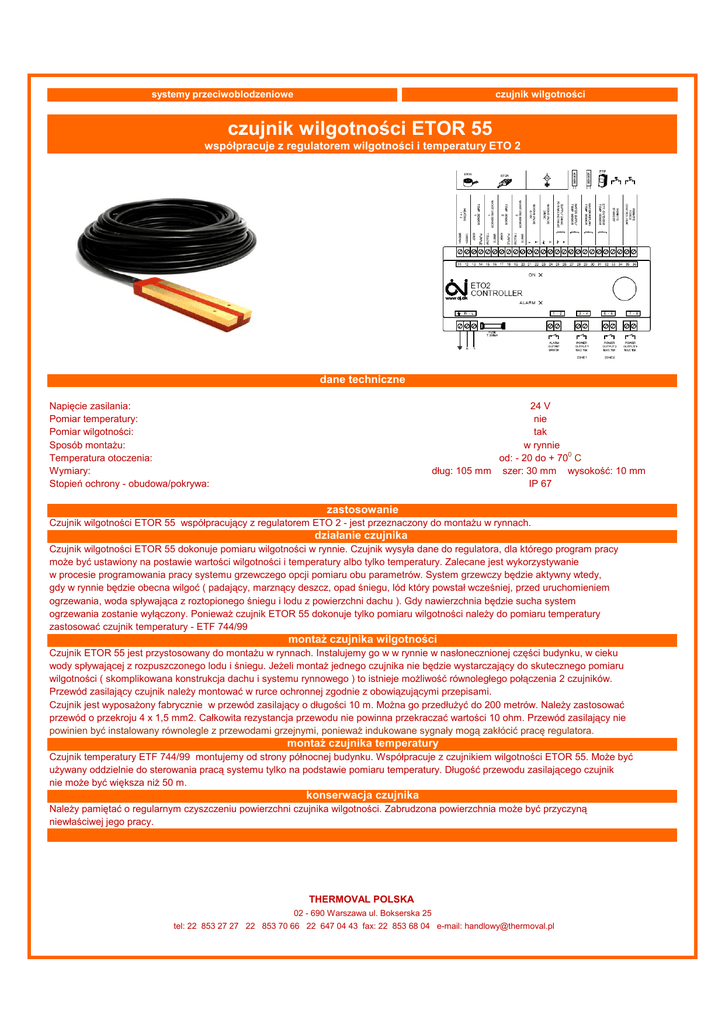 czujnik wilgotności systemy przeciwoblodzeniowe czujnik wilgotności ETOR 55 współpracuje z regulatorem wilgotności i temperatury ETO 2 dane techniczne Napięcie zasilania: Pomiar temperatury: Pomiar wilgotności: Sposób montażu: Temperatura otoczenia: Wymiary: Stopień ochrony - obudowa/pokrywa: 24 V nie tak w rynnie od: - 20 do + 700 C dług: 105 mm szer: 30 mm wysokość: 10 mm IP 67 zastosowanie Czujnik wilgotności ETOR 55 współpracujący z regulatorem ETO 2 - jest przeznaczony do montażu w rynnach. działanie czujnika Czujnik wilgotności ETOR 55 dokonuje pomiaru wilgotności w rynnie. Czujnik wysyła dane do regulatora, dla którego program pracy może być ustawiony na postawie wartości wilgotności i temperatury albo tylko temperatury. Zalecane jest wykorzystywanie w procesie programowania pracy systemu grzewczego opcji pomiaru obu parametrów. System grzewczy będzie aktywny wtedy, gdy w rynnie będzie obecna wilgoć ( padający, marznący deszcz, opad śniegu, lód który powstał wcześniej, przed uruchomieniem ogrzewania, woda spływająca z roztopionego śniegu i lodu z powierzchni dachu ). Gdy nawierzchnia będzie sucha system ogrzewania zostanie wyłączony. Ponieważ czujnik ETOR 55 dokonuje tylko pomiaru wilgotności należy do pomiaru temperatury zastosować czujnik temperatury - ETF 744/99 montaż czujnika wilgotności Czujnik ETOR 55 jest przystosowany do montażu w rynnach. Instalujemy go w w rynnie w nasłonecznionej części budynku, w cieku wody spływającej z rozpuszczonego lodu i śniegu. Jeżeli montaż jednego czujnika nie będzie wystarczający do skutecznego pomiaru wilgotności ( skomplikowana konstrukcja dachu i systemu rynnowego ) to istnieje możliwość równoległego połączenia 2 czujników. Przewód zasilający czujnik należy montować w rurce ochronnej zgodnie z obowiązującymi przepisami. Czujnik jest wyposażony fabrycznie w przewód zasilający o długości 10 m. Można go przedłużyć do 200 metrów. Należy zastosować przewód o przekroju 4 x 1,5 mm2. Całkowita rezystancja przewodu nie powinna przekraczać wartości 10 ohm. Przewód zasilający nie powinien być instalowany równolegle z przewodami grzejnymi, ponieważ indukowane sygnały mogą zakłócić pracę regulatora. montaż czujnika temperatury Czujnik temperatury ETF 744/99 montujemy od strony północnej budynku. Współpracuje z czujnikiem wilgotności ETOR 55. Może być używany oddzielnie do sterowania pracą systemu tylko na podstawie pomiaru temperatury. Długość przewodu zasilającego czujnik nie może być większa niż 50 m. konserwacja czujnika Należy pamiętać o regularnym czyszczeniu powierzchni czujnika wilgotności. Zabrudzona powierzchnia może być przyczyną niewłaściwej jego pracy. THERMOVAL POLSKA 02 - 690 Warszawa ul. Bokserska 25 tel: 22 853 27 27 22 853 70 66 22 647 04 43 fax: 22 853 68 04 e-mail: [email protected]