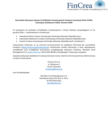 Komunikat dotyczący wykupu Certyfikatów Inwestycyjnych funduszy Inwestycje Rolne FIZAN, Inwestycje Selektywne FIZAN, Vivante FIZAN W nawiązaniu do wykupów Certyfikatów Inwestycyjnych z Dniem Wykupu przypadającym na 31 grudnia 2016 r., realizowanych w funduszach: Inwestycje Rolne Fundusz Inwestycyjny Zamknięty Aktywów Niepublicznych, Inwestycje Selektywne Fundusz Inwestycyjny Zamknięty Aktywów Niepublicznych, Vivante Fundusz Inwestycyjny Zamknięty Aktywów Niepublicznych („Fundusze”), Towarzystwo informuje, że na stronach przeznaczonych do publikacji informacji dla uczestników Funduszy (https://fincrea.pl/pl/informacje/) umieszczona została informacja o ilości wykupionych certyfikatów oraz szczegółowe komentarze zarządzającego aktywami Funduszy- Meridian Fund Management S.A. (www.mfmsa.pl +48 22 842 98 00) („Zarządzający”) dotyczące wykupów. Zapytania dotyczące działalności Funduszy kierować można również w formie pisemnej i elektronicznej na adres Towarzystwa: FinCrea TFI S.A. ul. Wiosenna 5 53-017 Wrocław [email protected] oraz Zarządzającego: Meridian Fund Management S.A. Stanisława Żaryna 2B, bud. D, VIII p. 02-593 Warszawa [email protected]