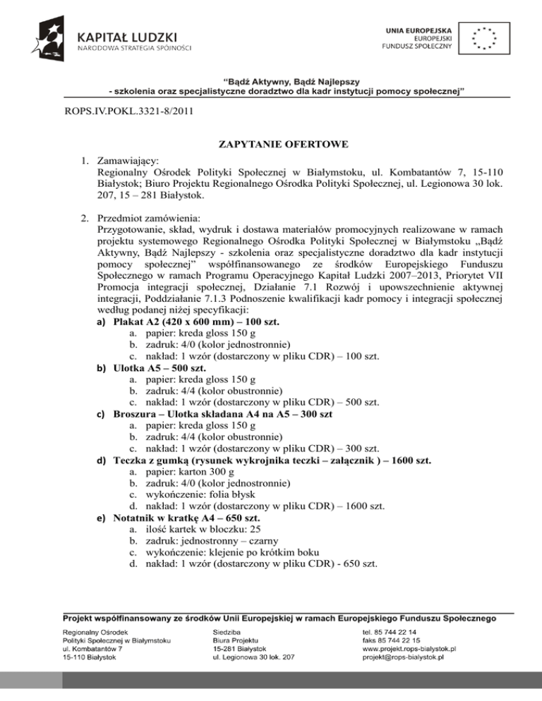 ROPS.IV.POKL.3321-8/2011 ZAPYTANIE OFERTOWE 1. Zamawiający: Regionalny Ośrodek Polityki Społecznej w Białymstoku, ul. Kombatantów 7, 15-110 Białystok; Biuro Projektu Regionalnego Ośrodka Polityki Społecznej, ul. Legionowa 30 lok. 207, 15 – 281 Białystok. 2. Przedmiot zamówienia: Przygotowanie, skład, wydruk i dostawa materiałów promocyjnych realizowane w ramach projektu systemowego Regionalnego Ośrodka Polityki Społecznej w Białymstoku „Bądź Aktywny, Bądź Najlepszy - szkolenia oraz specjalistyczne doradztwo dla kadr instytucji pomocy społecznej” współfinansowanego ze środków Europejskiego Funduszu Społecznego w ramach Programu Operacyjnego Kapitał Ludzki 2007–2013, Priorytet VII Promocja integracji społecznej, Działanie 7.1 Rozwój i upowszechnienie aktywnej integracji, Poddziałanie 7.1.3 Podnoszenie kwalifikacji kadr pomocy i integracji społecznej według podanej niżej specyfikacji: a) Plakat A2 (420 x 600 mm) – 100 szt. a. papier: kreda gloss 150 g b. zadruk: 4/0 (kolor jednostronnie) c. nakład: 1 wzór (dostarczony w pliku CDR) – 100 szt. b) Ulotka A5 – 500 szt. a. papier: kreda gloss 150 g b. zadruk: 4/4 (kolor obustronnie) c. nakład: 1 wzór (dostarczony w pliku CDR) – 500 szt. c) Broszura – Ulotka składana A4 na A5 – 300 szt a. papier: kreda gloss 150 g b. zadruk: 4/4 (kolor obustronnie) c. nakład: 1 wzór (dostarczony w pliku CDR) – 300 szt. d) Teczka z gumką (rysunek wykrojnika teczki – załącznik ) – 1600 szt. a. papier: karton 300 g b. zadruk: 4/0 (kolor jednostronnie) c. wykończenie: folia błysk d. nakład: 1 wzór (dostarczony w pliku CDR) – 1600 szt. e) Notatnik w kratkę A4 – 650 szt. a. ilość kartek w bloczku: 25 b. zadruk: jednostronny – czarny c. wykończenie: klejenie po krótkim boku d. nakład: 1 wzór (dostarczony w pliku CDR) - 650 szt. 3. 4. 5. 6. 7. 8. 9. f) Długopis plastikowy z ergonomicznym uchwytem i wkładem zawierającym niebieski tusz – 1000 szt. a. model o parametrach takich samych lub zbliżonych jak w modelu: SCHNEIDER LOOX niebieski/granatowy b. wkład do długopisu o terminie ważności nie krótszym niż 1 rok od dnia dostawy c. zadruk: jednokolorowy w dwóch miejscach na rurce d. ilość: 1 wzór (dostarczony w pliku CDR) – 1000 szt. g) Zestaw do pisania (długopis+ołówek+etui) – 200 szt. a. długopis: automatyczny, wkład zawierający niebieski tusz, grubość linii: 0,5 mm; długość linii pisania 3500 m b. ołówek: automatyczny, grafit: 0,5 – 0,7 mm, twardość HB = 2 ½ ; polimerowy rysik; c. obudowa długopisu i ołówka zbliżona do modelu: SCHNEIDER LOOX niebieski/granatowy lub równoważny d. zadruk: jednokolorowy e. etui f. ilość: 1 wzór (dostarczony w pliku CDR) – 200 szt. h) Kalendarz książkowy A5 na 2012 rok z tłoczeniem – 200 szt. a. wnętrze: jeden dzień na stronie b. oprawa: sztywna, skóropodobna zmiękczana c. kalendarium w języku polskim d. kolor oprawy do wyboru: brązowy, zielony, granatowy e. registry boczne f. zakładka g. rok tłoczony na okładce h. ilość: 1 wzór tłoczenia (dostarczony w pliku CDR) – 200 szt. i) Zakreślacz z zakładkami indeksującymi 2 w 1 (wygląd zbliżony do modelu Post-it® lub równoważny) – 750 szt. a. tusz na bazie wody b. szerokość linii pisania: 1 – 5 mm c. kolor: żółty lub zielony d. ergonomiczny kształt e. szeroki, gumowany uchwyt – z wbudowanym podajnikiem z zakładkami f. zadruk: jednokolorowy g. ilość: 1 wzór (dostarczony w pliku CDR) – 750 szt. Termin realizacji zamówienia: luty – grudzień 2011 r. Okres gwarancji: nie dotyczy. Miejsce i termin złożenia oferty: Regionalny Ośrodek Polityki Społecznej w Białymstoku, Biuro Projektu, ul. Legionowa 30 lok 207, 15-281 Białystok. Termin złożenia oferty do: 14 luty 2011 r. Termin rozstrzygnięcia zapytania: 15 luty 2011 r. Warunki płatności: Przelew po wykonaniu usługi na podstawie wystawionej faktury VAT po dostarczeniu do siedziby Zamawiającego przedmiotu umowy wraz z fakturą VAT. Płatność z tytułu wykonania umowy będzie dokonana nie wcześniej niż i pod warunkiem przekazania przez Instytucję Wdrażającą środków finansowych służących finansowaniu umowy na wyodrębniony rachunek bankowy Zamawiającego Osoba upoważniona do kontaktu z wykonawcami: Ewelina Nowik Sposób przygotowania oferty: ofertę należy sporządzić w formie pisemnej, w języku polskim. 10. Treść oferty: 1. nazwa wykonawcy: …………………………………………………………… 2. adres wykonawcy: ……………………………………………………………. 3. NIP: …………………………………………………………………………… 4. Regon: ………………………………………………………………………… 5. nr rachunku bankowego: ……………………………………………………… 6. Oferuję wykonanie przedmiotu zamówienia w następującej cenie: Ilość sztuk / Opis Wartość netto Wartość brutto nakład Plakat A2 (420 x 600 mm) 100 Ulotka A5 500 Broszura – Ulotka składana A4 na A5 300 Teczka z gumką 1600 Notatnik w kratkę A4 650 Długopis plastikowy z wkładem zawierającym niebieski tusz 1000 Zestaw do pisania (długopis+ołówek+etui) 200 Kalendarz książkowy A5 na 2012 rok 200 Zakreślacz z zakładkami indeksującymi 2 w 1 750 RAZEM 7. Szczegółowy opis oferty wykonania usługi zawierający koszt jednostkowy usługi z wyszczególnieniem świadczeń – nie dotyczy 8. Zamawiający zastrzega sobie prawo do zmiany lub rezygnacji z poszczególnych asortymentów i ich nakładu oraz liczby asortymentów zawartych w przedmiocie zamówienia. W tym wypadku wykonawca zobowiązany będzie do obliczenia i wskazania nowej ceny wykonania przedmiotu zamówienia, uwzględniając zmianę lub rezygnację z poszczególnych asortymentów i ich nakładu oraz liczby asortymentów. 9. Zamawiający zastrzega sobie prawo do unieważnienia postępowania w każdym
