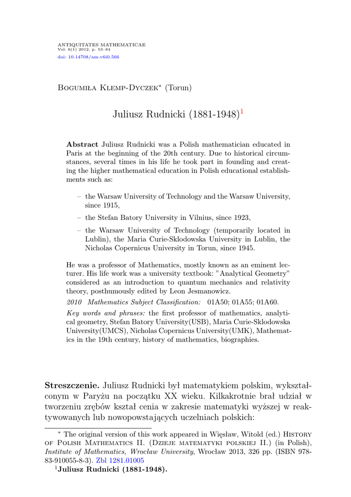 ANTIQUITATES MATHEMATICAE Vol. 6(1) 2012, p. 53–84 doi: 10.14708/am.v6i0.566 Bogumiła Klemp-Dyczek∗ (Torun) Juliusz Rudnicki (1881-1948)1 Abstract Juliusz Rudnicki was a Polish mathematician educated in Paris at the beginning of the 20th century. Due to historical circumstances, several times in his life he took part in founding and creating the higher mathematical education in Polish educational establishments such as: – the Warsaw University of Technology and the Warsaw University, since 1915, – the Stefan Batory University in Vilnius, since 1923, – the Warsaw University of Technology (temporarily located in Lublin), the Maria Curie-Sklodowska University in Lublin, the Nicholas Copernicus University in Torun, since 1945. He was a professor of Mathematics, mostly known as an eminent lecturer. His life work was a university textbook: ”Analytical Geometry” considered as an introduction to quantum mechanics and relativity theory, posthumously edited by Leon Jesmanowicz. 2010 Mathematics Subject Classification: 01A50; 01A55; 01A60. Key words and phrases: the first professor of mathematics, analytical geometry, Stefan Batory University(USB), Maria Curie-Sklodowska University(UMCS), Nicholas Copernicus University(UMK), Mathematics in the 19th century, history of mathematics, biographies. Streszczenie. Juliusz Rudnicki był matematykiem polskim, wykształconym w Paryżu na początku XX wieku. Kilkakrotnie brał udział w tworzeniu zrębów kształ cenia w zakresie matematyki wyższej w reaktywowanych lub nowopowstających uczelniach polskich: ∗ The original version of this work appeared in Więsław, Witold (ed.) History of Polish Mathematics II. (Dzieje matematyki polskiej II.) (in Polish), Institute of Mathematics, Wrocław University, Wrocław 2013, 326 pp. (ISBN 97883-910055-8-3). Zbl 1281.01005 1 Juliusz Rudnicki (1881-1948). ii Juliusz Rudnicki (1881-1948) – od 1915 na Politechnice Warszawskiej i na Uniwersytecie Warszawskim, – od 1923 na Uniwersytecuie Stefana Batorego w Wilnie, – od 1945 na Politechnice Warszawskiej ( z tymczasową siedzibą w Lublinie), na Uniwersytecie Marii Curie-Skłodowskiej w Lublinie, na Uniwersytecie Mikołaja Kopernika w Toruniu. Był profesorem matematyki, znanym przede wszystkim jako płomienny wykładowca. Jego dziełem życia był podręcznik ”Geometria Analityczna”, pomyślany jako wstęp do mechaniki kwantowej i teorii względności, pośmiertnie opracowany przez Leona Jeśmanowicza. Słowa kluczowe: pierwszy profesor matematyki, USB, UMCS, UMK, geometria analityczna, historia nauk ścisłych, historia matematyki polskiej, biogramy Bogumiła Klemp-Dyczek Nicolaus Copernicus University Faculty of Mathematics and Computer Science ul. Chopina 12/18, 87-100 Toruń, Polska E-mail: [email protected] Communicated by: Witold Więsław (Received: 23rd November 2012)