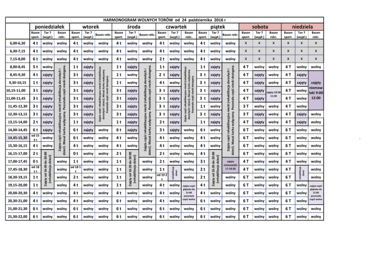 HARMONOGRAM WOLNYCH TORÓW od 24 października 2016 r poniedziałek Tor 7 Basen Basen rekr. (wypł.) sport. Tor 7 Basen Basen rekr. (wypł.) sport. piątek Tor 7 (wypł.) Basen rekr. Basen sport. sobota Tor 7 Basen Basen rekr. (wypł.) sport. niedziela Tor 7 (wypł.) Basen rekr. Basen sport. Tor 7 (wypł.) Basen rekr. 4t wolny wolny 4t wolny wolny 4t wolny wolny 4t wolny wolny X X X X X X 6,30-7,15 4t wolny wolny 4t wolny wolny 4t wolny wolny 4t wolny wolny 4t wolny wolny X X X X X X 7,15-8,00 6t wolny wolny 4t wolny wolny 4t wolny wolny 2t wolny wolny 4t wolny wolny X X X X X X 8,00-8,45 5t wolny 1t zajęty 1t zajęty 1t zajęty 1t zajęty wolny wolny 4T wolny wolny 8,45-9,30 4t zajęty 3t zajęty 1t wolny 2 t zajęty 3 t zajęty 4T zajęty wolny 4T zajęty 9,30-10,15 1t zajęty 3t zajęty 1t wolny 4t wolny 3 t zajęty 4T zajęty wolny 4T zajęty 10,15-11,00 3t zajęty 3t zajęty 3t zajęty 3 t zajęty 3 t zajęty 4T zajęty 11,00-11,45 3t zajęty 3t zajęty 3t zajęty 3 t zajęty 3 t zajęty 4T zajęty 11,45-12,30 3t zajęty 3t zajęty 3t zajęty 3 t zajęty 1t wolny 3T wolny 12,30-13,15 3t zajęty 3t zajęty 3t zajęty 3 t zajęty 3 t zajęty 3T 13,15-14,00 2t zajęty 1t zajęty 1t zajęty 2t zajęty 1t zajęty 14,00-14,45 6t zajęty 6t zajęty wolny 6t zajęty 3t zajęty wolny 6t wolny 6t wolny wolny 4t wolny 4t wolny wolny 4t wolny 4t wolny wolny 4t wolny 4t wolny wolny 4t wolny 0t wolny wolny 2t 2t wolny wolny 4t wolny 1t wolny wolny 1t wolny 2t wolny wolny 3t od 18 1 wolny t wolny 1t wolny 1t wolny 2t wolny od 19 2 t wolny 2t wolny 4t wolny 15,30-16,15 4t 16,15-17,00 2t 17,00-17,45 0t 17,45-18,30 od 18 1t 18,30-19,15 1t 19,15-20,00 1t 20,00-20,30 4t 20,30-21,00 wolny 2t wolny wolny 1t wolny 4t wolny wolny 1t Zajęty od 16:30 do 20:00 (rehabilitacja dzieci) wolny wolny wolny 4t wolny wolny 4t wolny wolny 4t wolny 4t wolny wolny 4t wolny wolny 6t wolny wolny 4t wolny 21,00-21,30 6t wolny wolny 6t wolny wolny 6t wolny wolny 6t wolny 21,30-22,00 6t wolny wolny 6t wolny wolny 6t wolny wolny 6t wolny wolny 4T zajęty niemow wolny laki 9:00wolny 12:00 wolny 4T wolny zajęty wolny 4T zajęty wolny 4T zajęty wolny 4T zajęty wolny 6T wolny wolny 6T wolny wolny 6T wolny wolny 6T wolny wolny 6T wolny wolny 6T wolny wolny 6T wolny wolny 6T wolny wolny zajęty niemowlaki 17-18:30 4T wolny wolny 4T wolny wolny 4T wolny wolny 4T wolny wolny 6T wolny wolny 6T wolny 6T wolny wolny 6T wolny zajęty 10:3011:30 4T 4t Zajęty od 16:30 do 20:00 (rehabilitacja dzieci) od 15 wolny 3t Zajęty od 16:30 do 20:00 (rehabilitacja dzieci) 14,45-15,30 4T rehabilitacja dzieci wolny Zajęta część rehabilitacyjna niecki (rehabilitacja dorosłych i dzieci). Masaż karku wyłączony. Pozostała część niecki dostępna. wolny Zajęta część rehabilitacyjna niecki (rehabilitacja dorosłych i dzieci). Masaż karku wyłączony. Pozostała część niecki dostępna. 4t Zajęta część rehabilitacyjna niecki (rehabilitacja dorosłych i dzieci). Masaż karku wyłączony. Pozostała część niecki dostępna. 6,00-6,30 rehabilitacja dzieci Basen sport. czwartek Zajęta część rehabilitacyjna niecki (rehabilitacja dorosłych i dzieci). Masaż karku wyłączony. Pozostała część niecki dostępna. Basen rekr. środa Zajęta część rehabilitacyjna niecki (rehabilitacja dorosłych i dzieci). Masaż karku wyłączony. Pozostała część niecki dostępna. Basen Tor 7 sport. (wypł.) wtorek 4t wolny wolny 6T wolny wolny 6T wolny 6t wolny wolny 6T wolny wolny 6T wolny wolny 6t wolny wolny 6T wolny wolny 6T wolny wolny wolny 6t wolny wolny 6T wolny wolny 6T wolny wolny zajęta część głęboka do 21:00 pozostała część wolna wolny zajęta część głęboka do 21:00 pozostała część wolna ,