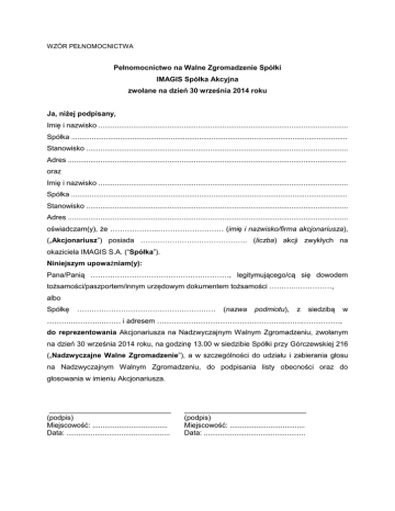WZÓR PEŁNOMOCNICTWA Pełnomocnictwo na Walne Zgromadzenie Spółki IMAGIS Spółka Akcyjna zwołane na dzień 30 września 2014 roku Ja, niżej podpisany, Imię i nazwisko ........................................................................................................................... Spółka ........................................................................................................................................ Stanowisko ................................................................................................................................. Adres ......................................................................................................................................... oraz Imię i nazwisko ........................................................................................................................... Spółka ........................................................................................................................................ Stanowisko ................................................................................................................................. Adres .......................................................................................................................................... oświadczam(y), że ………………..……………………… (imię i nazwisko/firma akcjonariusza), („Akcjonariusz”) posiada …………………………………….. (liczba) akcji zwykłych na okaziciela IMAGIS S.A. (“Spółka”). Niniejszym upoważniam(y): Pana/Panią …………………………………………………, legitymującego/cą się dowodem tożsamości/paszportem/innym urzędowym dokumentem tożsamości ………..……………, albo Spółkę ………………………………………………… (nazwa podmiotu), z siedzibą w ………..………..……… i adresem ……………………………………………..……..……………, do reprezentowania Akcjonariusza na Nadzwyczajnym Walnym Zgromadzeniu, zwołanym na dzień 30 września 2014 roku, na godzinę 13.00 w siedzibie Spółki przy Górczewskiej 216 („Nadzwyczajne Walne Zgromadzenie”), a w szczególności do udziału i zabierania głosu na Nadzwyczajnym Walnym Zgromadzeniu, do podpisania listy obecności oraz do głosowania w imieniu Akcjonariusza. ______________________________ (podpis) Miejscowość: ..................................... Data: ................................................... ______________________________ (podpis) Miejscowość: ..................................... Data: .................................................. WAŻNE INFORMACJE: Identyfikacja Akcjonariusza W celu identyfikacji Akcjonariusza udzielającego pełnomocnictwa, do niniejszego pełnomocnictwa powinna zostać załączona: - w przypadku akcjonariusza będącego osobą fizyczną - kopia dowodu osobistego, paszportu lub innego urzędowego dokumentu potwierdzającego tożsamość Akcjonariusza; albo - w przypadku akcjonariusza innego niż osoba fizyczna – kopia odpisu z właściwego rejestru lub innego dokumentu potwierdzającego upoważnienie osoby fizycznej (lub osób fizycznych) do reprezentowania Akcjonariusza na Walnym Zgromadzeniu (na przykład nieprzerwany ciąg pełnomocnictw). W przypadku wątpliwości co do prawdziwości kopii wyżej wymienionych dokumentów, Zarząd zastrzega sobie prawo do żądania od pełnomocnika okazania przy sporządzaniu listy obecności: - w przypadku Akcjonariusza będącego osobą fizyczną – kopii potwierdzonej za zgodność z oryginałem przez notariusza lub inny podmiot uprawniony do potwierdzania za zgodność z oryginałem kopii dowodu osobistego, paszportu lub innego urzędowego dokumentu potwierdzającego tożsamość akcjonariusza; albo - w przypadku Akcjonariusza innego niż osoba fizyczna - oryginału lub kopii potwierdzonej za zgodność z oryginałem przez notariusza lub inny podmiot uprawniony do potwierdzania za zgodność z oryginałem odpisu z właściwego rejestru lub innego dokumentu potwierdzającego upoważnienie osoby fizycznej (lub osób fizycznych) do reprezentowania przez pełnomocnika na Walnym Zgromadzeniu (na przykład nieprzerwany ciąg pełnomocnictw). Identyfikacja pełnomocnika W celu identyfikacji pełnomocnika, Zarząd zastrzega sobie prawo do żądania od pełnomocnika okazania przy sporządzaniu listy obecności: - w przypadku pełnomocnika będącego osobą fizyczną - dowodu osobistego, paszportu lub innego urzędowego dokumentu potwierdzającego tożsamość akcjonariusza; albo - w przypadku pełnomocnika innego niż osoba fizyczna - oryginału lub kopii potwierdzonej za zgodność z oryginałem przez notariusza lub inny podmiot uprawniony do potwierdzania za zgodność z oryginałem odpisu z właściwego rejestru lub innego dokumentu potwierdzającego upoważnienie osoby fizycznej (osób fizycznych) do reprezentowania przez pełnomocnika na Walnym Zgromadzeniu (na przykład: nieprzerwany ciąg pełnomocnictw). Zwracamy uwagę, że w przypadku rozbieżności pomiędzy danymi Akcjonariusza wskazanymi w pełnomocnictwie a danymi znajdującymi się na liście akcjonariuszy sporządzonej w oparciu o wykaz otrzymany od podmiotu prowadzącego depozyt papierów wartościowych (Krajowy Depozyt Papierów Wartościowych S.A.) i przekazanego Spółce zgodnie z art. 4063 Kodeksu spółek handlowych, Akcjonariusz może zostać nie dopuszczony do uczestnictwa w Walnym Zgromadzeniu. Zwracamy uwagę, że Spółka nie nakłada obowiązku udzielania pełnomocnictwa na powyższym formularzu.