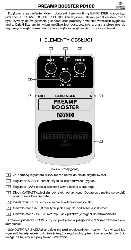PREAMP BOOSTER PB100 Dziêkujemy za zaufanie, którym obdarzyli Pañstwo firmê BEHRINGER, nabywaj¹c urz¹dzenia PREAMP BOOSTER PB100. Ten wysokiej jakoci peda³ efektów mo¿e byæ u¿ywany do zwiêkszania g³onoci oraz poprawy brzmienia wszelkich sygna³ów audio. Dziêki licznym funkcjom mo¿liwe jest dostosowanie sygna³u z piezo-ups do regularnych wejæ wzmacniacza lub zwiêkszanie g³onoci podczas solówek. 1. ELEMENTY OBS£UGI Widok strony górnej Za pomoc¹ regulatora BASS mo¿na ustawiaæ niskie czêstotliwoci. Regulator TREBLE okrela wysokie czêstotliwoci sygna³u. Regulator GAIN okrela wielkoæ wzmocnienia wstêpnego. Dioda ON/BATT wieci siê, gdy efekt jest aktywny. Dodatkowo mo¿na sprawdziæ poziom na³adowania baterii. Prze³¹cznik no¿ny s³u¿y do aktywacji/dezaktywacji efektu. Gniazdo mono IN 6,3 mm typu jack s³u¿y do pod³¹czenia instrumentu. Gniazdo mono OUT 6,3 mm typu jack przekazuje sygna³ do wzmacniacza. Czo³owe przy³¹cze DC IN s³u¿y do pod³¹czania przejciówki 9 V (nie zawiera siê w komplecie). SCHOWEK NA BATERIE znajduje siê pod prze³¹cznikiem no¿nym. Aby w³o¿yæ lub wymieniæ bateriê, nale¿y ostro¿nie cisn¹æ przeguby d³ugopisem i wyj¹æ peda³. Zwróciæ uwagê na to, aby nie porysowaæ urz¹dzenia. PREAMP BOOSTER PB100 + PB100 nie ma prze³¹cznika On/Off. PB100 jest gotowy do pracy, gdy kabel jest pod³¹czony do gniazda IN. Wyci¹gn¹æ wtyczkê z gniazda IN, gdy PB100 nie jest u¿ywany. W ten sposób przed³u¿a siê ¿ywotnoæ akumulatorka. NUMER SERYJNY znajduje siê na dolnej stronie urz¹dzenia. 2. GWARANCJA Nasze aktualne warunki gwarancyjne znajduj¹ siê na stronie http:// www.behringer.com. 3. DANE TECHNICZNE In Out Przy³¹cze Impedancja Przy³¹cze Impedancja Zasilanie elektryczne Przy³¹cze sieciowe Bateria Pobór mocy Wymiary (WxSxG) Ciê¿ar gniazdo 6,3-mm mono typu jack 500 kW gniazdo 6,3-mm mono typu jack 1 kW 9 V, 100 mA DC, regulowany PSU-SB-CN BEHRINGER 220 VAC przejciówka Chiny PSU-SB-EU BEHRINGER 230 VAC przejciówka Europa PSU-SB-JP BEHRINGER 100 VAC przejciówka Japonia PSU-SB-SAA BEHRINGER 240 VAC przejciówka Australia PSU-SB-UK BEHRINGER 240 VAC przejciówka Wielka Brytania PSU-SB-UL BEHRINGER 120 VAC przejciówka USA Przy³¹cze 2-mm DC, rodkowy ujemny 9 V Typ 6LR61 30 mA ok. 54 mm x 70 mm x 123 mm ok. 0,33 kg Firma BEHRINGER stale stara siê o zapewnienie najwy¿szego standardu jakoci. Niezbêdne modyfikacja bêd¹ dokonywane bez uprzedniego zawiadomienia. Dane techniczne i rysunki urz¹dzenia mog¹ z tego wzglêdu odbiegaæ od podanych informacji lub ilustracji. 4. WSKAZÓWKI DOTYCZ¥CE BEZPIECZEÑSTWA Nie u¿ywaæ w pobli¿u wody ani nie instalowaæ w pobli¿u róde³ ciep³a. Stosowaæ wy³¹cznie dodatki/akcesoria dopuszczone przez producenta. Nie naprawiaæ urz¹dzenia samodzielnie. Serwisowanie i naprawy zlecaæ naszemu wykwalifikowanego personelowi, szczególnie w przypadku uszkodzeñ przewodu lub wtyku sieciowego. Zastrzega siê prawo wprowadzania bez uprzedzenia zmian parametrów technicznych i wygl¹du. Niniejsza informacja jest aktualna na moment druku. Nazwy firm, instytucji lub publikacji, które zosta³y wspomniane lub których zdjêcia zosta³y umieszczone oraz ich logo s¹ zarejestrowanymi znakami handlowymi nale¿¹cymi do poszczególnych w³acicieli. Ich u¿ycie w ¿aden sposób nie uprawnia BEHRINGER® do u¿ywania tych znaków handlowych ani do afiliowania w³acicieli znaków z firm¹ BEHRINGER®. BEHRINGER® nie ponosi odpowiedzialnoci za jakiekolwiek straty, które mog¹ ponieæ jakiekolwiek osoby, które opar³y siê w ca³oci lub w czêci na jakichkolwiek opisach, fotografiach lub owiadczeniach tu zawartych. Kolorystyka i parametry mog¹ siê nieznacznie ró¿niæ od tych, które posiada produkt. Sprzeda¿ produktów odbywa siê wy³¹cznie przez autoryzowan¹ sieæ dealersk¹. Dystrybutorzy i dealerzy nie s¹ przedstawicielami BEHRINGER® i nie maj¹ ¿adnego prawa zaci¹gaæ w imieniu BEHRINGER® jakichkolwiek zobowi¹zañ, w sposób bezporedni lub dorozumiany, ani te¿ reprezentowaæ BEHRINGER®. Niniejsza instrukcja obs³ugi podlega ochronie prawem autorskim. Powielanie, kopiowanie, równie¿ czêciowe oraz jakiekolwiek reprodukowanie ilustracji z niniejszej instrukcji, równie¿ w zmienionej formie, dopuszczalne jest jedynie na podstawie zgody wyra¿onej na pimie przez BEHRINGER Spezielle Studiotechnik GmbH. BEHRINGER® jest zarejestrowanym znakiem handlowym. WSZELKIE PRAWA ZASTRZE¯ONE © 2005 BEHRINGER Spezielle Studiotechnik GmbH, Hanns-Martin-Schleyer-Str. 36-38, 47877 Willich-Münchheide II, Germany. tel. +49 2154 9206 0, fax +49 2154 9206 4903