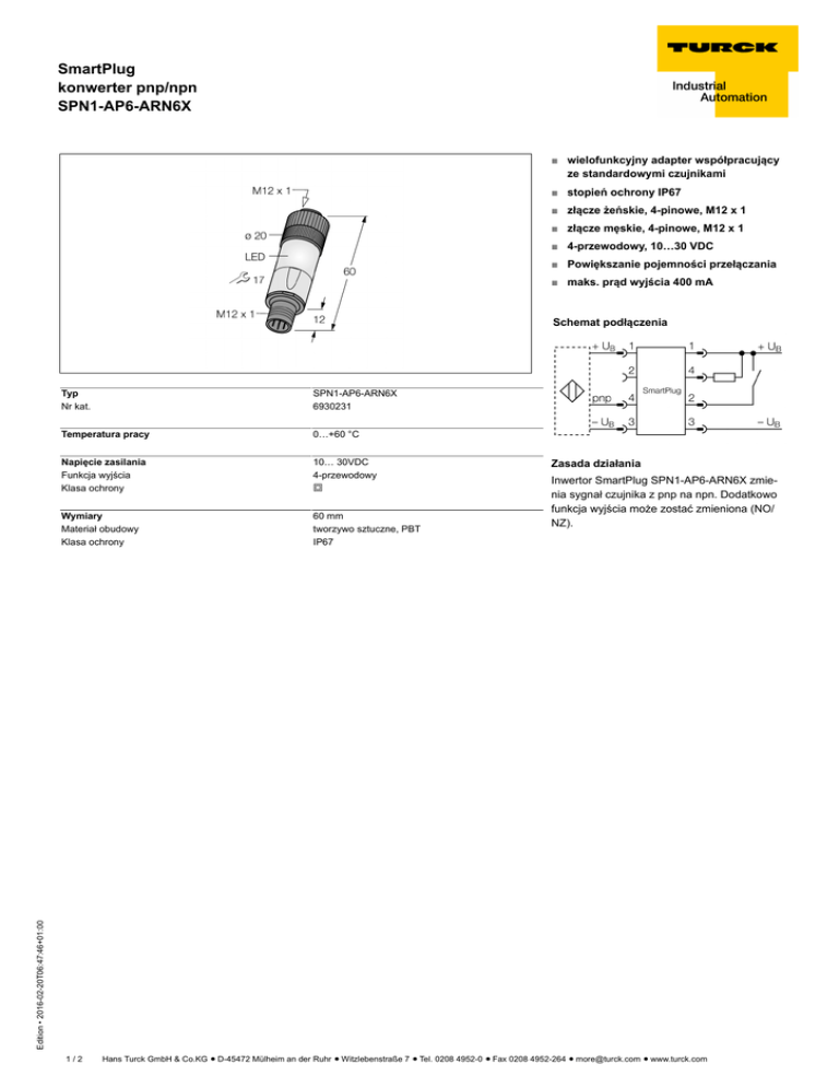 SmartPlug konwerter pnp/npn SPN1-AP6-ARN6X ■ wielofunkcyjny adapter współpracujący ze standardowymi czujnikami ■ stopień ochrony IP67 ■ złącze żeńskie, 4-pinowe, M12 x 1 ■ złącze męskie, 4-pinowe, M12 x 1 ■ 4-przewodowy, 10…30 VDC ■ Powiększanie pojemności przełączania ■ maks. prąd wyjścia 400 mA Schemat podłączenia SPN1-AP6-ARN6X 6930231 Temperatura pracy 0…+60 °C Napięcie zasilania Funkcja wyjścia Klasa ochrony 10… 30VDC 4-przewodowy ÷ Wymiary Materiał obudowy Klasa ochrony 60 mm tworzywo sztuczne, PBT IP67 Zasada działania Inwertor SmartPlug SPN1-AP6-ARN6X zmienia sygnał czujnika z pnp na npn. Dodatkowo funkcja wyjścia może zostać zmieniona (NO/ NZ). Edition • 2016-02-20T06:47:46+01:00 Typ Nr kat. 1/2 Hans Turck GmbH & Co.KG ñ D-45472 Mülheim an der Ruhr ñ Witzlebenstraße 7 ñ Tel. 0208 4952-0 ñ Fax 0208 4952-264 ñ [email protected] ñ www.turck.com SmartPlug konwerter pnp/npn SPN1-AP6-ARN6X Akcesoria - funkcja Nr kat. VB2-SP1 6999084 Rysunek wymiarowy Teach adapter Edition • 2016-02-20T06:47:46+01:00 Typ 2/2 Hans Turck GmbH & Co.KG ñ D-45472 Mülheim an der Ruhr ñ Witzlebenstraße 7 ñ Tel. 0208 4952-0 ñ Fax 0208 4952-264 ñ [email protected] ñ www.turck.com