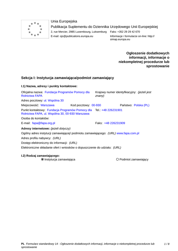 Unia Europejska Publikacja Suplementu do Dziennika Urzędowego Unii Europejskiej 2, rue Mercier, 2985 Luxembourg, Luksemburg Faks: +352 29 29 42 670 E-mail: [email protected] Informacje i formularze on-line: http:// simap.europa.eu Ogłoszenie dodatkowych informacji, informacje o niekompletnej procedurze lub sprostowanie Sekcja I: Instytucja zamawiająca/podmiot zamawiający I.1) Nazwa, adresy i punkty kontaktowe: Oficjalna nazwa: Fundacja Programów Pomocy dla Rolnictwa FAPA Krajowy numer identyfikacyjny: (jeżeli jest znany) _____ Adres pocztowy: ul. Wspólna 30 Miejscowość: Warszawa Kod pocztowy: 00-930 Punkt kontaktowy: Fundacja Programów Pomocy dla Rolnictwa FAPA, ul. Wspólna 30, 00-930 Warszawa Państwo: Polska (PL) Tel.: +48 226231901 Osoba do kontaktów: _____ E-mail: [email protected] Faks: +48 226231909 Adresy internetowe: (jeżeli dotyczy) Ogólny adres instytucji zamawiającej/ podmiotu zamawiającego: (URL) www.fapa.com.pl Adres profilu nabywcy: (URL) _____ Dostęp elektroniczny do informacji: (URL) _____ Elektroniczne składanie ofert i wniosków o dopuszczenie do udziału: (URL) _____ I.2) Rodzaj zamawiającego: Instytucja zamawiająca Podmiot zamawiający PL Formularz standardowy 14 - Ogłoszenie dodatkowych informacji, informacje o niekompletnej procedurze lub sprostowanie 1/8 Sekcja II: Przedmiot zamówienia II.1.1) Nazwa nadana zamówieniu: 05/KSOW/PN-U/2015 Zakup usług polegających na zapewnieniu kompleksowej realizacji projektu pn. Uprawa trufli – przedsiębiorczość i zrównoważony rozwój obszarów wiejskich II.1.2) Krótki opis zamówienia lub zakupu: (podano w pierwotnym ogłoszeniu) Przedmiotem zamówienia jest kompleksowa realizacja projektu pn. „Uprawa trufli – przedsiębiorczość i zrównoważony rozwój obszarów wiejskich”. W ramach projektu Wykonawca zrealizuje w całości i we własnym zakresie Program wyjazdu studyjnego dla minimalnie 25 a maksymalnie 32 uczestników do Włoch w terminie do dnia 31 marca 2015 r. Celem projektu jest wymiana doświadczeń oraz wiedzy z zakresu innowacyjnej uprawy trufli pomiędzy młodymi mieszkańcami obszarów wiejskich z Polski i Włoch. Celami szczegółowymi są: - promowanie i rozwój przedsiębiorczości na obszarach wiejskich, ze szczególnym uwzględnieniem uprawy trufli, przykłady dobrych praktyk we Włoszech, - poznanie innowacyjnych i nowych technologii uprawy trufli oraz roli nauki w transferze wiedzy i innowacji, - przedstawienie przykładów dywersyfikacji obszarów wiejskich, m.in uprawy trufli oraz włoskiej „Szkoły trufli” jako działania wspólnego na obszarach wiejskich. Zamawiający przekaże listę uczestników projektu niezwłocznie po podpisaniu umowy. Uczestnikami wyjazdu będą młodzi mieszkańcy wsi, w tym rolnicy, przedsiębiorcy, urzędnicy i działacze społeczni z obszarów kraju, na których możliwa jest uprawa trufli w Polsce. Wykonawca zapewni: 1. Realizacje programu wizyty studyjnej zgodnie z następującymi założeniami: w 1 dniu: - transport autokarowy wszystkich uczestników z miejsca zbiórki z ul. Focha 7, 42-200, w Częstochowie, wyjazd o godz. 17:00 do Perugii we Włoszech, Wykonawca zapewni suchy prowiant na drogę dla wszystkich uczestników co najmniej po 2 kanapki (do wyboru z wędliną i wegetariańskie) z pieczywa jasnego i ciemnego oraz po 2 owoce krajowe dla każdego z uczestników. Podczas podróży dostępne będą w autokarze napoje zimne (woda mineralna gazowana i niegazowana oraz dwa rodzaje soków) i gorące (herbata, kawa). w 2 dniu: - śniadanie na trasie przejazdu w formie bufetu dla maksymalnie 32 uczestników, składające się z ciepłego napoju (kawa, herbata), gorącej przekąski, zimnej przystawki, pieczywa. - obiad dla wszystkich uczestników składający się co najmniej z dwóch dań gorących, w tym zupa i drugie danie (do wyboru danie mięsne i danie wegetariańskie), napój zimny i gorący oraz deser w miejscu zakwaterowania lub w odległości maksymalnie 1 km od miejsca zakwaterowania. - spotkanie z partnerami włoskimi (maksymalnie 4 osoby) wprowadzające do tematyki wizyty studyjnej. W ramach organizacji spotkania Wykonawca zapewni salę w miejscu zakwaterowania lub w odległości maksymalnie 1 km od miejsca zakwaterowania, wyposażoną w ilość miejsc siedzących dostosowaną do ilości osób uczestniczących w spotkaniu, laptopa, projektor, flipchart oraz jeden serwis kawowy składający się minimalnie z kawy, herbaty, wody gazowanej i niegazowanej oraz ciastek dla uczestników spotkania. W trakcie spotkania poruszone zostaną następujące zagadnienia: przedstawienie programu, celów i założeń wyjazdu, innowacyjne uprawy a rozwój przedsiębiorczości na wsi, zrównoważony rozwój obszarów wiejskich a II filar WPR 2007-2013, przykłady dobrych praktyk rozwoju przedsiębiorczości powstałych w latach 2007-2013, PL Formularz standardowy 14 - Ogłoszenie dodatkowych informacji, informacje o niekompletnej procedurze lub sprostowanie 2/8 rozwój obszarów wiejskich we Wspólnej Polityce Rolnej na lata 2014-2020, - kolacja w Perugii składającą się z tradycyjnych potraw regionalnych Umbrii, w tym co najmniej z dwóch zimnych przystawek, dwóch dań gorących (do wyboru danie mięsne i danie wegetariańskie), napojów zimnych i gorących oraz deseru. w 3 dniu: - wizyta studyjna nr 1- prezentacja pierwszego gospodarstwa uprawiającego trufle w okolicach miasta Orvieto. - obiad składający się co najmniej z dwóch dań gorących, w tym przystawka gorąca i drugie danie (do wyboru danie mięsne i danie wegetariańskie), napój zimny i gorący oraz deser na trasie wizyty w okolicach miasta Orvieto. - wizyta studyjna nr 2 – prezentacja drugiego gospodarstwa uprawiającego trufle w okolicach miasta Orvieto. - kolacja w Orvieto składająca się z tradycyjnych potraw regionalnych, w tym co najmniej z dwóch dań gorących (do wyboru danie mięsne i danie wegetariańskie) i dwóch zimnych przystawek, napój zimny i gorąc