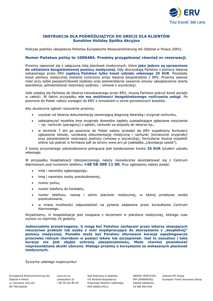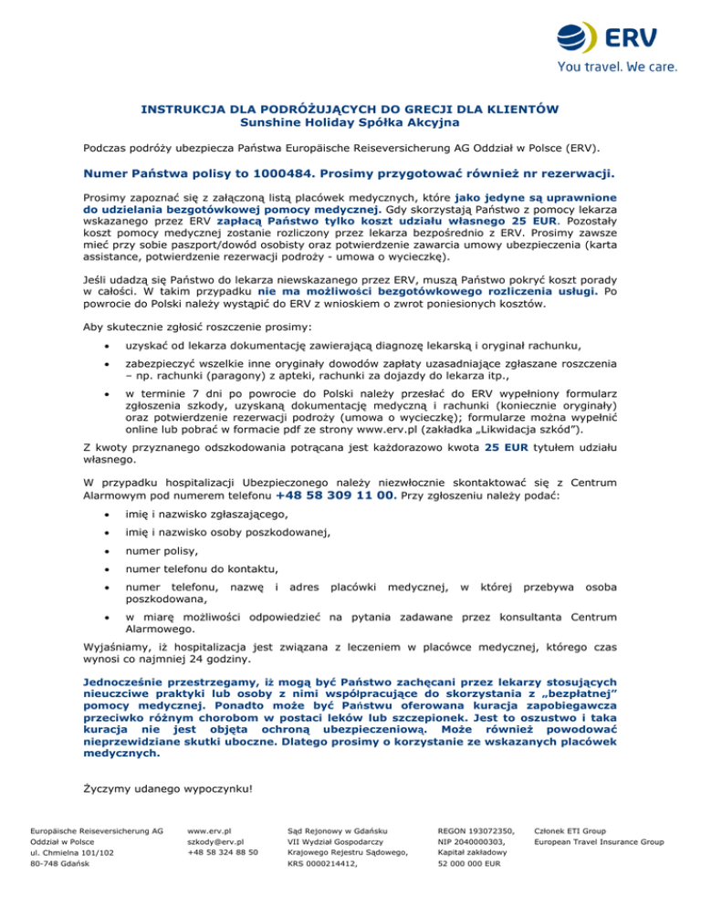 INSTRUKCJA DLA PODRÓŻUJĄCYCH DO GRECJI DLA KLIENTÓW Sunshine Holiday Spółka Akcyjna Podczas podróży ubezpiecza Państwa Europäische Reiseversicherung AG Oddział w Polsce (ERV). Numer Państwa polisy to 1000484. Prosimy przygotować również nr rezerwacji. Prosimy zapoznać się z załączoną listą placówek medycznych, które jako jedyne są uprawnione do udzielania bezgotówkowej pomocy medycznej. Gdy skorzystają Państwo z pomocy lekarza wskazanego przez ERV zapłacą Państwo tylko koszt udziału własnego 25 EUR. Pozostały koszt pomocy medycznej zostanie rozliczony przez lekarza bezpośrednio z ERV. Prosimy zawsze mieć przy sobie paszport/dowód osobisty oraz potwierdzenie zawarcia umowy ubezpieczenia (karta assistance, potwierdzenie rezerwacji podroży - umowa o wycieczkę). Jeśli udadzą się Państwo do lekarza niewskazanego przez ERV, muszą Państwo pokryć koszt porady w całości. W takim przypadku nie ma możliwości bezgotówkowego rozliczenia usługi. Po powrocie do Polski należy wystąpić do ERV z wnioskiem o zwrot poniesionych kosztów. Aby skutecznie zgłosić roszczenie prosimy: • uzyskać od lekarza dokumentację zawierającą diagnozę lekarską i oryginał rachunku, • zabezpieczyć wszelkie inne oryginały dowodów zapłaty uzasadniające zgłaszane roszczenia – np. rachunki (paragony) z apteki, rachunki za dojazdy do lekarza itp., • w terminie 7 dni po powrocie do Polski należy przesłać do ERV wypełniony formularz zgłoszenia szkody, uzyskaną dokumentację medyczną i rachunki (koniecznie oryginały) oraz potwierdzenie rezerwacji podroży (umowa o wycieczkę); formularze można wypełnić online lub pobrać w formacie pdf ze strony www.erv.pl (zakładka „Likwidacja szkód”). Z kwoty przyznanego odszkodowania potrącana jest każdorazowo kwota 25 EUR tytułem udziału własnego. W przypadku hospitalizacji Ubezpieczonego należy niezwłocznie skontaktować się z Centrum Alarmowym pod numerem telefonu +48 58 309 11 00. Przy zgłoszeniu należy podać: • imię i nazwisko zgłaszającego, • imię i nazwisko osoby poszkodowanej, • numer polisy, • numer telefonu do kontaktu, • numer telefonu, poszkodowana, • w miarę możliwości odpowiedzieć na pytania zadawane przez konsultanta Centrum Alarmowego. nazwę i adres placówki medycznej, w której przebywa osoba Wyjaśniamy, iż hospitalizacja jest związana z leczeniem w placówce medycznej, którego czas wynosi co najmniej 24 godziny. Jednocześnie przestrzegamy, iż mogą być Państwo zachęcani przez lekarzy stosujących nieuczciwe praktyki lub osoby z nimi współpracujące do skorzystania z „bezpłatnej” pomocy medycznej. Ponadto może być Państwu oferowana kuracja zapobiegawcza przeciwko różnym chorobom w postaci leków lub szczepionek. Jest to oszustwo i taka kuracja nie jest objęta ochroną ubezpieczeniową. Może również powodować nieprzewidziane skutki uboczne. Dlatego prosimy o korzystanie ze wskazanych placówek medycznych. Życzymy udanego wypoczynku! Europäische Reiseversicherung AG www.erv.pl Sąd Rejonowy w Gdańsku REGON 193072350, Członek ETI Group Oddział w Polsce [email protected] VII Wydział Gospodarczy NIP 2040000303, European Travel Insurance Group ul. Chmielna 101/102 +48 58 324 88 50 Krajowego Rejestru Sądowego, Kapitał zakładowy KRS 0000214412, 52 000 000 EUR 80-748 Gdańsk