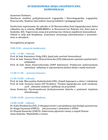 III RZESZOWSKA SESJA LOGOPEDYCZNA KOMUNIKACJA Szanowni Państwo, Słuchacze studiów podyplomowych Logopedia i Neurologopedia, Logopedzi, Nauczyciele, Studenci kierunków nauczycielskich i pedagogicznych Serdecznie zapraszamy do udziału w III Rzeszowskiej Sesji logopedycznej, która odbędzie się w sobotę, 29.03.2014 r. w Rzeszowie (ul. Rejtana 16c, duża aula w budynku A0). Tegoroczna sesja jest poświęcona różnym aspektom komunikacji. Udział w sesji jest bezpłatny, uczestnicy otrzymają zaświadczenia o uczestnictwie w obradach. Szczegółowy program: 9.00-9.30 – otwarcie konferencji 9.30 – 11.00 – referaty Prof. dr hab. Kazimierz Ożóg (UR): Język jako wartość komunikacji Prof. dr hab. Danuta Pluta-Wojciechowska (UŚ) Zaburzenia czynności prymarnych i artykulacji Prof. dr hab. Anna Zwierzchowska (AWF Katowice): Praktyczne wykorzystanie stymulacji taktylnej w usprawnianiu funkcji dużej i małej motoryki 11.00-11.30- – przerwa kawowa 11.30-13.00 – referaty Prof. dr hab. Mieczysław Radochoński (UR): Zespół Aspergera u dzieci i młodzieży Prof. dr hab. Grażyna Gunia (UP Kraków): Terapia logopedyczna osób niesłyszących - aktualne zadania i aplikacje na przyszłość Anna Kostecka: Psychospołeczne funkcjonowanie dziecka z systemem implantu ślimakowego 13.00-14.00 - przerwa obiadowa 14.00-16.00 – referaty Dr Zofia Wodniecka (UJ): O dwujęzyczności z perspektywy psychologii poznawczej Dr Kinga Szymona (UMCS): Jak pracować z dzieckiem z ADHD Dr Wanda Kostecka (UMCS): Zaburzenia płynności mowy a zespół Downa Anna Kidacka: Wędzidełko a mowa WIOSENNE WARSZTATY LOGOPEDYCZNE Szanowni Państwo, Zapraszamy słuchaczy i pracowników studiów podyplomowych Logopedia i Neurologopedia do udziału w warsztatach, które odbędą się w niedzielę, 30.03.2014 r. w Instytucie Filologii Polskiej UR, w godz. 9.00-16.00. Proponujemy następujące zajęcia: 1. Łukasz Przygoda: Wczesna interwencja – torowanie kompleksu ustnotwarzowo-obręczowego 2. Agnieszka Kotowicz: Działania logopedy w trójkącie pacjent – rodzic – terapeuta 3. Anna Kostecka, Wanda Kostecka: Strategie postępowania logopedycznego w przypadku terapii grupowej osób jąkających się 4. Urszula Wojnarowska: Sposoby wywoływania głoski sz 5. Natalia Kajka: Metodologia postępowania z dzieckiem z ADHD 6. Bogumiła Wilk, Łucja Skrzypiec: Stymulowanie procesu mowy i języka. Wykorzystanie Symultaniczno-Sekwencyjnej Metody Nauki Czytania® oraz Programu Rozwoju Komunikacji MakatonÒ Na warsztaty obowiązuje wcześniejsza rezerwacja miejsc. Każda osoba może wziąć udział w maksymalnie trzech warsztatach Koszt uczestnictwa w jednym warsztacie 20 zł. Rejestracja uczestników odbywa się wyłącznie za pośrednictwem poczty elektronicznej. Zgłoszenia prosimy kierować na adres: [email protected] . O przyjęciu decyduje kolejność zgłoszeń. Opłatę za warsztaty należy wnieść do końca lutego (nr konta będzie podany w najbliższych dniach). W razie braku opłaty od osób zapisanych, będą przyjmowane kolejne osoby z list rezerwowych. Studentów filologii polskiej (zwłaszcza specjalności dziennikarstwo) zapraszamy na warsztaty z emisji głosu z panią redaktor Bożeną Targosz, byłą prezenterką Teleexpresu i Panoramy, obecnie członkinią Agencji Produkcji Telewizyjnej TVP. Dziennikarka prowadziła też razem z Piotrem Kraśką cykl programów edukacyjnych, przybliżających Polakom różne kwestie związane z Unią Europejską. Poza tym pani Bożena przekazuje młodszym kolegom po fachu swoje cenne doświadczenie, prowadząc szkolenia wizerunkowe, medialne i komunikacyjne. Zapisy na warsztaty przyjmuje dr Agnieszka Myszka (można za pomocą maila): [email protected]