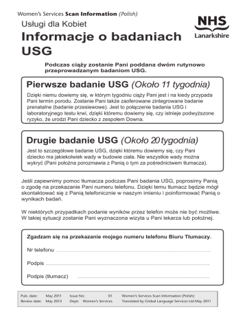 Women’s Services Scan Information (Polish) Usługi dla Kobiet Informacje o badaniach USG Podczas ciąży zostanie Pani poddana dwóm rutynowo przeprowadzanym badaniom USG. Pierwsze badanie USG (Około 11 tygodnia) Dzięki niemu dowiemy się, w którym tygodniu ciąży Pani jest i na kiedy przypada Pani termin porodu. Zostanie Pani także zaoferowane zintegrowane badanie prenatalne (badanie przesiewowe). Jest to połączenie badania USG i laboratoryjnego testu krwi, dzięki któremu dowiemy się, czy istnieje podwyższone ryzyko, że urodzi Pani dziecko z zespołem Downa. Drugie badanie USG (Około 20 tygodnia) Jest to szczegółowe badanie USG, dzięki któremu dowiemy się, czy Pani dziecko ma jakiekolwiek wady w budowie ciała. Nie wszystkie wady można wykryć (Pani położna porozmawia z Panią o tym za pośrednictwem tłumacza). Jeśli zapewnimy pomoc tłumacza podczas Pani badania USG, poprosimy Panią o zgodę na przekazanie Pani numeru telefonu. Dzięki temu tłumacz będzie mógł skontaktować się z Panią telefonicznie w naszym imieniu i poinformować Panią o wynikach badań. W niektórych przypadkach podanie wyników przez telefon może nie być możliwe. W takiej sytuacji zostanie Pani wyznaczona wizyta u Pani lekarza lub położnej. Zgadzam się na przekazanie mojego numeru telefonu Biuru Tłumaczy. Nr telefonu Podpis .......................................................................................................................................................................... ..................................................................................................................................................................................... Podpis (tłumacz) .................................................................................................................................................. Pub. date: Data pub: Maj 2011 r. May 2011 Issue No: Review date: r. Maj 2013 May 2013 Dept: Data ponownej oceny: Nr wyd: Wydz: Usługi dla Kobiet 01 01 Women’s Services Women’s Services Scan Information (Polish) Translated by Global Language Services Ltd May 2011 FRM.SCNINF.75184.W