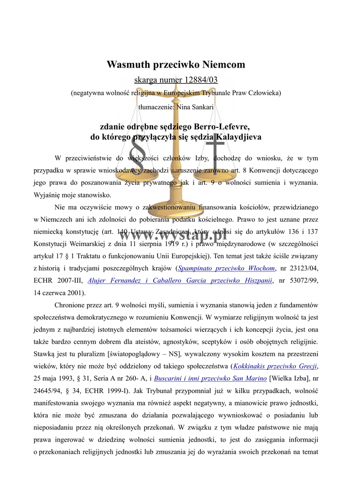 Wasmuth przeciwko Niemcom skarga numer 12884/03 (negatywna wolność religijna w Europejskim Trybunale Praw Człowieka) tłumaczenie: Nina Sankari zdanie odrębne sędziego Berro-Lefevre, do którego przyłączyła się sędzia Kalaydjieva W przeciwieństwie do większości członków Izby, dochodzę do wniosku, że w tym przypadku w sprawie wnioskodawcy zachodzi naruszenie zarówno art. 8 Konwencji dotyczącego jego prawa do poszanowania życia prywatnego jak i art. 9 o wolności sumienia i wyznania. Wyjaśnię moje stanowisko. Nie ma oczywiście mowy o zakwestionowaniu finansowania kościołów, przewidzianego w Niemczech ani ich zdolności do pobierania podatku kościelnego. Prawo to jest uznane przez niemiecką konstytucję (art. 140 Ustawy Zasadniczej, który odnosi się do artykułów 136 i 137 Konstytucji Weimarskiej z dnia 11 sierpnia 1919 r.) i prawo międzynarodowe (w szczególności artykuł 17 § 1 Traktatu o funkcjonowaniu Unii Europejskiej). Ten temat jest także ściśle związany z historią i tradycjami poszczególnych krajów (Spampinato przeciwko Włochom, nr 23123/04, ECHR 2007-III, Alujer Fernandez i Caballero Garcia przeciwko Hiszpanii, nr 53072/99, 14 czerwca 2001). Chronione przez art. 9 wolności myśli, sumienia i wyznania stanowią jeden z fundamentów społeczeństwa demokratycznego w rozumieniu Konwencji. W wymiarze religijnym wolność ta jest jednym z najbardziej istotnych elementów tożsamości wierzących i ich koncepcji życia, jest ona także bardzo cennym dobrem dla ateistów, agnostyków, sceptyków i osób obojętnych religijnie. Stawką jest tu pluralizm [światopoglądowy – NS], wywalczony wysokim kosztem na przestrzeni wieków, który nie może być oddzielony od takiego społeczeństwa (Kokkinakis przeciwko Grecji, 25 maja 1993, § 31, Seria A nr 260- A, i Buscarini i inni przeciwko San Marino [Wielka Izba], nr 24645/94, § 34, ECHR 1999-I). Jak Trybunał przypomniał już w kilku przypadkach, wolność manifestowania swojego wyznania ma również aspekt negatywny, a mianowicie prawo jednostki, która nie może być zmuszana do działania pozwalającego wywnioskować o posiadaniu lub nieposiadaniu przez nią określonych przekonań. W związku z tym władze państwowe nie mają prawa ingerować w dziedzinę wolności sumienia jednostki, to jest do zasięgania informacji o przekonaniach religijnych jednostki lub zmuszania jej do wyrażania swoich przekonań na temat Boga (Alexandridis przeciwko Grecji, nr 19516/06, § 38, ECHR 2008-..., Sinan Isik przeciwko Turcji, numer 21924/05, § 41, ECHR 2010-....). Podobnie jak Izba, nie mam żadnych wątpliwości co do tego, że doszło do takiej ingerencji: zaskarżone sformułowanie “--” ipso facto pozwala na wywnioskowanie, że skarżący nie zgadza się lub już się nie zgadza z dogmatami kościoła lub innej wspólnoty religijnej uprawnionej do pobierania podatku kościelnego. Tak więc ta sprawa powinna być rozważana z punktu widzenia negatywnego aspektu wolności religii i sumienia, a mianowicie w aspekcie prawa jednostki do nieujawniania swoich przekonań [dosłownie: „do tego, by nie być zmuszanym do ujawniania” – NS]. W wyroku Isik przeciwko Turcji Trybunał uznał, że w sytuacji, gdy dokumenty tożsamości zawierają rubryki poświęcone religii, pozostawienie ich bez wpisu (puste) nieuchronnie miałoby specyficzną konotację, a posiadacze dokumentu tożsamości bez informacji o religii odróżnialiby się, niezgodnie z ich wolą i w wyniku ingerencji władz publicznych, od tych, którzy posiadają dokument tożsamości zawierający informację o ich przekonaniach religijnych. Dlatego Trybunał uznał, że dochodzi tu do ujawnienia jednego z najbardziej intymnych aspektów jednostki i że taka sytuacja jest niewątpliwie sprzeczna z koncepcją wolności do nieujawniania swojej religii lub przekonań, należących do wewnętrznej jurysdykcji (for intérieur) każdej jednostki. Wprawdzie w przypadku, o którym mowa, dane są początkowo wysyłane przez zainteresowane osoby do organów podatkowych. Jednakże problematyczne jest to, co następuje później, kiedy te informacje są przekazywane pracodawcy za pośrednictwem karty podatkowej. Nie satysfakcjonuje mnie uzasadnienie ujawniania tych danych pracodawcy, które zostało przytoczone przez rząd [niemiecki] w § 45 wyroku. Według rządu, z przyczyn praktycznych, zeznanie dotyczące podatku kościelnego jest kopiowane z zeznania o podatku dochodowym, tj. ze źródła, tym samym deklaracja podatkowa ze strony pracownika nie jest wymagana, a jednoczesne składanie obu zeznań ma pozwalać na uniknięcie sporządzania kolejnego odrębnego zeznania podatkowego. System ten jest również gwarancją zachowania porządku w sferze fiskalnej. Innymi słowy i w skrócie, organy podatkowe przekazują obowiązek pobierania podatku kościelnego na pracodawców. Co potwierdzają zresztą trybunały konstytucyjne (patrz § 23 wyroku), które wskazują, że w przypadku podatku kościelnego pracodawca działa jako agent (Beauftragter) Skarbu Państwa. Moim zdaniem, uzasadnienie to nie jest wystarczające, jeśli na drugiej szali mamy przywołaną przez wnioskodawcę ochronę wolności w art. 9 Konwencji. Izba minimalizuje w §§ 58 i 59 skutki takiego oświadczenia wobec pracodawcy, a ja nie mogę podzielać jej rozumowania, gdy stwierdza, że “wpis »--« ma ograniczony zakres działania w sprawie przynależności i orientacji religijnej lub filozoficznej wnioskodawcy, ponieważ dostarcza organom podatkowym wyłącznie informacji o tym, że wnioskodawca nie należy do żadnego z sześciu kościołów lub związków wyznaniowych uprawnionych do pobierania podatku kościelnego”. Przypominam jednakże, że w niedawnym wyroku w sprawie Schüth przeciwko Niemcom (nr 1620/03, 23 września 2010), Trybunał podkreślił znaczenie i rolę kościołów i stowarzyszeń religijnych w tym kraju. Jest oczywiste, że Kościół katolicki i Kościół ew