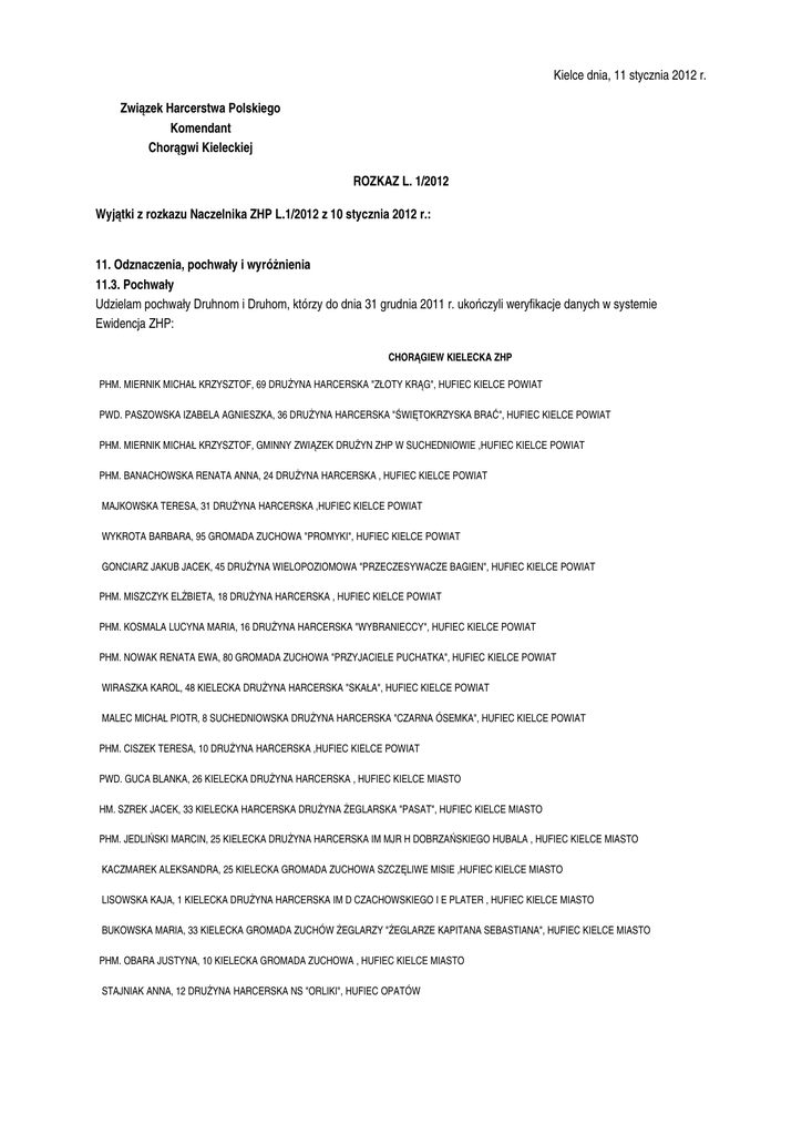 Kielce dnia, 11 stycznia 2012 r. Związek Harcerstwa Polskiego Komendant Chorągwi Kieleckiej ROZKAZ L. 1/2012 Wyjątki z rozkazu Naczelnika ZHP L.1/2012 z 10 stycznia 2012 r.: 11. Odznaczenia, pochwały i wyróżnienia 11.3. Pochwały Udzielam pochwały Druhnom i Druhom, którzy do dnia 31 grudnia 2011 r. ukończyli weryfikacje danych w systemie Ewidencja ZHP: CHORĄGIEW KIELECKA ZHP PHM. MIERNIK MICHAŁ KRZYSZTOF, 69 DRUŻYNA HARCERSKA "ZŁOTY KRĄG", HUFIEC KIELCE POWIAT PWD. PASZOWSKA IZABELA AGNIESZKA, 36 DRUŻYNA HARCERSKA "ŚWIĘTOKRZYSKA BRAĆ", HUFIEC KIELCE POWIAT PHM. MIERNIK MICHAŁ KRZYSZTOF, GMINNY ZWIĄZEK DRUŻYN ZHP W SUCHEDNIOWIE ,HUFIEC KIELCE POWIAT PHM. BANACHOWSKA RENATA ANNA, 24 DRUŻYNA HARCERSKA , HUFIEC KIELCE POWIAT MAJKOWSKA TERESA, 31 DRUŻYNA HARCERSKA ,HUFIEC KIELCE POWIAT WYKROTA BARBARA, 95 GROMADA ZUCHOWA "PROMYKI", HUFIEC KIELCE POWIAT GONCIARZ JAKUB JACEK, 45 DRUŻYNA WIELOPOZIOMOWA "PRZECZESYWACZE BAGIEN", HUFIEC KIELCE POWIAT PHM. MISZCZYK ELŻBIETA, 18 DRUŻYNA HARCERSKA , HUFIEC KIELCE POWIAT PHM. KOSMALA LUCYNA MARIA, 16 DRUŻYNA HARCERSKA "WYBRANIECCY", HUFIEC KIELCE POWIAT PHM. NOWAK RENATA EWA, 80 GROMADA ZUCHOWA "PRZYJACIELE PUCHATKA", HUFIEC KIELCE POWIAT WIRASZKA KAROL, 48 KIELECKA DRUŻYNA HARCERSKA "SKAŁA", HUFIEC KIELCE POWIAT MALEC MICHAŁ PIOTR, 8 SUCHEDNIOWSKA DRUŻYNA HARCERSKA "CZARNA ÓSEMKA", HUFIEC KIELCE POWIAT PHM. CISZEK TERESA, 10 DRUŻYNA HARCERSKA ,HUFIEC KIELCE POWIAT PWD. GUCA BLANKA, 26 KIELECKA DRUŻYNA HARCERSKA , HUFIEC KIELCE MIASTO HM. SZREK JACEK, 33 KIELECKA HARCERSKA DRUŻYNA ŻEGLARSKA "PASAT", HUFIEC KIELCE MIASTO PHM. JEDLIŃSKI MARCIN, 25 KIELECKA DRUŻYNA HARCERSKA IM MJR H DOBRZAŃSKIEGO HUBALA , HUFIEC KIELCE MIASTO KACZMAREK ALEKSANDRA, 25 KIELECKA GROMADA ZUCHOWA SZCZĘLIWE MISIE ,HUFIEC KIELCE MIASTO LISOWSKA KAJA, 1 KIELECKA DRUŻYNA HARCERSKA IM D CZACHOWSKIEGO I E PLATER , HUFIEC KIELCE MIASTO BUKOWSKA MARIA, 33 KIELECKA GROMADA ZUCHÓW ŻEGLARZY "ŻEGLARZE KAPITANA SEBASTIANA", HUFIEC KIELCE MIASTO PHM. OBARA JUSTYNA, 10 KIELECKA GROMADA ZUCHOWA , HUFIEC KIELCE MIASTO STAJNIAK ANNA, 12 DRUŻYNA HARCERSKA NS "ORLIKI", HUFIEC OPATÓW PWD. BARSZCZ AGATA, 9 DRUŻYNA WEDROWNICZA "ŚWIETOKRZYSKIE ANIOŁY", HUFIEC STARACHOWICE PHM. SPADŁO PIOTR, 104 DRUŻYNA HARCERSKA ,HUFIEC STARACHOWICE HM. MINDA JAN, ŻEGLARSKI KRĄG STARSZYZNY "BAJDEWIND", HUFIEC STARACHOWICE SPILSKA EDYTA KATARZYNA, 113 DRUŻYNA HARCERSKA ,HUFIEC STARACHOWICE PWD. ŚLASKI MATEUSZ JĘDRZEJ, 15 GRUNWALDZKA DRUŻYNA HARCERSKA "JĘDRUSIE", HUFIEC STARACHOWICE PWD. LESIAK PAWEŁ, 2 DRUŻYNA HARCERSKA ,HUFIEC STARACHOWICE PWD. DULĘBA KATARZYNA, 115 DRUZYNA HARCERSKA "POMARAŃCZARNIA", HUFIEC STARACHOWICE PHM. JEŚKO ZDZISŁAW, KRĄG STARSZYZNY NS ,HUFIEC STARACHOWICE PWD. MARSZAŁEK BOŻENA, 8 SSSDH WERTEPY W SECEMINIE "WERTEPY W SECEMINIE", HUFIEC SZCZEKOCIŃSKO WŁOSZCZOWSKI PWD. BEBEL JOANNA, 4 GROMADA ZUCHOWA "GROMADA P SP W BUKOWIE", HUFIEC SZCZEKOCIŃSKO WŁOSZCZOWSKI PWD. MARTOŚWYRWAŁ EWELINA, 22 GROMADA ZUCHOWA "DZIELNE SKRZATY Z KURZELOWA", HUFIEC SZCZEKOCIŃSKO WŁOSZCZOWSKI HM. GROSZEK RAJMUND, KRĄG SENIORA ŁYSICA "ŁYSICA", HUFIEC SZCZEKOCIŃSKO WŁOSZCZOWSKI HM. RESIAK ANNA, 34 DW OLESZNO , HUFIEC SZCZEKOCIŃSKO WŁOSZCZOWSKI PWD. WIŚNIEWSKA KATARZYNA, 21 DRUŻYNA HARCERSKA "ZJEDNOCZONE BOBRY Z KURZELOWA", HUFIEC SZCZEKOCIŃSKO WŁOSZCZOWSKI PHM. RAK MAREK, 30 DH RACZKI W CHLEWICACH , HUFIEC SZCZEKOCIŃSKO WŁOSZCZOWSKI PWD. DRUŻYŃSKASZOPLIK ANNA, 27 DRUŻYNA STARSZOHARCERSKA "BIAŁE WILKI Z MOSKARZEWA", HUFIEC SZCZEKOCIŃSKO WŁOSZCZOWSKI BRZDĄK AGNIESZKA, "PRÓBNA P ZPO 1 WE WŁOSZCZOWIE", HUFIEC SZCZEKOCIŃSKO WŁOSZCZOWSKI PWD. STANDERSKA KATARZYNA, 2 DZIKIE KOTY PRZY ZPO NR WE WŁOSZCZOWIE ,HUFIEC SZCZEKOCIŃSKO WŁOSZCZOWSKI SUPERSON ANGELIKA, 5 DRUŻYNA HARCERSKA "PROMYKI Z GOLENIOWYCH", HUFIEC SZCZEKOCIŃSKO WŁOSZCZOWSKI PIĘTAK GRZEGORZ, 6 DRUŻYNA HARCERSKA "POLNE KWIATY ZE SZCZEKOCIN", HUFIEC SZCZEKOCIŃSKO WŁOSZCZOWSKI HM. TERPIC EWA, 11 "DRUZYNA HARCERSKA W BUKOWIE", HUFIEC SZCZEKOCIŃSKO WŁOSZCZOWSKI PWD. WAWRZAK OLGA, 9 WIELOPOZIOMOWA DRUŻYNA HARCERSKA "THE SAPERS", HUFIEC SZCZEKOCIŃSKO WŁOSZCZOWSKI PWD. BIEŃ DANUTA, PRÓBNA DRUŻYNA Z CIESLI "PRÓBNA Z CIEŚLI", HUFIEC SZCZEKOCIŃSKO WŁOSZCZOWSKI KWACA IWONA, GROMADA ZUCHOWA "SŁONECZNY PATROL Z OLESZNA", HUFIEC SZCZEKOCIŃSKO WŁOSZCZOWSKI PWD. MOLĘDA JUSTYNA, 3 DRUŻYNA WĘDROWNICZA PRZY LO W MIECHOWIE "DW 3 DSH", HUFIEC SZCZEKOCIŃSKO WŁOSZCZOWSKI Czuwaj! hm. Małgorzata Sinica 4. Rozwiązania i powołania sztabów, komisji, komend kursów 4.1. Rozwiązanie i powoływanie sztabów 4.1.1. Z dniem 1 stycznia 2012 roku powołuję Sztab Harcerskiej Akcji Zimowej 2012 w składzie:  phm. Grzegorz Pietrala – Szef Sztabu  hm. Elżbieta Kubiec – Członek Sztabu  phm. Michał Krzysztof Miernik – Członek Sztabu Czuwaj! hm. Dariusz Bińczak