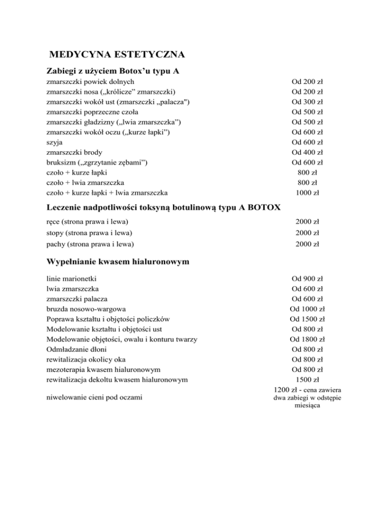 MEDYCYNA ESTETYCZNA Zabiegi z użyciem Botox’u typu A Od 200 zł Od 200 zł Od 300 zł Od 500 zł Od 500 zł Od 600 zł Od 600 zł Od 400 zł Od 600 zł 800 zł 800 zł 1000 zł zmarszczki powiek dolnych zmarszczki nosa („królicze” zmarszczki) zmarszczki wokół ust (zmarszczki „palacza") zmarszczki poprzeczne czoła zmarszczki gładzizny („lwia zmarszczka”) zmarszczki wokół oczu („kurze łapki”) szyja zmarszczki brody bruksizm („zgrzytanie zębami”) czoło + kurze łapki czoło + lwia zmarszczka czoło + kurze łapki + lwia zmarszczka Leczenie nadpotliwości toksyną botulinową typu A BOTOX ręce (strona prawa i lewa) 2000 zł stopy (strona prawa i lewa) 2000 zł pachy (strona prawa i lewa) 2000 zł Wypełnianie kwasem hialuronowym linie marionetki lwia zmarszczka zmarszczki palacza bruzda nosowo-wargowa Poprawa kształtu i objętości policzków Modelowanie kształtu i objętości ust Modelowanie objętości, owalu i konturu twarzy Odmładzanie dłoni rewitalizacja okolicy oka mezoterapia kwasem hialuronowym rewitalizacja dekoltu kwasem hialuronowym Od 900 zł Od 600 zł Od 600 zł Od 1000 zł Od 1500 zł Od 800 zł Od 1800 zł Od 800 zł Od 800 zł Od 800 zł 1500 zł 1200 zł - cena zawiera niwelowanie cieni pod oczami dwa zabiegi w odstępie miesiąca KOSMETYKA Manicure klasyczny (bez malowania) Manicure klasyczny z odżywką (bez malowania) Manicure klasyczny kolor/french Manicure hybrydowy kolor/french Usuwanie hybrydy Usuwanie hybrydy założonej w Centrum Medycznym Stanley Mezoterapia igłowa twarz Mezoterapia igłowa twarz, szyja i dekolt Kwas hialuronowy 1% pod oczy Mezoterapia obszaru głowy (zalecane 6-10 zabiegów) Mezoterapia grzbietu dłoni Redukcja tkanki tłuszczowej 6 zabiegów ramiona lub brzuch Redukcja tkanki tłuszczowej 6 zabiegów uda lub pośladki Redukcja cellulitu 6 zabiegów ramiona lub brzuch Redukcja cellulitu 6 zabiegów uda lub pośladki Peeling migdałowy-zabieg regeneracyjno-odżywczy twarzy z masażem twarzy, szyi i dekoltu Masaż twarzy, szyi i dekoltu Masaż twarzy, szyi i dekoltu + maska algowa na twarz Masaż twarzy, szyi i dekoltu + maska algowa na twarz, szyję i dekolt Maska algowa na twarz Maska algowa na twarz i szyję Maska algowa na twarz, szyję i dekolt Oczyszczanie manulane z ampułką i maską algową Oczyszczanie manulane z masażem, ampułką i maską algową Zabieg z użyciem kwasów AHA 20% i 30% Zabieg regenerująco-odżywczy z perłą JEAN D`ARCEL 5*zabieg regenerująco-odżywczy z perłą JEAN D`ARCEL 30 zł 40 zł 50 zł 70 zł 30 zł bezpłatnie 400 zł 600 zł 250 zł 350 zł 300 zł Od 800 zł Od 900 zł Od 800 zł Od 900 zł 120 zł 50 zł 70 zł 100 zł 40 zł 60 zł 90 zł 140 zł 160 zł 130 zł 150 zł 675 zł (do wykorzystania w ciągu 5 miesięcy) 10*zabieg regenerująco-odżywczy z perłą JEAN D`ARCEL 1250 zł (do wykorzystania w ciągu 10 miesięcy) PODOLOGIA Konsultacja podologiczna Komputerowe badanie stóp Zabieg podologiczny Zabieg podologiczny "trudne przypadki" Zabieg podologiczny z malowaniem paznokci Zabieg podologiczny z malowaniem hybrydowym 1/2 zabiegu podologicznego 20 zł 80 zł od 100 zł 150 zł od 120 zł od 140 zł 65 zł (zabieg na pekające pięty lub skrócenie paznokci) Malowanie paznokci Malowanie paznokci lakierem hybrydowym Zabieg podologiczny 30 zł 60 zł + 1 pobranie próbki materiału 190 zł + 2 pobrania próbki materiału Pobranie próbki materiału mykologicznego 1/2 próbki Badanie bakteriologiczne Rekonstrukcja paznokcia Usunięcie odcisku Korekcja wrastających paznokci (obcięcie i modelowanie) Skrócenie i obróbka paznokci Tamponada Korekcja za pomocą rurek protekcyjnych Klamra korygująca BS/QUICK Klamra korygująca ortonyksyjna Klamra kontrola/ korekta do 1 tygodnia 250 zł 120/180 zł od 30 zł do 60 zł od 30 zł do 50 zł od 50 zł do 80 zł od 45 zł do 60 zł 20 zł 40 zł od 40 zł do 60 zł 130 zł 20 zł