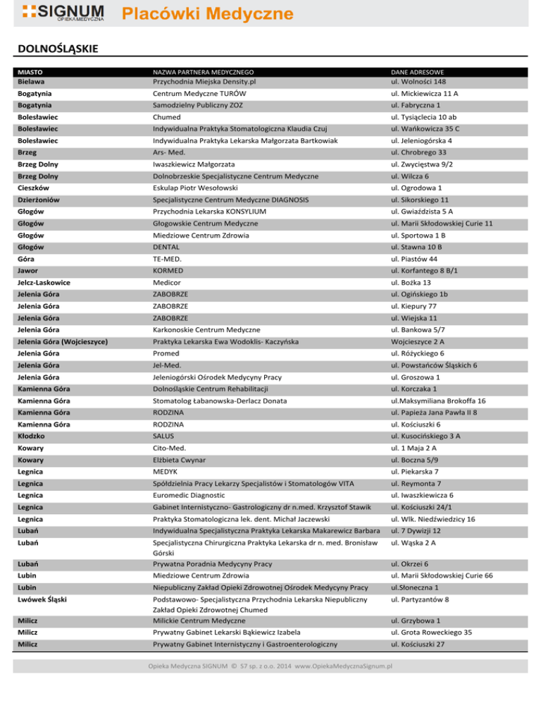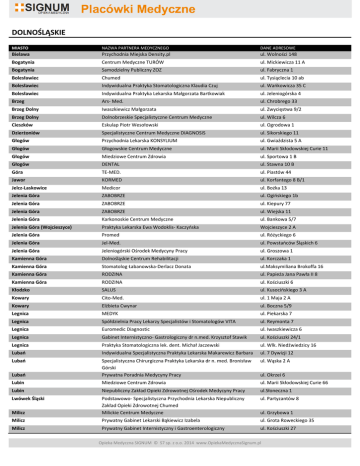 K>EK_>^</ D/^dK NAZWA PARTNERA MEDYCZNEGO DANE ADRESOWE Bielawa Przychodnia Miejska Density.pl Ƶů͘tŽůŶŽƑĐŝϭϰϴ Bogatynia Centrum Medyczne TURÓW ul. Mickiewicza 11 A Bogatynia Samodzielny Publiczny ZOZ ul. Fabryczna 1 ŽůĞƐųĂǁŝĞĐ Chumed Ƶů͘dLJƐŝČĐůĞĐŝĂϭϬĂď ŽůĞƐųĂǁŝĞĐ Indywidualna Praktyka Stomatologiczna Klaudia Czuj Ƶů͘tĂŷŬŽǁŝĐnjĂϯϱ ŽůĞƐųĂǁŝĞĐ /ŶĚLJǁŝĚƵĂůŶĂWƌĂŬƚLJŬĂ>ĞŬĂƌƐŬĂDĂųŐŽƌnjĂƚĂĂƌƚŬŽǁŝĂŬ ul. Jeleniogórska 4 Brzeg Ars-‐ Med. Ƶů͘ŚƌŽďƌĞŐŽϯϯ Brzeg Dolny /ǁĂƐnjŬŝĞǁŝĐnjDĂųŐŽƌnjĂƚĂ Ƶů͘ǁLJĐŝħƐƚǁĂϵͬϮ Brzeg Dolny Dolnobrzeskie Specjalistyczne Centrum Medyczne ul. Wilcza 6 Cieszków ƐŬƵůĂƉWŝŽƚƌtĞƐŽųŽǁƐŬŝ ul. Ogrodowa 1 njŝĞƌǏŽŶŝſǁ Specjalistyczne Centrum Medyczne DIAGNOSIS ul. Sikorskiego 11 'ųŽŐſǁ Przychodnia Lekarska KONSYLIUM Ƶů͘'ǁŝĂǍĚnjŝƐƚĂϱ 'ųŽŐſǁ 'ųŽŐŽǁƐŬŝĞĞŶƚƌƵŵDĞĚLJĐnjŶĞ Ƶů͘DĂƌŝŝ^ŬųŽĚŽǁƐŬŝĞũƵƌŝĞϭϭ 'ųŽŐſǁ Miedziowe Centrum Zdrowia Ƶů͘^ƉŽƌƚŽǁĂϭ 'ųŽŐſǁ DENTAL Ƶů͘^ƚĂǁŶĂϭϬ Góra TE-‐MED. ul. Piastów 44 Jawor KORMED Ƶů͘<ŽƌĨĂŶƚĞŐŽϴͬϭ :ĞůĐnj-‐>ĂƐŬŽǁŝĐĞ Medicor Ƶů͘ŽǏŬĂϭϯ Jelenia Góra KZ Ƶů͘KŐŝŷƐŬŝĞŐŽϭď Jelenia Góra KZ ul. Kiepury 77 Jelenia Góra KZ ul. Wiejska 11 Jelenia Góra Karkonoskie Centrum Medyczne Ƶů͘ĂŶŬŽǁĂϱͬϳ :ĞůĞŶŝĂ'ſƌĂ;tŽũĐŝĞƐnjLJĐĞͿ Praktyka Lekarska Ewa Wodoklis-‐ <ĂĐnjLJŷƐŬĂ Promed Wojcieszyce 2 A Jelenia Góra Jelenia Góra Jel-‐Med. Ƶů͘WŽǁƐƚĂŷĐſǁ_ůČƐŬŝĐŚϲ Jelenia Góra :ĞůĞŶŝŽŐſƌƐŬŝKƑƌŽĚĞŬDĞĚLJĐLJŶLJWƌĂĐLJ ul. Groszowa 1 <ĂŵŝĞŶŶĂ'ſƌĂ ŽůŶŽƑůČƐŬŝĞĞŶƚƌƵŵZĞŚĂďŝůŝƚĂĐũŝ ul. Korczaka 1 <ĂŵŝĞŶŶĂ'ſƌĂ ^ƚŽŵĂƚŽůŽŐBĂďĂŶŽǁƐŬĂ-‐Derlacz Donata Ƶů͘DĂŬƐLJŵŝůŝĂŶĂƌŽŬŽĨĨĂϭϲ <ĂŵŝĞŶŶĂ'ſƌĂ RODZINA Ƶů͘WĂƉŝĞǏĂ:ĂŶĂWĂǁųĂ//ϴ Ƶů͘ZſǏLJĐŬŝĞŐŽϲ <ĂŵŝĞŶŶĂ'ſƌĂ RODZINA Ƶů͘<ŽƑĐŝƵƐnjŬŝϲ <ųŽĚnjŬŽ SALUS Ƶů͘<ƵƐŽĐŝŷƐŬŝĞŐŽϯ <ŽǁĂƌLJ Cito-‐Med. ul. 1 Maja 2 A <ŽǁĂƌLJ ůǏďŝĞƚĂǁLJŶĂƌ Ƶů͘ŽĐnjŶĂϱͬϵ >ĞŐŶŝĐĂ MEDYK ul. Piekarska 7 >ĞŐŶŝĐĂ ^ƉſųĚnjŝĞůŶŝĂWƌĂĐLJ>ĞŬĂƌnjLJ^ƉĞĐũĂůŝƐƚſǁŝ^ƚŽŵĂƚŽůŽŐſǁs/d ul. Reymonta 7 >ĞŐŶŝĐĂ Euromedic Diagnostic ul. Iwaszkiewicza 6 >ĞŐŶŝĐĂ Gabinet Internistyczno-‐ Gastrologiczny dr n.med. Krzysztof Stawik Ƶů͘<ŽƑĐŝƵƐnjŬŝϮϰͬϭ >ĞŐŶŝĐĂ WƌĂŬƚLJŬĂ^ƚŽŵĂƚŽůŽŐŝĐnjŶĂůĞŬ͘ĚĞŶƚ͘DŝĐŚĂų:ĂĐnjĞǁƐŬŝ Ƶů͘tůŬ͘EŝĞĚǍǁŝĞĚnjŝĐLJϭϲ >ƵďĂŷ /ŶĚLJǁŝĚƵĂůŶĂ^ƉĞĐũĂůŝƐƚLJĐnjŶĂWƌĂŬƚLJŬĂ>ĞŬĂƌƐŬĂDĂŬĂƌĞǁŝĐnjĂƌďĂƌĂ ul. 7 Dywizji 12 >ƵďĂŷ Ƶů͘tČƐŬĂϮ >ƵďĂŷ ^ƉĞĐũĂůŝƐƚLJĐnjŶĂŚŝƌƵƌŐŝĐnjŶĂWƌĂŬƚLJŬĂ>ĞŬĂƌƐŬĂĚƌŶ͘ŵĞĚ͘ƌŽŶŝƐųĂǁ Górski Prywatna Poradnia Medycyny Pracy Lubin Miedziowe Centrum Zdrowia Ƶů͘DĂƌŝŝ^ŬųŽĚŽǁƐŬŝĞũƵƌŝĞϲϲ Lubin EŝĞƉƵďůŝĐnjŶLJĂŬųĂĚKƉŝĞŬŝĚƌŽǁŽƚŶĞũKƑƌŽĚĞŬDĞĚLJĐLJŶLJWƌĂĐLJ Ƶů͘^ųŽŶĞĐnjŶĂϭ >ǁſǁĞŬ_ůČƐŬŝ ul. Partyzantów ϴ DŝůŝĐnj Podstawowo-‐ Specjalistyczna Przychodnia Lekarska Niepubliczny ĂŬųĂĚKƉŝĞŬŝĚƌŽǁŽƚŶĞũŚƵŵĞĚ Milickie Centrum Medyczne DŝůŝĐnj WƌLJǁĂƚŶLJ'ĂďŝŶĞƚ>ĞŬĂƌƐŬŝČŬŝĞǁŝĐnj/njĂďĞůĂ Ƶů͘'ƌŽƚĂZŽǁĞĐŬŝĞŐŽϯϱ DŝůŝĐnj Prywatny Gabinet Internistyczny i Gastroenterologiczny Ƶů͘<ŽƑĐŝƵƐnjŬŝϮϳ ul. Okrzei 6 ul. Grzybowa 1 Opieka Medyczna SIGNUM © S7 sp. z o.o. 2014 www.OpiekaMedycznaSignum.pl DŝůŝĐnj Ƶů͘<ŽƉĞƌŶŝŬĂϭϱ KůĞƑŶŝĐĂ Indywidualna Specjalistyczna Praktyka Stomatologiczna lek.stom. Centrum Medyczne "Medyk" KůĞƑŶŝĐĂ Centrum Medyczne "Medyk" Ƶů͘ϯ-‐ŐŽDĂũĂϰϯ-‐46 KůĞƑŶŝĐĂ Prywatne Centrum Stomatologiczne ul. ^ƉŽŬŽũŶĂϮ KųĂǁĂ Ewa-‐Med. ul. Chrobrego 64 A KųĂǁĂ ŝĂŐŶŽƐƚLJŬĂ^ƉſųŬĂ<ŽŵĂŶĚLJƚŽǁĂ ul. Chrobrego 64 A WŽůŬŽǁŝĐĞ WŽůŬŽǁŝĐŬŝĞĞŶƚƌƵŵhƐųƵŐĚƌŽǁŽƚŶLJĐŚ Ƶů͘<͘͘<ŽŵŝŶŬĂϳ ZĂĐŝďŽƌŽǁŝĐĞ'ſƌŶĞ Chumed Ƶů͘tĂƌƚĂŽůĞƐųĂǁŝĐŬĂϰϬ ^ƚƌnjĞŐŽŵ EK'Zs/ƚ ĂŬųĂĚhƐųƵŐDĞĚLJĐnjŶLJĐŚWŽƌĂĚŶŝĂDĞĚLJĐLJŶLJWƌĂĐLJ Ƶů͘<ŽƑĐŝƵƐnjŬŝϴ ^ƚƌnjĞůŝŶ WƵďůŝĐnjŶLJĂŬųĂĚ>ĞĐnjŶŝĐƚǁĂŵďƵůĂƚŽƌLJũŶĞŐŽ ul. Mickiewicza 20 ^ƚƌnjĞůŝŶ EŝĞƉƵďůŝĐnjŶLJĂŬųĂĚWŽĚƐƚĂǁŽǁĞũKƉŝĞŬŝĚƌŽǁŽƚŶĞũ ul. Kochanowskiego 2 _ĐŝŶĂǁŬĂ_ƌĞĚŶŝĂ Ƶů͘>ĞƑŶĂϴ _ǁŝĚŶŝĐĂ Indywidualna Praktyka Lekarska lek. med. Tomasz Kliche WŽƌĂĚŶŝĂDĞĚLJĐLJŶLJWƌĂĐLJ>KZWĂǁĞų<ŽƐŝŬŽǁƐŬŝ _ǁŝĚŶŝĐĂ KDE/DhƐųƵŐŝDĞĚLJĐnjŶĞWƌLJǁĂƚŶLJ'ĂďŝŶĞƚ/ŶƚĞƌŶŝƐƚLJĐnjŶLJ Wů͘_ǁ͘DĂųŐŽƌnjĂƚLJϭ _ǁŝĚŶŝĐĂ Psychologii Dawid Suchodolski Ƶů͘tĂųďƌnjLJƐŬĂϴ _ǁŝĚŶŝĐĂ ARS-‐MEDICA ul. Marii Konopnickiej 4 Ƶů͘DŝĐŬŝĞǁŝĐnjĂϯ Ƶů͘ĞƌŽŵƐŬŝĞŐŽϭϯͬϭ _ǁŝĞďŽĚnjŝĐĞ MIKULICZ Ƶů͘DĂƌŝŝ^ŬųŽĚŽǁƐŬŝĞũƵƌŝĞϯ-‐7 dƌnjĞďŶŝĐĂ Ƶů͘<ŽƑĐŝƵƐnjŬŝϭϬ dƌnjĞďŶŝĐĂ ^ĂŵŽĚnjŝĞůŶLJWƵďůŝĐnjŶLJĂŬųĂĚKƉŝĞŬŝĚƌŽǁŽƚŶĞũ<B Gabinet Internistyczno-‐ <ĂƌĚŝŽůŽŐŝĐnjŶLJůĞŬ͘<ƌnjLJƐnjƚŽĨtųŽĚĂƌĐnjLJŬ dƌnjĞďŶŝĐĂ Q Dental s.c. ul. Obornicka 41 A hũĞǍĚnjŝĞĐtŝĞůŬŝ Prywatny Gabinet Internistyczny i Gastroenterologiczny hũĞǍĚnjŝĞĐ Wielki 26 tĂųďƌnjLJĐŚ "Intermed" Gabinet Medycyny Pracy ul. Lubelska 1 tĂųďƌnjLJĐŚ Prywatny Gabinet Ginekologiczno-‐WŽųŽǏŶŝĐnjLJ Ƶů͘<ĂƐnjƚĞ