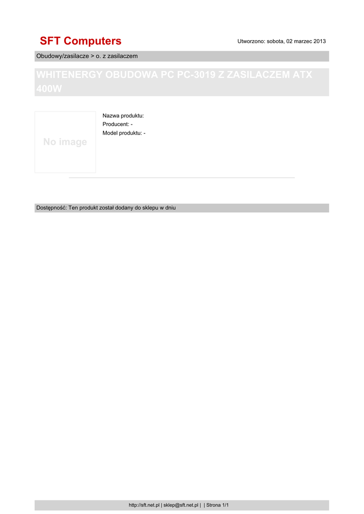 SFT Computers Utworzono: sobota, 02 marzec 2013 Obudowy/zasilacze > o. z zasilaczem WHITENERGY OBUDOWA PC PC-3019 Z ZASILACZEM ATX 400W Nazwa produktu: Producent: Model produktu: - No image Dostępność: Ten produkt został dodany do sklepu w dniu http://sft.net.pl | [email protected] | | Strona 1/1