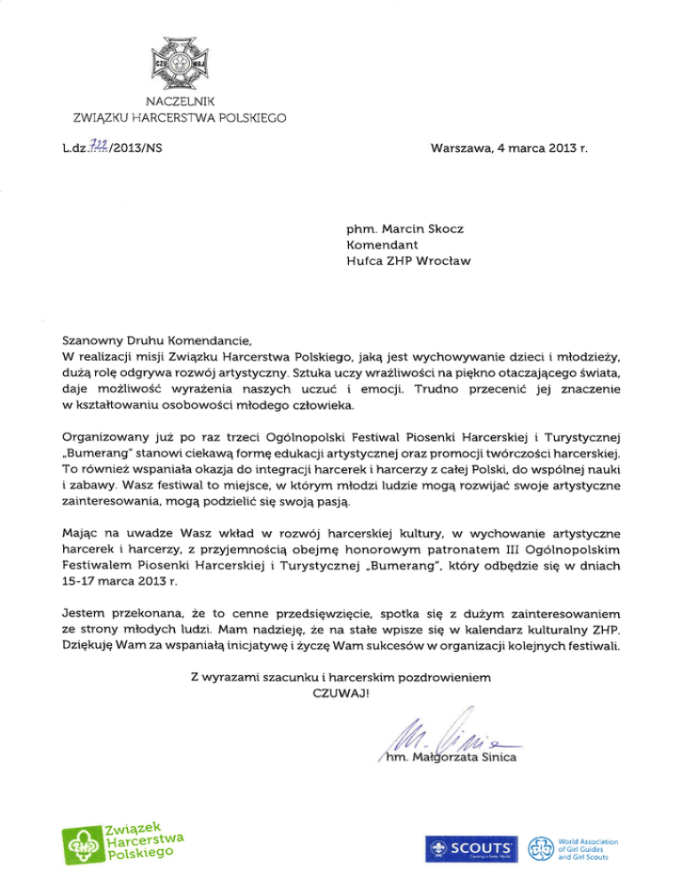ZW I AZKU L.dz. NACZELNIK HARCERSTWA POLS KIEC O Warszawa, 4 rnarca 2OL3 r. /2013/NS phm. Marcin Skocz Komendant Hufca ZHP Wroctaw Szanowny Druhu Komendancie, W realizacji misji Zwi4zku Harcerstwa Polskiego. jakq jest wychowywante dzieci i mtodziezy, duzq rolg odgrywa rozwoj artystyczny. Sztuka uczy wra|liwo6ci na piqkno otaczajqcego Swiata, daje mozliwo6c wyrazenia naszych uczuc i emocji. Trudno przecenic jej znaczenre w ksztahowaniu osobowo6ci mtodego cztowieka. Organizowany ju? po raz trzeci Ogolnopolski Festiwal Piosenki Harcerskiej i Turystycznej ,,Bumerang" stanowi ciekawq formq edukacji artystycznej orazpromocji tw6rczo5ci harcerskiej. To rownie2 wspaniata okazja do integracji harcerek i harcerzy z calej Polski, clo wspolnej nauki i zabawy. Wasz festiwal to miejsce, w ktorym mtodzi ludzie mogE rozwijac swoje artystyczne zainteresowania, mogq podzieltc siq swojq pasjE. w rozwoj harcerskiej kultury, w wychowanie artystyczne harcerek i harcerzy, z przyjemno5ciq obejmq honorowym patronatem II1, Ogolnopolskim Festiwalem Piosenki Harcerskiej i Turystycznej ,,Bumerang", ktory odbqelzie siq w dniach L5-L7 marca 2OL3 r. Maj4c na uwadze Wasz wktad Jestem przekonana, 2e to cenne przedsiqwziqcie, spotka siq z duzym zainteresowaniem ze strony mtodych ludzi. Mam nadziejq, ze na state wpisze siq w kalendarz kulturalny ZHP. Dziqkujg Wam za wspaniat4 inicjatywgiZyczg Wam sukcesow w organizacji kolejnych festiwali. Z wyr azami szacunku i harcerskim pozdrowieniem CZUWAJ ! fi:l?"j5*" Potskiego 6Dr \3Y y,'il i 2'":::'i'''" unaciJi.o"tt