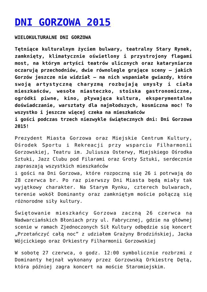 DNI GORZOWA 2015 WIELOKULTURALNE DNI GORZOWA Tętniące kulturalnym życiem bulwary, teatralny Stary Rynek, zamknięty, klimatycznie oświetlony i przystrojony flagami most, na którym artyści teatrów ulicznych oraz kataryniarze oczarują przechodniów, dwie równolegle grające sceny – jakich Gorzów jeszcze nie widział – na nich wspaniałe gwiazdy, które swoją artystyczną charyzmą rozbujają umysły i ciała mieszkańców, wesołe miasteczko, stoiska gastronomiczne, ogródki piwne, kino, pływająca kultura, eksperymentalne doświadczanie, warsztaty dla najmłodszych, kosmiczna moc! To wszystko i jeszcze więcej czeka na mieszkańców i gości podczas trzech niezwykle świątecznych dni: Dni Gorzowa 2015! Prezydent Miasta Gorzowa oraz Miejskie Centrum Kultury, Ośrodek Sportu i Rekreacji przy wsparciu Filharmonii Gorzowskiej, Teatru im. Juliusza Osterwy, Miejskiego Ośrodka Sztuki, Jazz Clubu pod Filarami oraz Groty Sztuki, serdecznie zapraszają wszystkich mieszkańców i gości na Dni Gorzowa, które rozpoczną się 26 i potrwają do 28 czerwca br. Po raz pierwszy Dni Miasta będą miały tak wyjątkowy charakter. Na Starym Rynku, czterech bulwarach, terenie wokół Dominanty oraz zamkniętym moście połączą się różnorodne siły kultury. Świętowanie mieszkańcy Gorzowa zaczną 26 czerwca na Nadwarciańskich Błoniach przy ul. Fabrycznej, gdzie na głównej scenie w ramach Zjednoczonych Sił Kultury odbędzie się koncert „Przetańczyć całą noc” z udziałem Grażyny Brodzińskiej, Jacka Wójcickiego oraz Orkiestry Filharmonii Gorzowskiej W sobotę 27 czerwca, o godz. 12:00 symbolicznie rozbrzmi z Dominanty hejnał wykonany przez Gorzowską Orkiestrę Dętą, która później zagra koncert na moście Staromiejskim. Na Starym Rynku odbędą się dwa spektakle: „Parada śmiesznych twarzy” oraz „Poza czasem”. Na scenie głównej zagrają takie gwiazdy, jak: Muzyka Końca Lata, Weekend, Najlepszy Przekaz w Mieście, Ray Wilson and Genesis Classic Orchestra, Awiński Show. Na scenie znajdującej się na bulwarze Wschodnim wystąpią: Centrum Uśmiechu, Pesos Sax, Orkiestra Filharmonii Gorzowskiej, The Flash, Król. W tym dniu nastąpi oficjalna „odsłona” rzeźb Ewy Kozubal oraz Ewy Bone, Hufiec ZHP rozpali wielkie ognisko, DKF ma wychodne!, więc zaprosi na film „Uciec na Pitcarin” oraz autorskie spotkanie z artystami. Fani muzyki klubowej będą mogli odpalić Pozytyv’kę razem z Kubą Sojką w CKN Centrala. W niedzielę, 28 czerwca, na bulwarze Zachodnim czekają na widzów spektakle teatralne „250 Minut z Klasyką Polską”, na scenie głównej wystąpią: Agata Ambroży, Cocktailboys, Lion Vibrations oraz Zakopower. Natomiast na scenie na bulwarze Wschodnim podziwiać będzie można gorzowskie zespoły taneczne oraz RWA, TroleyBlues, Endrju, Forbidden Souls i Grubszą Stronę Rabarbaru. Ponadto, przez cały weekend na wszystkich czeka moc rozrywkowych wrażeń. Mobilne planetarium z zajęciami dla dzieci, kursy statkiem od gorzowskiej Mariny na bulwar Zachodni, rejsy lodołamaczem Kuna, na którym wystąpi również zespół dixilandowy, pokazy techniczne „Szalony inżynier”, ścianka wspinaczkowa, wystawa Automobili, miasteczko cyfryzacji. Wszyscy fani i nie tylko filmowej sagi Gwiezdne Wojny mogą spodziewać się energetycznych chwil w Miasteczku Kosmicznej Mocy. Grupa historyczna zaprasza na prezentację wypieków „podpłomyków” połączoną z warsztatami dla dzieci i dorosłych oraz strefą pokazów walki na średniowieczną broń wraz z możliwością udziału widzów. Dźwięki koncertów w powietrzu zmiksują się z dźwiękiem radosnego śmiechu dzieci, na które czekają warsztaty na stoisku artystyczno-rzeźbiarskim, gry, zabawy, zajęcia plastyczne, dmuchańce oraz wspaniałe wesołe miasteczko. W tłumie uczestników imprezy będzie można spotkać oryginalne akcenty tworzone przez Glinoludy, performerów oraz cyrkowców. Relaks organizatorzy zaplanowali przy stoiskach gastronomicznych, ogródkach piwnych, stoiskach wegetariańskich, stoiskach powiatowych – na których okoliczne gminy pokażą wszystko co mają najlepsze, a budki z rękodziełem oczarują kreatywnością i gorzowską twórczością. Dodatkowo czas będzie można spędzić w Miasteczku Seniorów lub podziwiać wystawę Gorzowskiej Galerii Architektury. Dni Gorzowa to święto miasta, święto jego mieszkańców, święto jego gości! To czas połączenia sił bardzo wielu ludzi, wielu kulturalnych klimatów, wielu pozytywnych energii. To czas, kiedy w kalendarzu w datach 26 – 28 czerwca trzeba wielkimi literami napisać: świętuję DNI GORZOWA! Spotkajmy się tam wszyscy! Szczegółowy program Dni Gorzowa znajduje się na stronie: www.facebook.com/dnigorzowa Organizatorzy serdecznie dziękują za pomoc w realizacji Dni Gorzowa: Centrum Handlowemu Nova Park, Zakładowi Utylizacji Odpadów, Przedsiębiorstwu Wodociągów i Kanalizacji w Gorzowie Wlkp. realizującemu projekt „Zapewnienie prawidłowej gospodarki wodno-ściekowej na terenie miasta Gorzowa Wlkp.” współfinansowany przez Unię Europejską ze środków Funduszu Spójności w Ramach Programu Infrastruktura i Środowisko. Ponadto dziękują Kwiaciarni Dracena, firmie Starmedica oraz Mercedes-Benz. Ewelina Chruścińska-Jackowiak Biuro Prasowe dgw