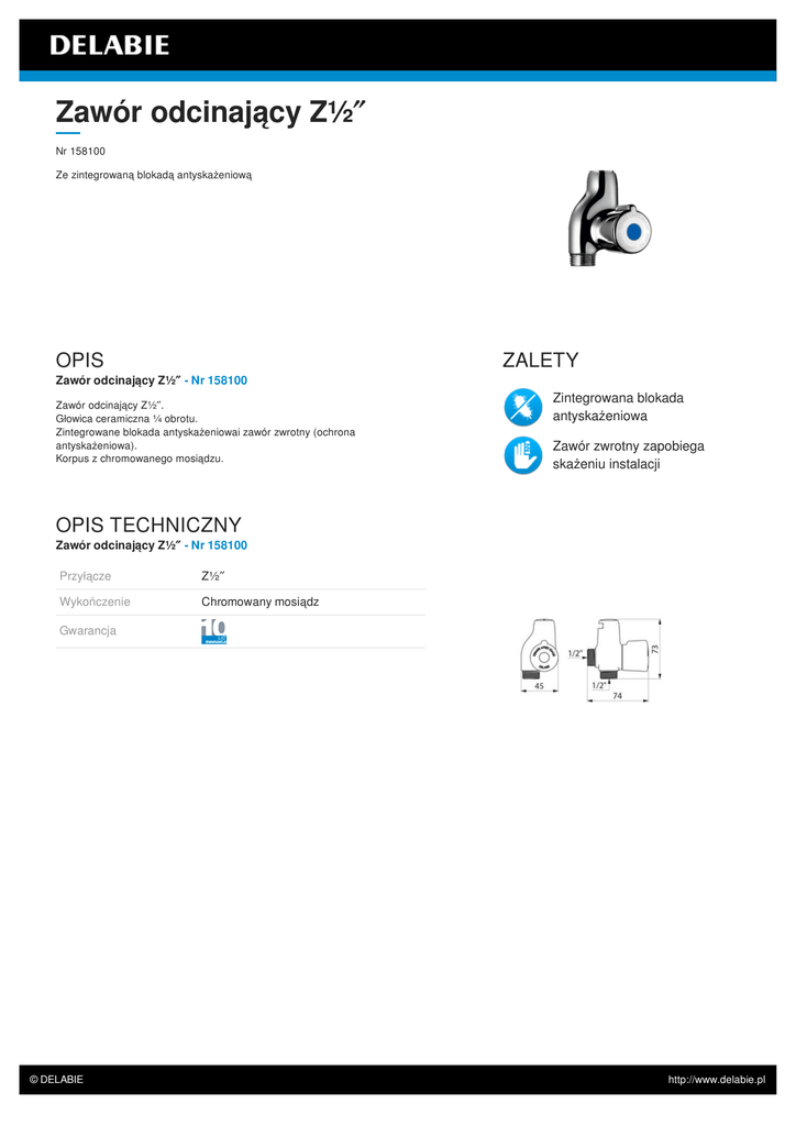 Zawór odcinający Z½² Nr 158100 Ze zintegrowaną blokadą antyskażeniową OPIS ZALETY Zawór odcinający Z½² - Nr 158100 Zawór odcinający Z½². Głowica ceramiczna ¼ obrotu. Zintegrowane blokada antyskażeniowai zawór zwrotny (ochrona antyskażeniowa). Korpus z chromowanego mosiądzu. Zintegrowana blokada antyskażeniowa Zawór zwrotny zapobiega skażeniu instalacji OPIS TECHNICZNY Zawór odcinający Z½² - Nr 158100 Przyłącze Z½² Wykończenie Chromowany mosiądz Gwarancja © DELABIE http://www.delabie.pl