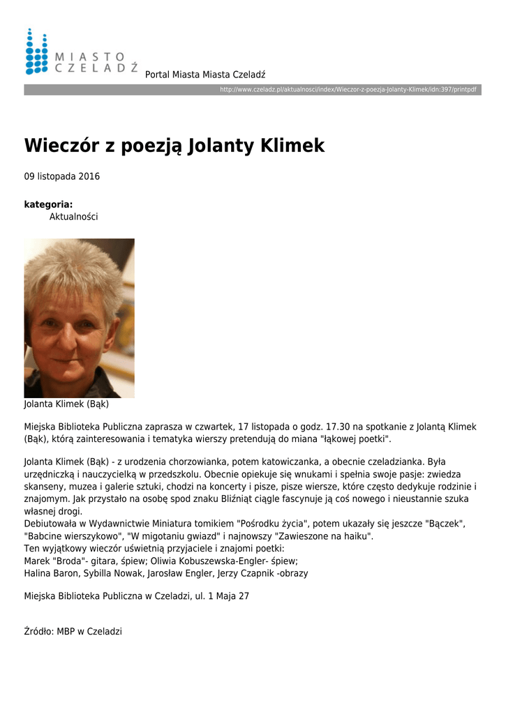 Portal Miasta Miasta Czeladź http://www.czeladz.pl/aktualnosci/index/Wieczor-z-poezja-Jolanty-Klimek/idn:397/printpdf Wieczór z poezją Jolanty Klimek 09 listopada 2016 kategoria: Aktualności Jolanta Klimek (Bąk) Miejska Biblioteka Publiczna zaprasza w czwartek, 17 listopada o godz. 17.30 na spotkanie z Jolantą Klimek (Bąk), którą zainteresowania i tematyka wierszy pretendują do miana "łąkowej poetki". Jolanta Klimek (Bąk) - z urodzenia chorzowianka, potem katowiczanka, a obecnie czeladzianka. Była urzędniczką i nauczycielką w przedszkolu. Obecnie opiekuje się wnukami i spełnia swoje pasje: zwiedza skanseny, muzea i galerie sztuki, chodzi na koncerty i pisze, pisze wiersze, które często dedykuje rodzinie i znajomym. Jak przystało na osobę spod znaku Bliźniąt ciągle fascynuje ją coś nowego i nieustannie szuka własnej drogi. Debiutowała w Wydawnictwie Miniatura tomikiem "Pośrodku życia", potem ukazały się jeszcze "Bączek", "Babcine wierszykowo", "W migotaniu gwiazd" i najnowszy "Zawieszone na haiku". Ten wyjątkowy wieczór uświetnią przyjaciele i znajomi poetki: Marek "Broda"- gitara, śpiew; Oliwia Kobuszewska-Engler- śpiew; Halina Baron, Sybilla Nowak, Jarosław Engler, Jerzy Czapnik -obrazy Miejska Biblioteka Publiczna w Czeladzi, ul. 1 Maja 27 Źródło: MBP w Czeladzi