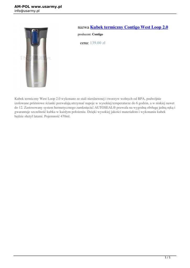 AM-POL www.usarmy.pl [email protected] nazwa Kubek termiczny Contigo West Loop 2.0 producent: Contigo cena: 139.00 zł Kubek termiczny West Loop 2.0 wykonano ze stali nierdzewnej i tworzyw wolnych od BPA, podwójnie izolowane próżniowe ścianki pozwalają utrzymać napoje w wysokiej temperaturze do 6 godzin, a w niskiej nawet do 12. Zastosowany system hermetycznego zamknięcia AUTOSEAL® pozwala na wygodną obsługę jedną ręką i gwarantuje szczelność kubka w każdym położeniu. Dzięki wysokiej jakości materiałom i wykonaniu kubek będzie służył latami. Pojemność 470ml. 1/1