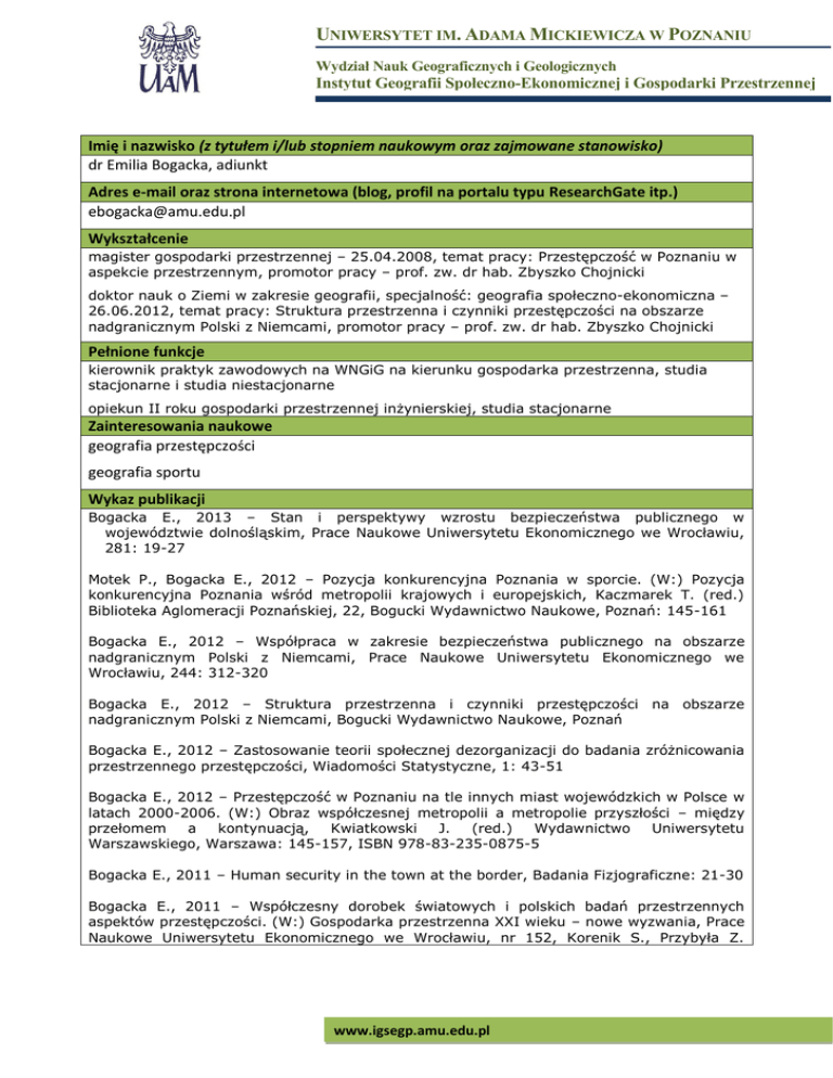 UNIWERSYTET IM. ADAMA MICKIEWICZA W POZNANIU Wydział Nauk Geograficznych i Geologicznych Instytut Geografii Społeczno-Ekonomicznej i Gospodarki Przestrzennej Imię i nazwisko (z tytułem i/lub stopniem naukowym oraz zajmowane stanowisko) dr Emilia Bogacka, adiunkt Adres e-mail oraz strona internetowa (blog, profil na portalu typu ResearchGate itp.) [email protected] Wykształcenie magister gospodarki przestrzennej – 25.04.2008, temat pracy: Przestępczość w Poznaniu w aspekcie przestrzennym, promotor pracy – prof. zw. dr hab. Zbyszko Chojnicki doktor nauk o Ziemi w zakresie geografii, specjalność: geografia społeczno-ekonomiczna – 26.06.2012, temat pracy: Struktura przestrzenna i czynniki przestępczości na obszarze nadgranicznym Polski z Niemcami, promotor pracy – prof. zw. dr hab. Zbyszko Chojnicki Pełnione funkcje kierownik praktyk zawodowych na WNGiG na kierunku gospodarka przestrzenna, studia stacjonarne i studia niestacjonarne opiekun II roku gospodarki przestrzennej inżynierskiej, studia stacjonarne Zainteresowania naukowe geografia przestępczości geografia sportu Wykaz publikacji Bogacka E., 2013 – Stan i perspektywy wzrostu bezpieczeństwa publicznego w województwie dolnośląskim, Prace Naukowe Uniwersytetu Ekonomicznego we Wrocławiu, 281: 19-27 Motek P., Bogacka E., 2012 – Pozycja konkurencyjna Poznania w sporcie. (W:) Pozycja konkurencyjna Poznania wśród metropolii krajowych i europejskich, Kaczmarek T. (red.) Biblioteka Aglomeracji Poznańskiej, 22, Bogucki Wydawnictwo Naukowe, Poznań: 145-161 Bogacka E., 2012 – Współpraca w zakresie bezpieczeństwa publicznego na obszarze nadgranicznym Polski z Niemcami, Prace Naukowe Uniwersytetu Ekonomicznego we Wrocławiu, 244: 312-320 Bogacka E., 2012 – Struktura przestrzenna i czynniki przestępczości na obszarze nadgranicznym Polski z Niemcami, Bogucki Wydawnictwo Naukowe, Poznań Bogacka E., 2012 – Zastosowanie teorii społecznej dezorganizacji do badania zróżnicowania przestrzennego przestępczości, Wiadomości Statystyczne, 1: 43-51 Bogacka E., 2012 – Przestępczość w Poznaniu na tle innych miast wojewódzkich w Polsce w latach 2000-2006. (W:) Obraz współczesnej metropolii a metropolie przyszłości – między przełomem a kontynuacją, Kwiatkowski J. (red.) Wydawnictwo Uniwersytetu Warszawskiego, Warszawa: 145-157, ISBN 978-83-235-0875-5 Bogacka E., 2011 – Human security in the town at the border, Badania Fizjograficzne: 21-30 Bogacka E., 2011 – Współczesny dorobek światowych i polskich badań przestrzennych aspektów przestępczości. (W:) Gospodarka przestrzenna XXI wieku – nowe wyzwania, Prace Naukowe Uniwersytetu Ekonomicznego we Wrocławiu, nr 152, Korenik S., Przybyła Z. www.igsegp.amu.edu.pl UNIWERSYTET IM. ADAMA MICKIEWICZA W POZNANIU Wydział Nauk Geograficznych i Geologicznych Instytut Geografii Społeczno-Ekonomicznej i Gospodarki Przestrzennej (red.), Wydawnictwo Uniwersytetu Ekonomicznego we Wrocławiu, Wrocław: 13-24 Bogacka E., 2011 – Rola bezpieczeństwa publicznego w funkcjonowaniu i rozwoju Poznania. (W:) Gospodarka lokalna w teorii i praktyce, Prace Naukowe Uniwersytetu Ekonomicznego we Wrocławiu, nr 179, Brol R., Sztando A. (red.), Wydawnictwo Uniwersytetu Ekonomicznego we Wrocławiu, Wrocław: 196-205 Bogacka E., 2010 – Porównywalność danych statystycznych o przestępczości między krajami europejskimi. Wiadomości Statystyczne, 11: 68-78 Bogacka E., 2010 – Cross-Border Cooperation on Security in Europe. Quaestiones Geographicae, 29 (4): 41-51 Motek P., Kossowski T., Bogacka E., 2010 – Sport w aglomeracji poznańskiej. Biblioteka Aglomeracji Poznańskiej, 7, Bogucki Wydawnictwo Naukowe, Poznań:106, ISBN 978-8362662-32-6 Bogacka E., 2010 – Kradzież w przestrzeni miejskiej – hipotezy a rzeczywistość (W:) Gospodarka przestrzenna społeczeństwu, Tom 1, Ratajczak W., Stachowiak K. (red.), Bogucki Wydawnictwo Naukowe, Poznań: 219-230, ISBN 978-83-62662-21-0 Bogacka E., 2009 – Bezpieczeństwo obszaru nadgranicznego Polski. [W:] Badania podstawowe i aplikacyjne w naukach geograficznych, Kasprzak L. (red). Wydział Nauk Geograficznych i Geologicznych, Instytut Geoekologii i Geoinformacji UAM, Zakład Graficzny UAM, Poznań: 129-134, ISBN 987-83-926256-0-5 Bogacka E., 2009 - Przestępczość w Poznaniu. Biuletyn Instytutu Geografii SpołecznoEkonomicznej i Gospodarki Przestrzennej UAM, Seria Rozwój Regionalny i Polityka Regionalna, 6: 87-100 Bogacka E., 2009 – Poziom i czynniki przestępczości w układzie regionalnym Polski. Biuletyn Instytutu Geografii Społeczno-Ekonomicznej i Gospodarki Przestrzennej UAM, Seria Rozwój Regionalny i Polityka Regionalna, 8: 33-43 Aktywność konferencyjna Bogacka E., 2008 - Przestępczość w Poznaniu [W:] I Ogólnopolski Zjazd Geograficznych Kół Naukowych, Słupsk, 01-03.05.2008 Bogacka E., 2008 – Przestępczość w Poznaniu na tle innych miast wojewódzkich Polski w latach 2000-2006, [W:] IX Konferencja Młodych Badaczy „Metropolia dzisiaj a obraz miasta w nowej metropolii przyszłości”, Warszawa, 08-09.12.2008 Bogacka E., 2009 – Kształtowanie bezpieczeństwa na obszarze nadgranicznym Polski, [W:] IV Ogólnopolska Konferencja Geografów-Doktorantów, Poznań, 25-27.09.2009 Bogacka E., 2010 - Is cross-border cooperation in the field of security a necessity for Europe? [W:] Erasmus IP SEICOP II, Joensuu (Finalndia), 3-14.05.2010 Bogacka E., 2010 – Współczesny dorobek światowych i polskich badań przestrzennych aspektów przestępczości, [W:] VI Konferencja Naukowa „Gospodarka Przestrzenna XXI wieku – Nowe Wyzwania”, Milicz, 7-9.06.2010 www.igsegp.amu.edu.pl UNIWERSYTET IM. ADAMA MICKIEWICZA W POZNANIU Wydział Nauk Geograficznych i Geologicznych Instytut Geografii Społeczno-Ekonomicznej i Gospodarki Przestrzennej Bogacka E., 2010 – Human security in the town at the border, [W:] 1st International Conference on “Cities and their Growth: Sustainability and Fractality”, Po