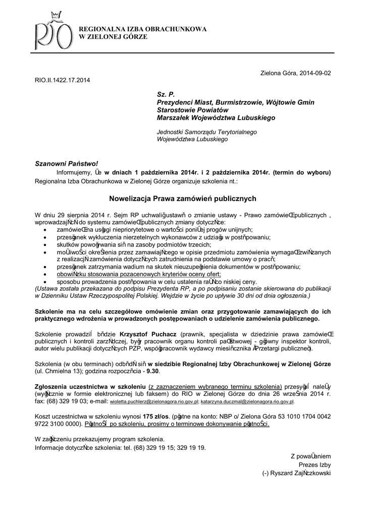 REGIONALNA IZBA OBRACHUNKOWA W ZIELONEJ GÓRZE Zielona Góra, 2014-09-02 RIO.II.1422.17.2014 Sz. P. Prezydenci Miast, Burmistrzowie, Wójtowie Gmin Starostowie Powiatów Marszałek Województwa Lubuskiego Jednostki Samorządu Terytorialnego Województwa Lubuskiego Szanowni Państwo! Informujemy, że w dniach 1 października 2014r. i 2 października 2014r. (termin do wyboru) Regionalna Izba Obrachunkowa w Zielonej Górze organizuje szkolenia nt.: Nowelizacja Prawa zamówień publicznych W dniu 29 sierpnia 2014 r. Sejm RP uchwalił ustawę o zmianie ustawy - Prawo zamówień publicznych , wprowadzającą do systemu zamówień publicznych zmiany dotyczące: · zamówień na usługi niepriorytetowe o wartości poniżej progów unijnych; · przesłanek wykluczenia nierzetelnych wykonawców z udziału w postępowaniu; · skutków powoływania się na zasoby podmiotów trzecich; · możliwości określenia przez zamawiającego w opisie przedmiotu zamówienia wymagań związanych z realizacją zamówienia dotyczących zatrudnienia na podstawie umowy o pracę; · przesłanek zatrzymania wadium na skutek nieuzupełnienia dokumentów w postępowaniu; · obowiązku stosowania pozacenowych kryteriów oceny ofert; · sposobu prowadzenia postępowania w celu ustalenia rażąco niskiej ceny. (Ustawa została przekazana do podpisu Prezydenta RP, a po podpisaniu zostanie skierowana do publikacji w Dzienniku Ustaw Rzeczypospolitej Polskiej. Wejdzie w życie po upływie 30 dni od dnia ogłoszenia.) Szkolenie ma na celu szczegółowe omówienie zmian oraz przygotowanie zamawiających do ich praktycznego wdrożenia w prowadzonych postępowaniach o udzielenie zamówienia publicznego. Szkolenie prowadzić będzie Krzysztof Puchacz (prawnik, specjalista w dziedzinie prawa zamówień publicznych i kontroli zarządczej, były pracownik organu kontroli państwowej - główny inspektor kontroli, autor wielu publikacji dotyczących PZP, współpracownik wydawcy miesięcznika „Przetargi publiczne”). Szkolenia (w obu terminach) odbędą się w siedzibie Regionalnej Izby Obrachunkowej w Zielonej Górze (ul. Chmielna 13); godzina rozpoczęcia - 9.30. Zgłoszenia uczestnictwa w szkoleniu (z zaznaczeniem wybranego terminu szkolenia) przesyłać należy (wyłącznie w formie elektronicznej lub faksem) do RIO w Zielonej Górze do dnia 26 września 2014 r. fax: (68) 329 19 03; e-mail: [email protected]; [email protected]. Koszt uczestnictwa w szkoleniu wynosi 175 zł/os. (płatne na konto: NBP o/ Zielona Góra 53 1010 1704 0042 9722 3100 0000). Płatność po szkoleniu, prosimy o terminowe dokonywanie płatności. W załączeniu przekazujemy program szkolenia. Informacje dotyczące szkolenia: tel. (68) 329 19 15; 329 19 19. Z poważaniem Prezes Izby (-) Ryszard Zajączkowski REGIONALNA IZBA OBRACHUNKOWA W ZIELONEJ GÓRZE Szkolenie Nowelizacja Prawa zamówień publicznych Termin (do wyboru): 1 października 2014 r. lub 2 października 2014 r. Miejsce: RIO Zielona Góra (ul. Chmielna 13) Godzina rozpoczęcia: 9.30 Prowadzący: Krzysztof Puchacz Koszt uczestnictwa w szkoleniu: 175 zł/os. Zgłoszenia uczestnictwa w szkoleniu przesyłać należy (wyłącznie w formie elektronicznej lub faksem) do RIO w Zielonej Górze do dnia 26 września 2014 r.: fax: (68) 329 19 03; e-mail: [email protected]; [email protected]. PROGRAM 1. 2. 3. 4. 5. 6. 7. 8. 9. Zmiany w zakresie postępowania na usługi niepriorytetowe o wartości poniżej progów unijnych (wyłączenie obowiązku przeprowadzania przetargu nieograniczonego). Zmiany w zakresie ujawniania tajemnicy przedsiębiorstwa (wskazanie wykonawcy jako strony na której spoczywa ciężar udowodnienia tajemnicy przedsiębiorstwa). Wyeliminowanie dotychczasowych przesłanek wykluczenia wykonawcy związanych z nierzetelnym wykonywaniem zamówień i zastąpienie ich fakultatywną przesłanką wykluczenia wykonawcy, który w okresie 3 lat przed wszczęciem postępowania, w sposób zawiniony poważnie naruszył obowiązki zawodowe, w szczególności gdy wykonawca w wyniku zamierzonego działania lub rażącego niedbalstwa nie wykonał lub nienależycie wykonał zamówienie, co zamawiający jest w stanie wykazać za pomocą dowolnych środków dowodowych, pod warunkiem, że zamawiający przewidział taką przesłankę wykluczenia w ogłoszeniu o zamówieniu lub w specyfikacji istotnych warunków zamówienia. Zmiany w zakresie dotyczącym powoływania się na zasoby podmiotów trzecich w zakresie możliwości powoływania się przez wykonawcę na potencjał ekonomiczny innego podmiotu oraz przewidzenie odpowiedzialności solidarnej wykonawcy oraz podmiotu udostępniającego zasoby w przypadku wystąpienia szkody zamawiającego z przyczyny zawinionego nieudostępnienia zasobów przez ten podmiot. Wprowadzenie możliwości określenia przez zamawiającego w opisie przedmiotu zamówienia wymagań związanych z realizacją zamówienia dotyczących zatrudnienia na podstawie umowy o pracę przez wykonawcę lub podwykonawcę osób wykonujących czynności w trakcie realizacji zamówienia publicznego na roboty budowlane lub usługi, jeżeli jest to uzasadnione przedmiotem tych czynności. Zmiany w zakresie zatrzymania wadium m.in. służące ograniczeniu możliwości zatrzymania wadium wyłącznie do tych wykonawców, którzy nie uzupełnili dokumentów w odpowiedzi na wezwanie zamawiającego, co skutkowało brakiem możliwości wybrania oferty. Wprowadzenie obowiązku stosowania kryteriów pozacenowych. Modyfikacje zasad ustalania rażąco niskiej ceny (wskaźnik procentowy wyznaczający granice rażąco niskiej ceny). Pytania i odpowiedzi. Zgłoszenie uczestnictwa w szkoleniu : Nowelizacja Prawa zamówień publicznych w roku 2014 roku Terminy (do wyboru): □ □ 1 października 2014 r. 2 października 2014 r. ……………………………………………………… ............................................... (jednostka- dane do wystawienia rachunku) (telefon) ………………………