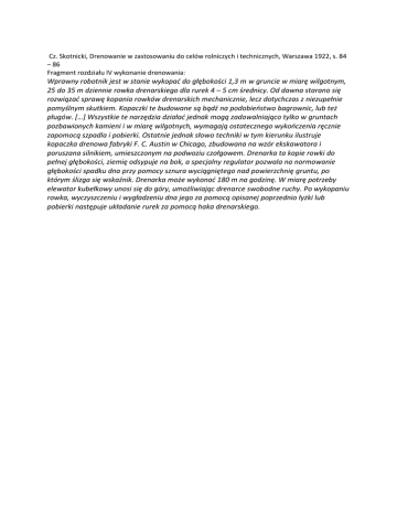 Cz. Skotnicki, Drenowanie w zastosowaniu do celów rolniczych i technicznych, Warszawa 1922, s. 84 – 86 Fragment rozdziału IV wykonanie drenowania: Wprawny robotnik jest w stanie wykopać do głębokości 1,3 m w gruncie w miarę wilgotnym, 25 do 35 m dziennie rowka drenarskiego dla rurek 4 – 5 cm średnicy. Od dawna starano się rozwiązać sprawę kopania rowków drenarskich mechanicznie, lecz dotychczas z niezupełnie pomyślnym skutkiem. Kopaczki te budowane są bądź na podobieństwo bagrownic, lub też pługów. […] Wszystkie te narzędzia działać jednak mogą zadowalniająco tylko w gruntach pozbawionych kamieni i w miarę wilgotnych, wymagają ostatecznego wykończenia ręcznie zapomocą szpadla i pobierki. Ostatnie jednak słowo techniki w tym kierunku ilustruje kopaczka drenowa fabryki F. C. Austin w Chicago, zbudowana na wzór ekskawatora i poruszana silnikiem, umieszczonym na podwoziu czołgowem. Drenarka ta kopie rowki do pełnej głębokości, ziemię odsypuje na bok, a specjalny regulator pozwala na normowanie głębokości spadku dna przy pomocy sznura wyciągniętego nad powierzchnię gruntu, po którym ślizga się wskaźnik. Drenarka może wykonać 180 m na godzinę. W miarę potrzeby elewator kubełkowy unosi się do góry, umożliwiając drenarce swobodne ruchy. Po wykopaniu rowka, wyczyszczeniu i wygładzeniu dna jego za pomocą opisanej poprzednio łyżki lub pobierki następuje układanie rurek za pomocą haka drenarskiego.