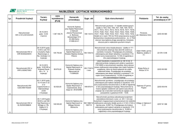 NAJBLIŻSZE LICYTACJE NIERUCHOMOŚCI Lp. Przedmiot licytacji Termin licytacji Nieruchomość: KW nr KI1L/00143433/5 28.10.2015 godz. 14:00 /I termin/ Nieruchomość KW nr WR1S/00022305/5 29.10.2015 godz. 12:00 w sali 103 w budynku Sądu Rejonowego ul. Św. Andrzeja 3 (I licytacja) cena wywoławcza [PLN] Komornik prowadzący 1 387 168,79 Komornik Sądowy przy Sądzie Rejonowym w Kielcach Jolanta Piwowarczyk ul. Bartosza Głowackiego 5/13 25-368 Kielce 41/368-24-41 Sygn. akt Opis nieruchomości Położenie Nieruchomość gruntowa - 31 działek ewidencyjnych: działki nr 75/4, 75/5, 75/6, 75/7, 75/8, 75/9, 75/10, 75/11, 75/12, 75/13, 75/14, 75/15, 75/16, 75/17, 75/18, 75/19, 75/20, 75/21, 75/22, 75/23, 75/24, 75/25, 75/26, Porzecze, KM 110/15 75/27, 75/28, 75/29, 75/30, 75/31, 75/32, 75/33, 75/34. gm. Miedziana Góra Działki od nr ewid. 75/5 do 75/34 przeznaczone są pod budownictwo mieszkaniowe jednorodzinne , dz. nr 75/4 stanowi nieurządzoną drogę wewnętrzną. Kompleks otoczony jest w większości gruntami rolnymi. Tel. do osoby prowadzącej w CF 22/53 95 585 1 2 Nieruchomość KW nr WR1L/00042759/2 30.10.2015 godz. 10:00 SR w Wołowie Rynek 26 s. 14 (I licytacja) Nieruchomość KW CZ2C/00014323/0 03.11.2015 godz. 12:10 sala nr 22 sr w Częstochowie ul. Dąbrowskiego 23/35 (I licytacja) Nieruchomość KW nr EL1E/00033666/9 05.11.2015 godz 09:00 w sali 330 Sąd Rejonowy w Elblągu ul. Płk. Dąbka 8-12 (I licytacja) 105 750,00 99 975,00 Lokal mieszkalny o powierzchni uż. 46,14 m2. Z własnością lokalu związany jest udział w wysokości Komornik Sądowy przy 174/10000 w nieruchomości wspólnej, którą stanowi Sądzie Rejonowym w prawo użytkowania wieczystego oraz części budynku i KM 1730/12 Wołowie Andrzej urządzenia, które nie służą wyłącznie do użytku i inne Mazurczak tel. właścicieli lokalu. Przystępujący do przetargu 71/3894225 zobowiązany jest złożyć rękojmię w wysokości 1/10 części sumy oszacowania tj. 13.330 zł najpóźniej w dniu poprzedzającym licytację. 62 925,00 Komornik Sądowy przy Sądzie Rejonowyn w Częstochowie Jerzy Zając tel. 34/3242656 148 500,00 3 4 5 Nieruchomości 2015-10-27 Nieruchomość rolna niezabudowana - działka nr 7/1 nieruchomość obejmuje dwa zbiorniki wodne po wyrobisku kruszywa. Przystępujący do przetargu zobowiązany jest złożyć rękojmię w wysokości 1/10 części sumy oszacowania tj. 14.100 zł najpóźniej w dniu poprzedzającym licytację. Komornik Sądowy przy Sądzie Rejonowym w KM 1304/14 Środzie Śląskiej Andrzej Pokora Zabór Wielki, gmina Miękinia, działka nr 7/1 22 578 13 96 Brzeg Dolny ul. Wilcza 31/14 22/53 95 592 Dąbrowa 37 gmina Popów 22/53 95 616 Nieruchomość gruntowa zabudowana budynkiem warsztatowo-biurowym o pow. uż. 291,1 m2 oraz Komornik Sądowy przy budynkiem magazynowym przeznaczonym do rozbiórkiSądzie Rejonowym w KM 1566/14; użytkowanie wieczyste działek gruntu nr 214/3; 214/4 o Elbląg ul. Dębowa 2 Elblągu Dariusz 1567/14 łącznej pow. 0,2307 ha. Przystępujący do licytacji C, D Staniucha zobowiązany jest wpłacić rękojmię w wysokości 1/10 ceny oszacowania nieruchomości tj. 19.800 zł najpóźniej w dniu poprzedzającym licytację. 22/57 81 396 Nieruchomość gruntowa - przystępujący do przetargu zobowiązany jest wpłacić rękojmię w wysokości 1/10 ceny oszacowania nieruchomości tj. 8.390 zł najpóźniej KM 875/14 w dniu poprzedzającym licytację. Nieruchomość tą można oglądać codziennie zaś operat szacunkowy znajduje się w kancelari komornika do wglądu w dni powszednie w godzinach 8:00 - 13:00. v34.0 strona 1/ stron3 NAJBLIŻSZE LICYTACJE NIERUCHOMOŚCI Lp. Przedmiot licytacji Termin licytacji Nieruchomość KW nr EL1E/000393901/7 05.11.2015 godz 09:00 w sali 330 Sąd Rejonowy w Elblągu ul. Płk. Dąbka 8-12 (I licytacja) Nieruchomość KW nr GL!G/00025781/6 13.11.2015 godz. 14:00 sala 222 SR w Gliwicach (I licytacja) Nieruchomość KW nr GD1G/00019832/0 19.11.2015 godz. 10:55 w sali A85 w budynku Sądu Rejonowego ul. Piekarnicza 10 Gdańsk (I licytacja) cena wywoławcza [PLN] Opis nieruchomości Położenie Tel. do osoby prowadzącej w CF Nieruchomość gruntowa - działka gruntu nr 214/1 w użytkowaniu wieczystym o pow. 0,2358 ha zabudowana budynkiem magazynowym z częścią socjalną i biurową o pow. użytk. 535,5 m2. Przystępujący do licytacji zobowiązany jest wpłacić rękojmię w wysokości 1/10 ceny oszacowania nieruchomości tj. 26.700 zł najpóźniej w dniu poprzedzającym licytację. Elbląg ul. Dębowa 2 B 22/57 81 396 479 325,00 Prawa własności nieruchomości gruntowej Komornik Sądowy przy zabudowanej budynkiem mieszkalnym jednorodzinnym Sądzie Rejonoowwym w oraz budynkiem gospodarczo garażowym z Gliwicach Grzegorz KM 3684/13 mieszkalnym poddaszem. Przystępujący do licytacji Zachmost tel. zobowiązany jest wpłacić rękojmię w wysokości 1/10 32/2316008 ceny oszacowania nieruchomości tj. 63.910 zł najpóźniej w dniu poprzedzającym licytację. 44-180 Kotulin ul. Kolejowa 9 22/57 81 396 614 250,00 Nieruchomość gruntowa o pow. 282 m2 zabudowana budynkiem mieszkalnym jednorodzinnym w zabudowie Komornik Sądowy przy szeregowej z 1928 roku, przebudowany w 2000 r. Sądzie Rejonowym KM 957/15 Przystępujący do licytacji zobowiązany jest wpłacić Gdańsk - Północ w rękojmię w wysokości 1/10 ceny oszacowania Gdańsku Krzysztof Pluta nieruchomości tj. 81.900 zł najpóźniej w dniu poprzedzającym licytację. Gdańsk, ul. Kraszewskiego Józefa 15 22/57 81 396 126 034,82 Komornik Sądowy przy Sądzie Rejonowym w Przemyślu Mariusz Stasiak tel. 16/6786752 Prawa wieczystego użytkowania działki nr 663 o pow. 0,2942 ha i prawa własności budynku jednokondygnacyjnego - magazyn o powierzchni zabudowy 302,6 m2 pow. użytkowa 267,24 m2. Na KM 794/08 działce znajduje się również droga utwardzona, plac i ogrodzenie. Przystępujący do licytacji zobowiązany jest wpłacić rękojmię w wysokości 1/10 ceny oszacowan