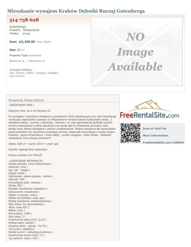 Mieszkanie wynajem Kraków Dębniki Ruczaj Gutenberga 514-738-628 Gutenberga Kraków, Małopolskie Polska (map) Rent: zł1,200.00 PLN / Month Size: 53 m² Property Type: Apartment Bedrooms: 1 | Bathrooms: 1 Included Utilities: Gas / Electric / Water / Sewage / Garbage / Lawn Service Property Description ::DODATKOWY OPIS | Okazyjna cena, vis a vis Campusu UJ Do wynajęcia 2 pokojowe mieszkanie o powierzchni 53m2 zlokalizowane przy ulicy Gutenberga na Ruczaju naprzeciwko Campusu UJ.Mieszkanie to wyróżnia bardzo funkcjonalny układ , 2 oddzielne pokoje , kuchnia z zabudowa , łazienka z wc oraz garderoba.Na podłodze parkiet , kuchnia wyposażona w pełną zabudowę oraz sprzęt agd.Do mieszkania przynależy duży , bardzo ładny balkon.Ddostępne z pełnym umeblowaniem. Miejsca postojowe dla samochodów przed budynkiem.Do mieszkania przynależy piwnica. Doskonała komunikacja w każde miejsce Krakowa , pełna infrastruktura , liczne sklepy , punkty usługowe , kluby fitness , niedaleko całodobowe Tesco.Gorąco polecam!!! Scan or Visit For Opłaty 1200 zł + czynsz 220 zł + prąd i gaz FreeRentalSite.com/238549 Kontakt: Agencja Braci Sadurskich Paulina Lipińska 514-738-628 ::DODATKOWE INFORMACJE | Rodzaj budynku: nowe budownictwo | Głośność: ciche | Gaz: tak - miejski | Dojazd: asfalt | Ogrzewanie: własne gazowe - junkers | Internet: TAK | Komunikacja publ.: autobus | Winda: NIE | Rozkład: dwustronne rozkładowe | Usytuowanie: dwustronne | Opłaty w czynszu: woda | Opłaty wg liczników: prąd, gaz | Rodzaj mieszkania: jednopoziomowe | Stan lokalu: Do wprowadzenia | Okna: nowe PCV | Balkon: duży | Rok budowy: 1998 | Ilość pokoi: 2 | Powierzchnia pokoi [m2]: 22,10 | Podłogi pokoi: parkiet | Wystawa okien - pokoje : Pd, Pn | Typ kuchni: oddzielna | Rodzaj kuchni: z zabudową kuchenną | Powierzchnia kuchni [m2]: 7,5 | Typ łazienki: razem z WC | More Information Ilość łazienek: 1 | Glazura łazienki: nowego typu | Podłoga łazienki: terakota | Wyposażenie łazienki: wanna | Ilość przedpokoi: 1 | Kaucja zabezp. [zł]: 1200,00 | ::LINK DO STRONY | http://sadurscy.pl/oferta.aspx?id=35137 ::KONTAKT DO AGENTA | Paulina Lipińska | 514-738-628 | 514-738-628 | [email protected] ::DANE BIURA | Bracia Sadurscy Lubomirskiego | Lubomirskiego 39/1 | 31-509 Kraków | 12 429-11-00 | sadurscy.pl Pośrednik odpowiedzialny zawodowo za wykonanie umowy pośrednictwa: Radosław Kucharz (licencja nr: 11849) -------------------------::GRATIS | Nasza prowizja zawiera: koszt przedwstępnej notarialnej umowy sprzedaży nieruchomości z rynku wtórnego, projekt kuchni - przygotowany przez www.4funstudio.pl gratis, promocyjne ceny architekta wnętrz i łazienek! Year Built: 1998 Floors: 4
