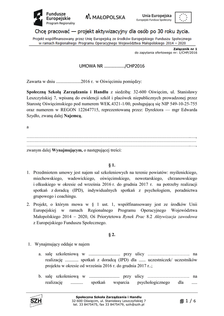Załącznik nr 1 do zapytania ofertowego nr: 1/CHP/2016 UMOWA NR .............../CHP2016 Zawarta w dniu ......................2016 r. w Oświęcimiu pomiędzy: Społeczną Szkołą Zarządzania i Handlu z siedzibą: 32-600 Oświęcim, ul. Stanisławy Leszczyńskiej 7, wpisaną do ewidencji szkół i placówek niepublicznych prowadzonej przez Starostę Oświęcimskiego pod numerem WEK.4321-1/00, posługującą się NIP 549-10-25-755 oraz numerem w REGON 122647715, reprezentowaną przez: Dyrektora — mgr Edwarda Szydło, zwaną dalej Najemcą, a ………………………………………………………………………………………………………………………………………………………………………………..……, ……………………………………………………………………………………………………………………………………………………………………………………… ………………………………………………………………………………………………………………………………………………………………………………..…… , zwanym dalej Wynajmującym, o następującej treści: § 1. 1. Przedmiotem umowy jest najem sal szkoleniowych na terenie powiatów: myślenickiego, miechowskiego, wadowickiego, oświęcimskiego, nowotarskiego, chrzanowskiego i olkuskiego w okresie od września 2016 r. do grudnia 2017 r. na potrzeby realizacji spotkań z doradcą (IPD), indywidualnych spotkań z psychologiem, poradnictwa grupowego i coachingu. 2. Projekt, o którym mowa w § 1 ust. 1, współfinansowany jest ze środków Unii Europejskiej w ramach Regionalnego Programu Operacyjnego Województwa Małopolskiego 2014 2020, Oś Priorytetowa Rynek Prac 8.2 Aktywizacja zawodowa z Europejskiego Funduszu Społecznego. § 2. 1. Wynajmujący oddaje w najem a. salę szkoleniową w ............................ przy ulicy ………………………. na realizację ............ spotkań z doradcą (IPD) dla ...... uczestniczek/ uczestników projektu w okresie od września 2016 r. do grudnia 2017 r..; b. salę szkoleniową w ........................... przy ulicy ………………………. na realizację ........... spotkań wsparcia psychologicznego dla ..... Społeczna Szkoła Zarządzania i Handlu 32-600 Oświęcim, ul. Stanisławy Leszczyńskiej 7 tel. 33 8475475, fax 33 8475479, [email protected] 1/6 Załącznik nr 1 do zapytania ofertowego nr: 1/CHP/2016 uczestniczek/uczestników projektu w okresie od września 2016 r. do grudnia 2017 r.; c. salę szkoleniową w ............................ przy ulicy ………………………. na realizację coachingu dla ..... uczestniczek/uczestników projektu w okresie od września 2016 r. do grudnia 2017 r.; d. salę szkoleniową w ............................ przy ulicy ………………………. na realizację ...................... ośmiogodzinnych zajęć poradnictwa grupowego dla ..... uczestniczek/uczestników projektu w okresie od września 2016 r. do grudnia 2017 r.. 3. Wynajmujący gwarantuje, że sala szkoleniowa do realizacji spotkań z doradca (IPD), indywidualnego wsparcia psychologicznego i coachingu spełnia następujące warunki: a. umożliwia przeprowadzenie poradnictwa indywidualnego i wsparcia psychologicznego w miejscu kameralnym, bez udziału osób trzecich oraz zbędnych zewnętrznych czynników rozpraszających spotkanie gwarantując tym samym komfort współpracy, tym samym komfort współpracy doradcy zawodowego/psychologa z uczestniczką/uczestnikiem projektu; b. posiada stół i krzesła dla jednej uczestniczki/uczestnika projektu oraz jednego doradcy zawodowego/psychologa; c. zapewnia odpowiednie oświetlenie: dostęp światła dziennego oraz oświetlenie umożliwiające swobodne i bezpieczne dla wzroku czytanie; d. umożliwia jednoczesne ustawienie i podłączenie do sieci energetycznej i bezpiecznego Internetu dwóch laptopów; e. umożliwia komfortowe korzystanie uczestniczek/uczestników projektu i trenera z zaplecza sanitarnego; f. umożliwia oznaczenie sal szkoleniowych materiałami promocyjnymi dostarczonymi przez Zamawiającego (plakaty) zgodnie z „Wytycznymi w zakresie kwalifikowania wydatków w ramach Europejskiego Funduszu Rozwoju Regionalnego, Europejskiego Funduszu Społecznego oraz Funduszu Spójności na lata 2014-2020”; g. być zlokalizowana w obiekcie, do którego zapewniony jest dojazd środkami komunikacji publicznej (odległość sal szkoleniowych od najbliższego przystanku środków komunikacji publicznej nie przekracza 300 metrów); Społeczna Szkoła Zarządzania i Handlu 32-600 Oświęcim, ul. Stanisławy Leszczyńskiej 7 tel. 33 8475475, fax 33 8475479, [email protected] 2/6 Załącznik nr 1 do zapytania ofertowego nr: 1/CHP/2016 h. inne warunki określone w obowiązujących przepisach prawa. 4. Wynajmujący gwarantuje, że sala szkoleniowa do realizacji poradnictwa grupowego spełnia następujące warunki: a. posiada stół i krzesła dla 10 uczestniczek/uczestnika. projektu oraz 1 doradcy zawodowego z możliwością ułożenia ich w kształt „U”; b. wyposażona w rzutnik, ekran, flipchart/tablica ścieralna; c. zapewnia odpowiednie oświetlenie: dostęp światła dziennego oraz oświetlenie umożliwiające swobodne i bezpieczne dla wzroku czytanie, a zarazem możliwość zaciemnienia sali podczas prezentacji multimedialnej; d. umożliwia ustawienie i podłączenie do sieci energetycznej i bezpiecznego Internetu jednego laptopa oraz projektora multimedialnego; e. umożliwia organizację przerwy obiadowej dla 10 uczestniczek/uczestników projektu i trenera oraz serwisu kawowego w sali lub bezpośrednim sąsiedztwie bez konieczności wychodzenia uczestników poza budynek, w którym realizowane jest szkolenie; f. umożliwia komfortowe korzystanie uczestniczek/uczestników projektu i trenera z zaplecza sanitarnego; g. umożliwia oznaczenie sal szkoleniowych materiałami prom