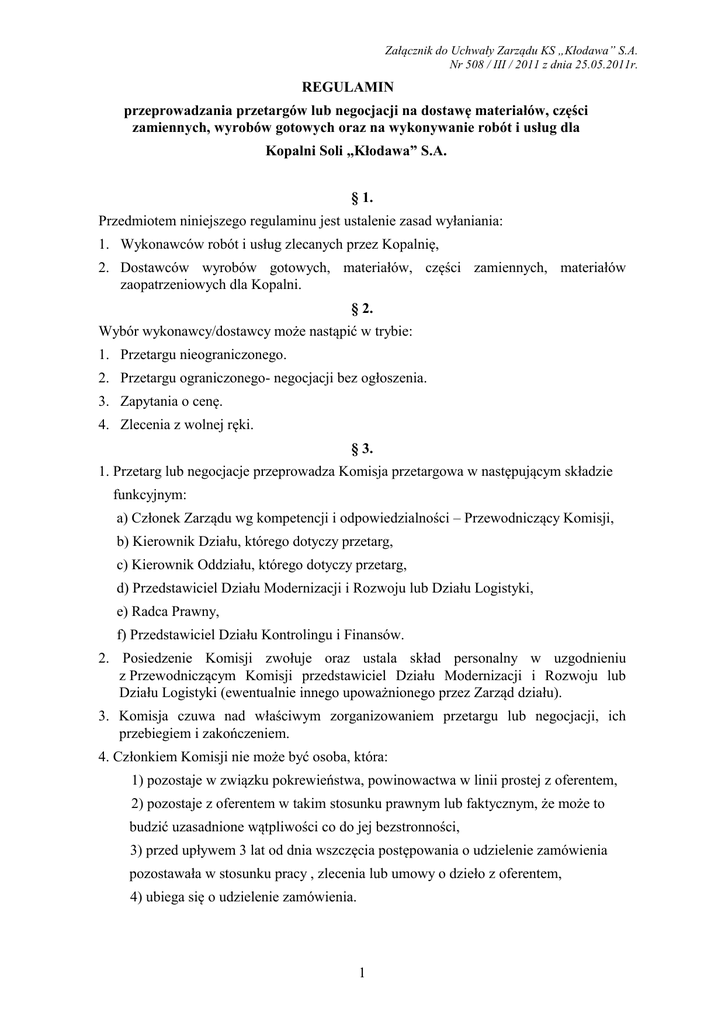 Załącznik do Uchwały Zarządu KS „Kłodawa” S.A. Nr 508 / III / 2011 z dnia 25.05.2011r. REGULAMIN przeprowadzania przetargów lub negocjacji na dostawę materiałów, części zamiennych, wyrobów gotowych oraz na wykonywanie robót i usług dla Kopalni Soli „Kłodawa” S.A. § 1. Przedmiotem niniejszego regulaminu jest ustalenie zasad wyłaniania: 1. Wykonawców robót i usług zlecanych przez Kopalnię, 2. Dostawców wyrobów gotowych, materiałów, części zamiennych, materiałów zaopatrzeniowych dla Kopalni. § 2. Wybór wykonawcy/dostawcy może nastąpić w trybie: 1. Przetargu nieograniczonego. 2. Przetargu ograniczonego- negocjacji bez ogłoszenia. 3. Zapytania o cenę. 4. Zlecenia z wolnej ręki. § 3. 1. Przetarg lub negocjacje przeprowadza Komisja przetargowa w następującym składzie funkcyjnym: a) Członek Zarządu wg kompetencji i odpowiedzialności – Przewodniczący Komisji, b) Kierownik Działu, którego dotyczy przetarg, c) Kierownik Oddziału, którego dotyczy przetarg, d) Przedstawiciel Działu Modernizacji i Rozwoju lub Działu Logistyki, e) Radca Prawny, f) Przedstawiciel Działu Kontrolingu i Finansów. 2. Posiedzenie Komisji zwołuje oraz ustala skład personalny w uzgodnieniu z Przewodniczącym Komisji przedstawiciel Działu Modernizacji i Rozwoju lub Działu Logistyki (ewentualnie innego upoważnionego przez Zarząd działu). 3. Komisja czuwa nad właściwym zorganizowaniem przetargu lub negocjacji, ich przebiegiem i zakończeniem. 4. Członkiem Komisji nie może być osoba, która: 1) pozostaje w związku pokrewieństwa, powinowactwa w linii prostej z oferentem, 2) pozostaje z oferentem w takim stosunku prawnym lub faktycznym, że może to budzić uzasadnione wątpliwości co do jej bezstronności, 3) przed upływem 3 lat od dnia wszczęcia postępowania o udzielenie zamówienia pozostawała w stosunku pracy , zlecenia lub umowy o dzieło z oferentem, 4) ubiega się o udzielenie zamówienia. 1 Załącznik do Uchwały Zarządu KS „Kłodawa” S.A. Nr 508 / III / 2011 z dnia 25.05.2011r. 5. Członkowie Komisji są zobowiązani do złożenia w treści protokołu z przetargu pisemnego oświadczenia o braku lub istnieniu okoliczności powodujących wykluczenie ze składu Komisji. ZASADY PRZEPROWADZANIA PRZETARGU NIEOGRANICZONEGO § 4. 1.Wszczęcie procedury przetargu nieograniczonego wymaga decyzji Zarządu w formie uchwały. Do wniosku o wszczęcie przetargu powinien być załączony projekt założeń do specyfikacji istotnych warunków zamówienia. 2. Przetarg nieograniczony poprzedza się ogłoszeniem na stronie internetowej Kopalni na co najmniej 2 tygodnie przed terminem przetargu oraz informacją w prasie o zasięgu minimum regionalnym. 3. W ogłoszeniu należy podać: 1) nazwę i siedzibę Zamawiającego, 2) przedmiot przetargu (zakres robót lub dostawy), 3) miejsce i termin składania ofert, 4) miejsce i termin, w którym można zapoznać się ze specyfikacją istotnych warunków zamówienia i ewentualną dokumentacją projektową (oraz adres strony internetowej, na której będzie publikowana specyfikacja), 5) miejsce i termin otwarcia ofert, 6) zastrzeżenie, że Zamawiającemu przysługuje prawo do zmiany treści ogłoszenia lub warunków przetargu oraz do odstąpienia od przetargu przed otwarciem ofert, 7) zastrzeżenie, że Zamawiającemu przysługuje prawo swobodnego wyboru oferty lub zamknięcia przetargu bez wybrania którejkolwiek z ofert. 4. W specyfikacji istotnych warunków zamówienia należy: 1) uściślić przedmiot przetargu, 2) podać termin dostawy lub wykonania usługi, 3) wskazać, czy dopuszcza się składanie ofert częściowych, 4) wskazać, że oferta powinna zawierać warunki finansowe ze wszystkimi składnikami, 5) określić okres związania ofertą, z tym, że minimalny okres związania ofertą powinien rozpoczynać się w dniu wskazanym jako termin otwarcia ofert a kończyć się nie wcześniej niż w dniu wyznaczonym na zawarcie umowy, 6) określić inne specjalne warunki dla dostawy lub usługi, 7) wskazać osobę upoważnioną do udzielania informacji w sprawie przetargu, 8) wskazać rodzaj wymaganych zaświadczeń, zezwoleń i uprawnień koniecznych dla wykonania przedmiotu przetargu, 9) wskazać, że wybrany oferent jest zobowiązany w ciągu 5 dni od otrzymania umowy odesłać Zamawiającemu umowę podpisaną przez osoby, które upoważnione są do zawierania umów w imieniu oferenta, 10) zamieścić informacje o wysokości ewentualnego wadium lub zabezpieczeniu należytego wykonania dostawy lub usługi oraz wysokości ewentualnych gwarancji należytego wykonania zobowiązań gwarancyjnych, 11) wskazać, że materiałów przesłanych przez oferentów w związku z przetargiem Zamawiający nie zwraca, 12) zobowiązać oferentów, aby swoje oferty składali w zaklejonej kopercie z napisem „przetarg nieograniczony na (…)”, 13) wskazać , które kryteria będą stosowane przy ocenie ofert i jaka jest ranga każdego z kryteriów, tak aby i suma była równa 100% , 2 Załącznik do Uchwały Zarządu KS „Kłodawa” S.A. Nr 508 / III / 2011 z dnia 25.05.2011r. 14) przedstawić wzór umowy, która zostanie podpisana po rozstrzygnięciu przetargu. 5. Specyfikacja istotnych warunków zamówienia powinna zostać opracowana i podpisana przez członków komisji przetargowej. Założenia techniczne do specyfikacji składa dział wnioskujący o wszczęcie procedury przetargowej. 6. Specyfikacja jest udostępniona oferentom na stronie internetowej Kopalni lub w formie papierowej za odpłatnością. § 5. 1. Oferent przystępując do przetargu składa pisemną ofertę, która powinna zawierać: 1) aktualny odpis z właściwego rejestru albo aktualne zaświadczenie o wpisie do ewidencji działalności gospodarczej, wystawione nie wcześniej niż 3 miesiące przed upływem terminu składania ofert, 2) koncesje, zezwolenia lub licencje, jeżeli przepisy nakładają obowiązek posiadania koncesji, zezwolenia lub licencj