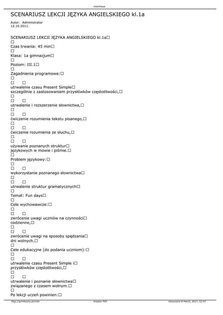 InterKlasa SCENARIUSZ LEKCJI JĘZYKA ANGIELSKIEGO kl.1a Autor: Administrator 12.10.2011. SCENARIUSZ LEKCJI JĘZYKA ANGIELSKIEGO kl.1a Czas trwania: 45 min Klasa: 1a gimnazjum Poziom: III.1 Zagadnienia programowe: · utrwalenie czasu Present Simple szczególnie z zastosowaniem przysłówków częstotliwości, · utrwalenie i rozszerzenie słownictwa, · ćwiczenie rozumienia tekstu pisanego, · ćwiczenie rozumienia ze słuchu, · używanie poznanych struktur językowych w mowie i piśmie. Problem językowy: · wykorzystanie poznanego słownictwa · utrwalenie struktur gramatycznych Temat: Fun days Cele wychowawcze: · zwrócenie uwagi uczniów na czynności codzienne, · zwrócenie uwagi na sposoby spędzania dni wolnych. Cele edukacyjne (do podania uczniom): · utrwalenie czasu Present Simple i przysłówków częstotliwości, · utrwalenie i poznanie słownictwa związanego z czasem wolnym. Po lekcji uczeń powinien: http://gim4tychy.pl/inter Kreator PDF Utworzono 8 March, 2017, 02:47 InterKlasa znać (zapamiętać) rozumieć umieć - miejsce przysłówków częstotliwości w zdaniu, - zasady stosowania czasu Present Simple, - zasady pisowni wielkich liter w j. ang. - tekst czytany i pisany, - nowe słownictwo - mówić i pisać o swoim czasie wolnym z poprawnym zastosowaniem przysłówków częstotliwości w czasie Present Simple, - posługiwać się nowym słownictwem. Przebieg lekcji: 1. Poinformowanie uczniów o zaplanowanym przebiegu lekcji, podanie tematu lekcji oraz jej celów, sprawdzenie obecności. 2. Sprawdzenie, czy uczniowie odrobili zadanie domowe. 3. Przepytanie kilku osób ze słówek z 2 poprzednich lekcji. 4. Wspólne sprawdzenie poprawności zadania domowego przy użyciu tablicy interaktywnej. 5. Wspólne wykonanie ćwiczenia Listening comprehension str. 15 w podręczniku na tablicy interaktywnej. 6. Reading comprehension uczniowie patrząc na obrazki przewidują, co bohaterka tekstu robi zwykle w niedziele, następnie słuchają i czytają tekst, wspólnie podsumowujemy, czy przewidywania były poprawne (tablica interaktywna). 7. W zeszycie uczniowie w tabelce wg zad. 2 str.16 uzupełniają zwykłe czynności Amy o różnych porach dnia sprawdzamy na tablicy interaktywnej. 8. Ustnie streszczają tekst na podstawie własnych tabelek. 9. Zad. 3 str.16 jeden z uczniów czyta zasady używania wielkich liter w j. ang, po czym każdy indywidualnie wykonuje ćwiczenie sprawdzamy z tablicą. http://gim4tychy.pl/inter Kreator PDF Utworzono 8 March, 2017, 02:47 InterKlasa 10. Uczniowie wykonują tabelę o swoich zwykłych zajęciach w swoim ulubionym dniu. 11. Zad. dom. uczniowie piszą o swoim ulubionym dniu i przysyłają mi prace mailem podać adres! na przyszły wtorek, a na następną lekcję - zadania w ćwiczeniach 1b i 1c. http://gim4tychy.pl/inter Kreator PDF Utworzono 8 March, 2017, 02:47