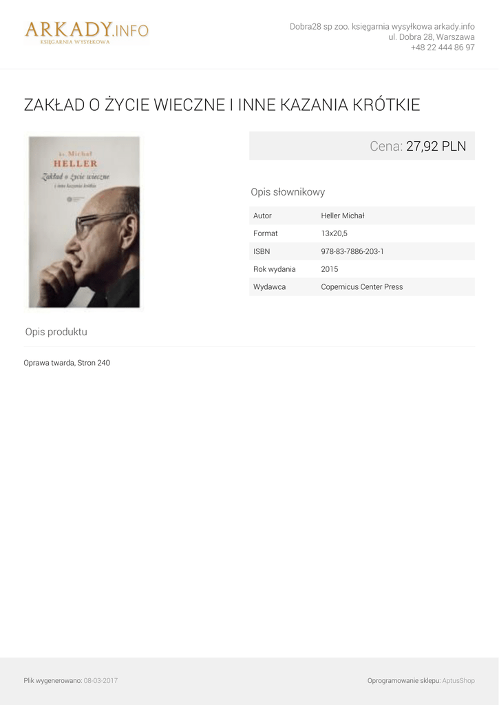 Dobra28 sp zoo. księgarnia wysyłkowa arkady.info ul. Dobra 28, Warszawa +48 22 444 86 97 ZAKŁAD O ŻYCIE WIECZNE I INNE KAZANIA KRÓTKIE Cena: 27,92 PLN Opis słownikowy Autor Heller Michał Format 13x20,5 ISBN 978-83-7886-203-1 Rok wydania 2015 Wydawca Copernicus Center Press Opis produktu Oprawa twarda, Stron 240 Plik wygenerowano: 08-03-2017 Powered by TCPDF (www.tcpdf.org) Oprogramowanie sklepu: AptusShop