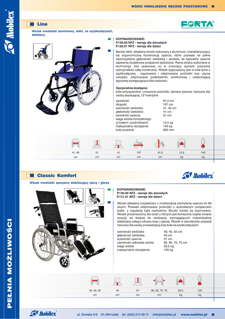 WÓZKI INWALIDZKIE RĘCZNE PODSTAWOWE Line Wózek inwalidzki aluminiowy, lekki, na szybkozłączach, składany. DOFINANSOWANIE: P.129.00 NFZ - wersja dla dorosłych P.129.01 NFZ - wersja dla dzieci Bardzo lekki, składany wózek wykonany z aluminium, charakteryzujący się ergonomiczną konstrukcją oparcia, które pozwala na pełne wykorzystanie głębokości siedziska i sprawia, że tapicerka oparcia zapewnia dodatkowe podparcie lędźwiowe. Rama wózka wykonana w technologii bez spawowej co w znaczący sposób poprawia wytrzymałość całej konstrukcji. Wózek wyposażony jest w koła tylne z szybkozłączką , regulowane i zdejmowane podnóżki bez użycia narzędzi, zdejmowane podłokietniki, komfortową i oddychającą tapicerkę występującą w kilku kolorach. Opcjonalnie dostępne: koła antywywrotne, unoszone podnóżki, łamane oparcie, hamulce dla osoby asystującej, 12" koła tylne 91,5 cm 107 cm 41, 45 cm 41 cm 51 cm wysokość długość szerokość siedziska głębokość siedziska wysokość oparcia waga wózka kompletnego (z kołami i podnóżkami) maksymalne obciążenie koła przednie 12,5 kg 140 kg 200 mm 41, 45 51 41 107 91,5 12,5 140 cm cm cm cm cm kg kg Classic Komfort Wózek inwalidzki specjalny stabilizujący plecy i głowę PEŁNIA MOŻLIWOŚCI DOFINANSOWANIE: P.130.00 NFZ - wersja dla dorosłych P.131.01 NFZ - wersja dla dzieci Wózek składany krzyżakowo z możliwością odchylenia oparcia do 90 stopni. Posiada zdejmowane podnóżki z wyściełanym podparciem łydek, z regulacją kąta nachylenia. Boczki wózka są wyjmowane. Wózek przeznaczony dla osób u których jest konieczna częsta zmiana pozycji od leżącej do siedzącej, wymagających indywidualnej stabilizacji całego tułowia wraz z głową. Wózek w standardzie posiada hamulce dla osoby prowadzącej oraz koła na szybkozłączach. szerokość siedziska głębokosć siedziska wysokość oparcia szerokość całkowita wózka waga wózka maksymalne obciążenie 40, 45, 50 cm 40 cm 57 cm 60, 65, 70, 75 cm 25,5 kg 125 kg 40, 45, 50 40 57 60, 65, 70, 75 25,5 125 cm cm cm cm kg kg ul. Duńska 3/5 91-204 Łódź tel. (042) 214 29 11 [email protected] www.mobilex.pl
