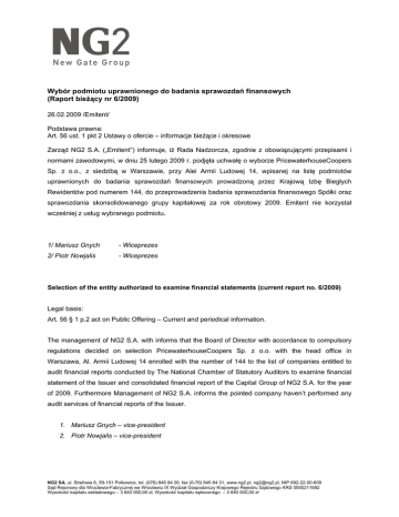 Wybór podmiotu uprawnionego do badania sprawozdań finansowych (Raport bieżący nr 6/2009) 26.02.2009 /Emitent/ Podstawa prawna: Art. 56 ust. 1 pkt 2 Ustawy o ofercie – informacje bieżące i okresowe Zarząd NG2 S.A. („Emitent”) informuje, iż Rada Nadzorcza, zgodnie z obowiązującymi przepisami i normami zawodowymi, w dniu 25 lutego 2009 r. podjęła uchwałę o wyborze PricewaterhouseCoopers Sp. z o.o., z siedzibą w Warszawie, przy Alei Armii Ludowej 14, wpisanej na listę podmiotów uprawnionych do badania sprawozdań finansowych prowadzoną przez Krajową Izbę Biegłych Rewidentów pod numerem 144, do przeprowadzenia badania sprawozdania finansowego Spółki oraz sprawozdania skonsolidowanego grupy kapitałowej za rok obrotowy 2009. Emitent nie korzystał wcześniej z usług wybranego podmiotu. 1/ Mariusz Gnych - Wiceprezes 2/ Piotr Nowjalis - Wiceprezes Selection of the entity authorized to examine financial statements (current report no. 6/2009) Legal basis: Art. 56 § 1 p.2 act on Public Offering – Current and periodical information. The management of NG2 S.A. with informs that the Board of Director with accordance to compulsory regulations decided on selection PricewaterhouseCoopers Sp. z o.o. with the head office in Warszawa, Al. Armii Ludowej 14 enrolled with the number of 144 to the list of companies entitled to audit financial reports conducted by The National Chamber of Statutory Auditors to examine financial statement of the Issuer and consolidated financial report of the Capital Group of NG2 S.A. for the year of 2009. Furthermore Management of NG2 S.A. informs the pointed company haven’t performed any audit services of financial reports of the Issuer. 1. Mariusz Gnych – vice-president 2. Piotr Nowjalis – vice-president NG2 SA, ul. Strefowa 6, 59-101 Polkowice, tel. (076) 845 84 00, fax (0-76) 845 84 31, www.ng2.pl, [email protected], NIP 692-22-00-609 Sąd Rejonowy dla Wrocławia-Fabrycznej we Wrocławiu IX Wydział Gospodarczy Krajowego Rejestru Sądowego KRS 0000211692 Wysokość kapitału zakładowego – 3 840 000,00 zł, Wysokość kapitału wpłaconego – 3 840 000,00 zł